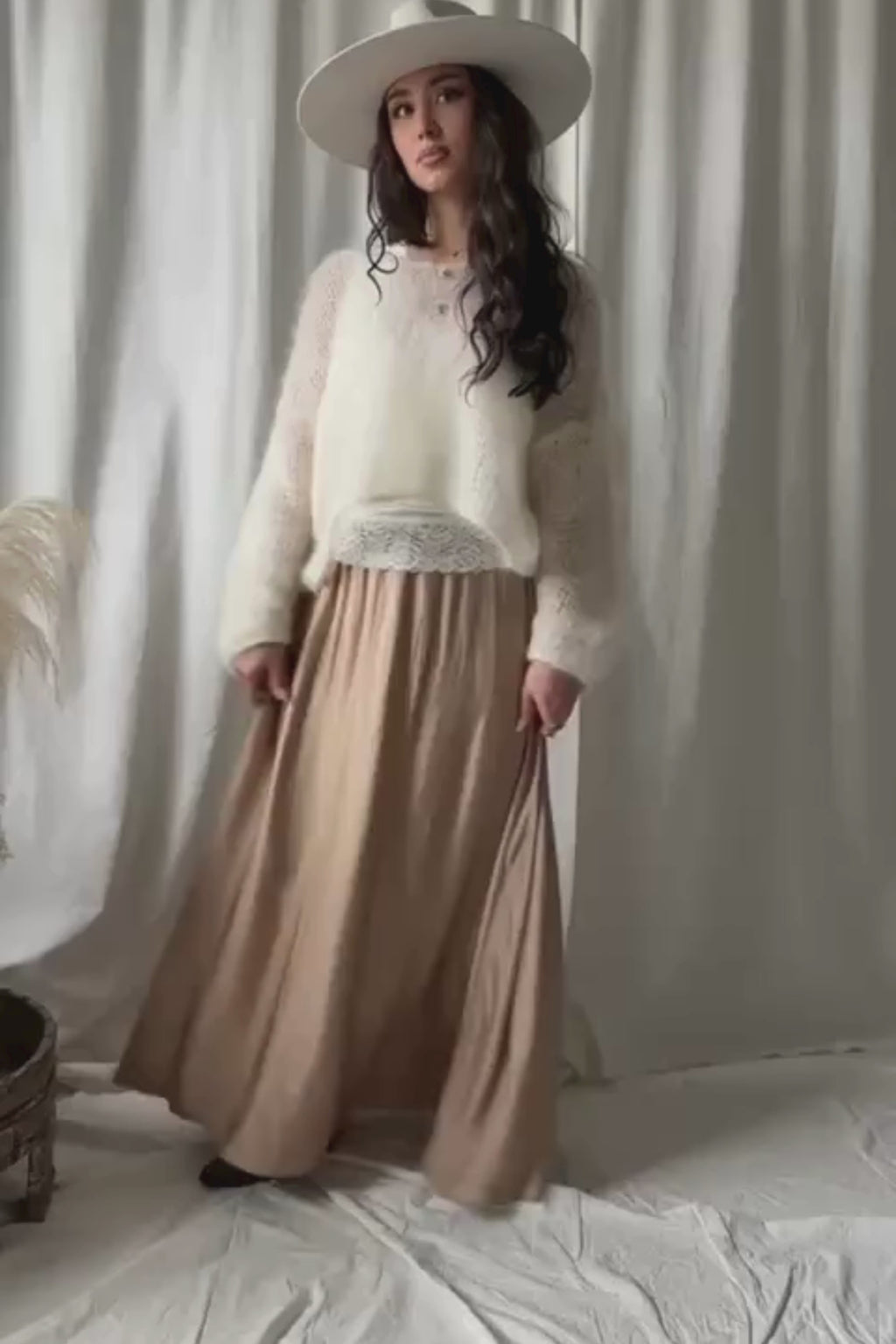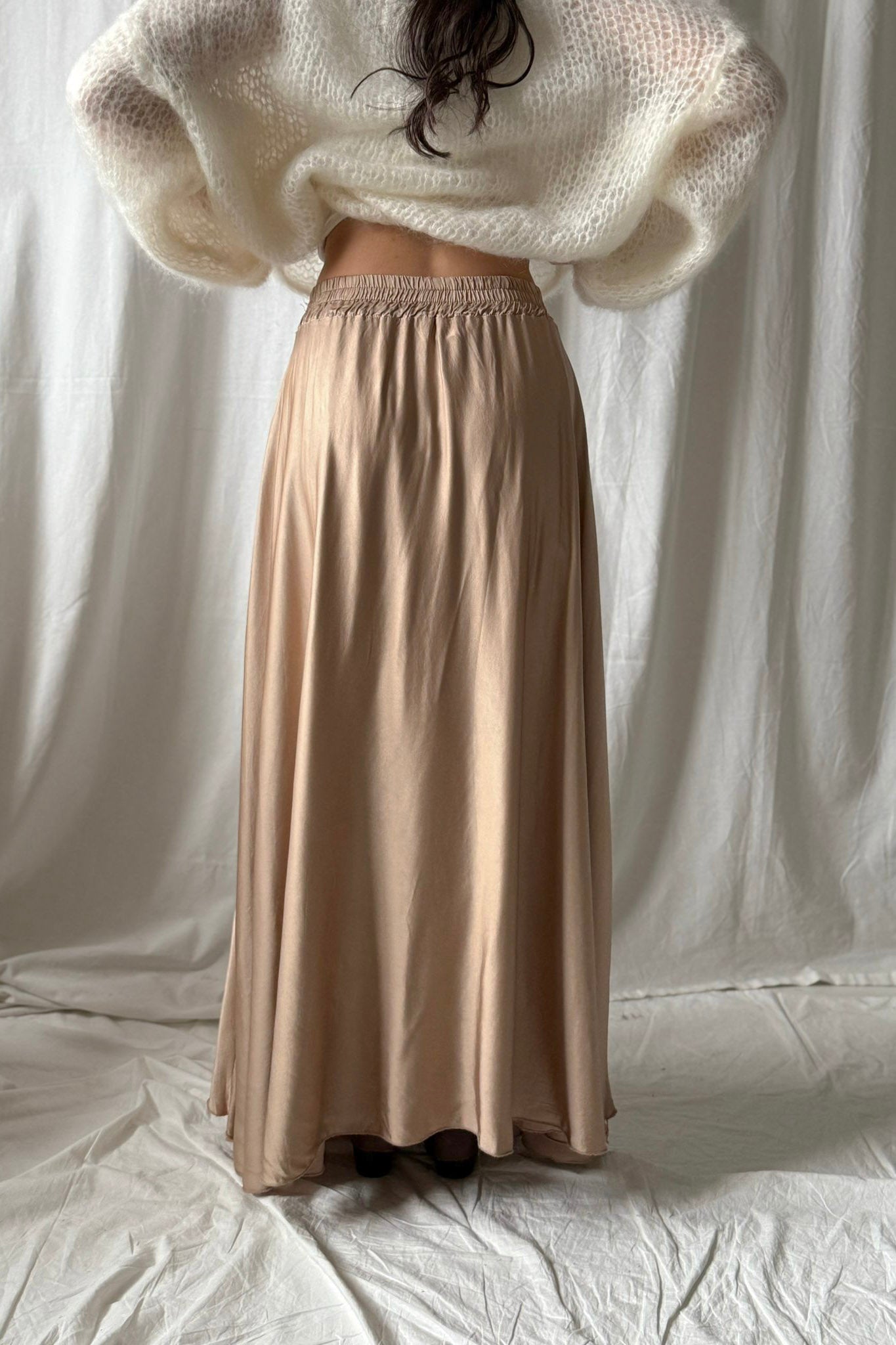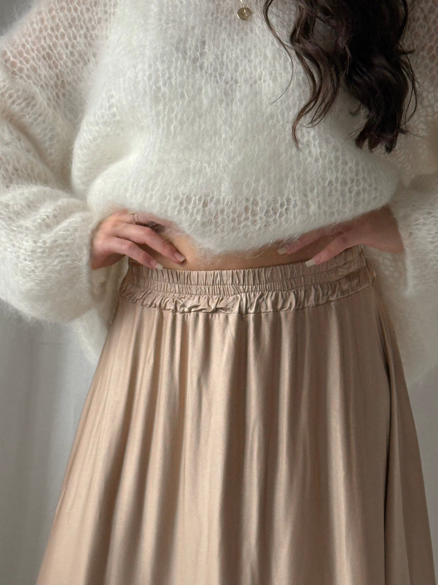Upeasti laskeutuva satiinihame tarjoaa sekä mukavuutta että tyylikkyyttä. Hameessa on kaunis satiinin hohto, joka tuo hameeseen eleganttia ilmettä, ja pitkä helma liikkuu kauniisti kävellessä. Hameen yläosassa on joustava vyötäröresori, joka varmistaa täydellisen istuvuuden. Sopii täydellisesti niin arkeen, kuin juhlaan.