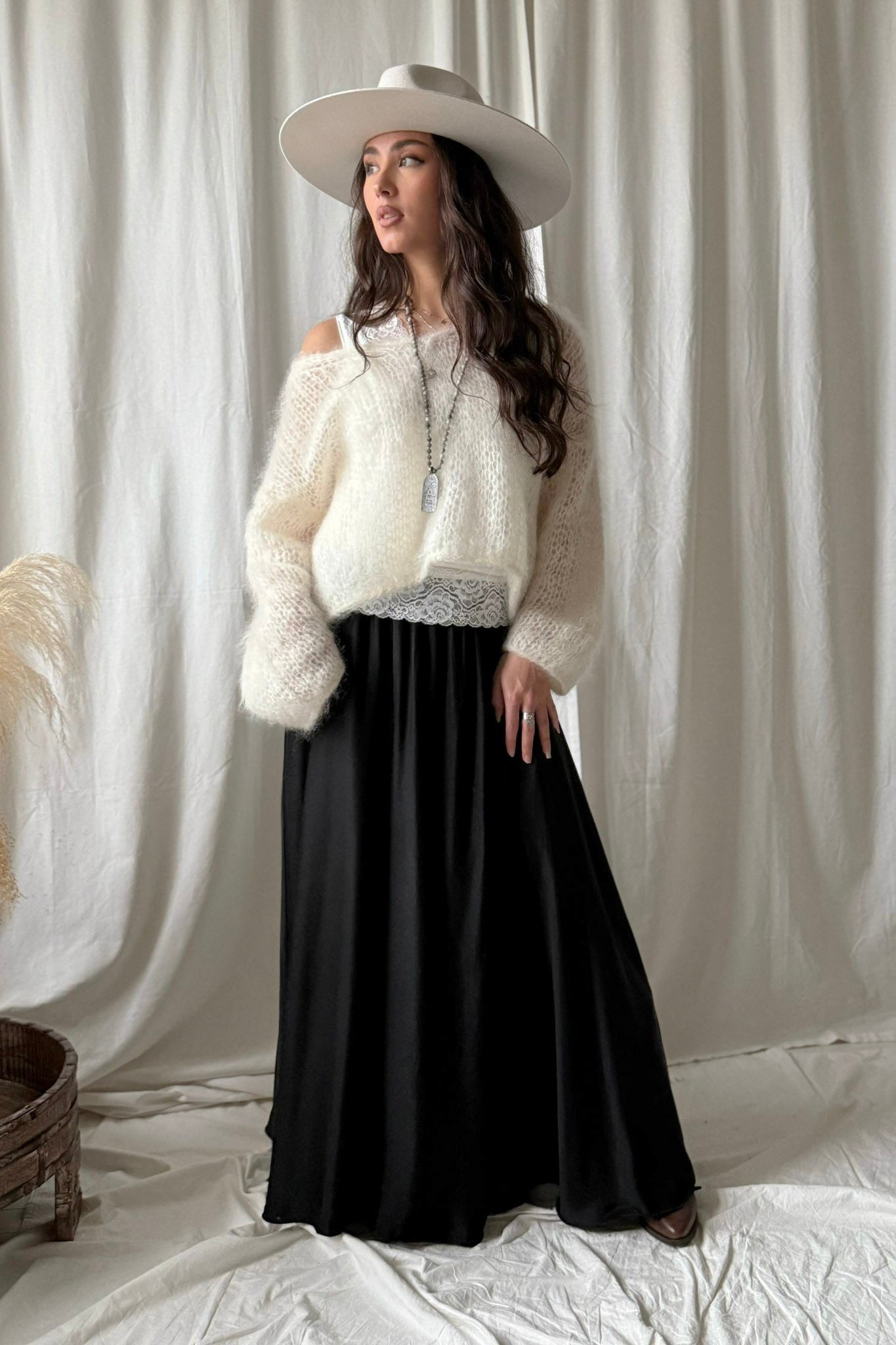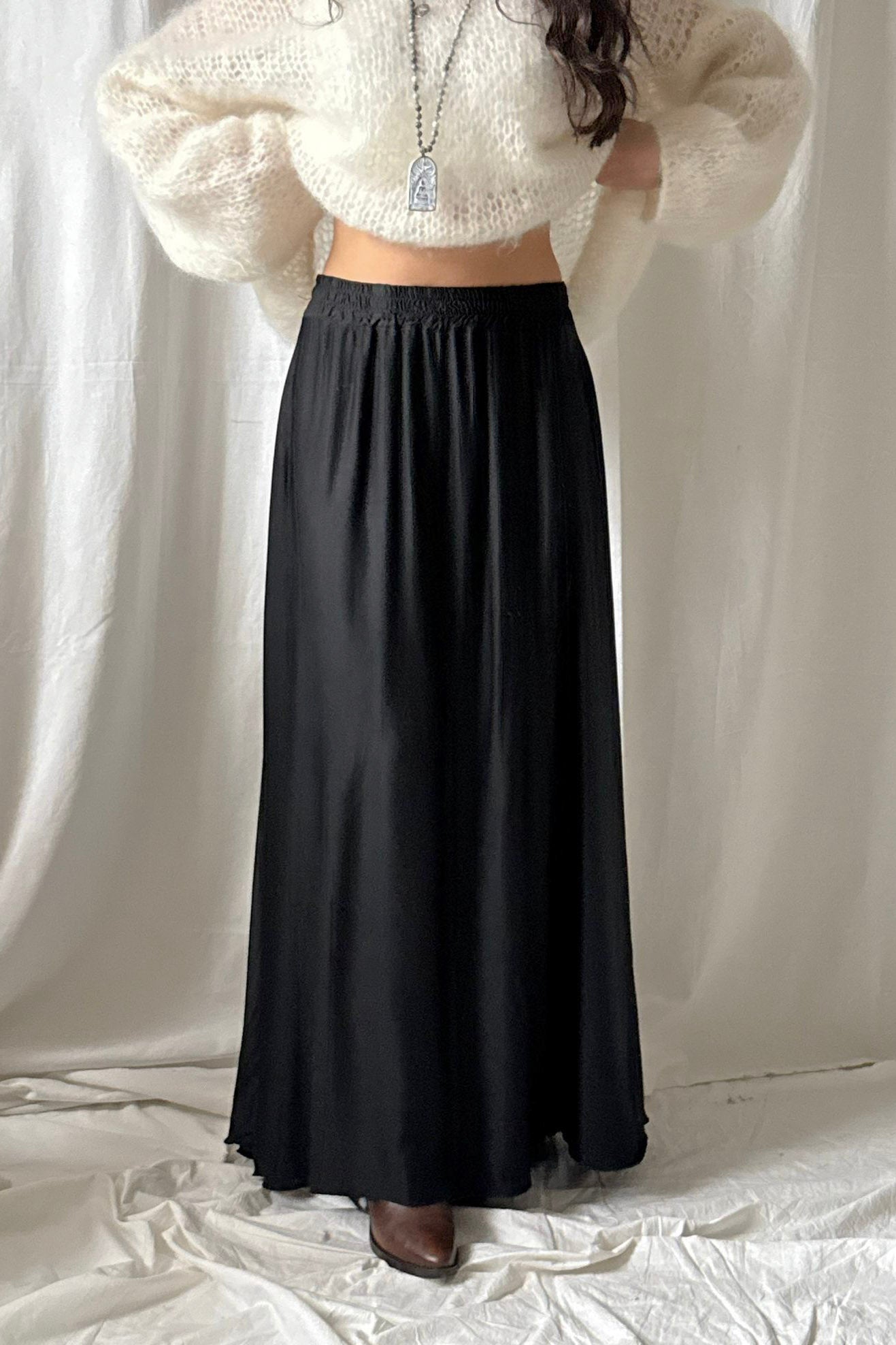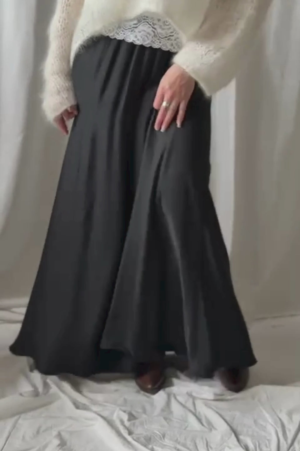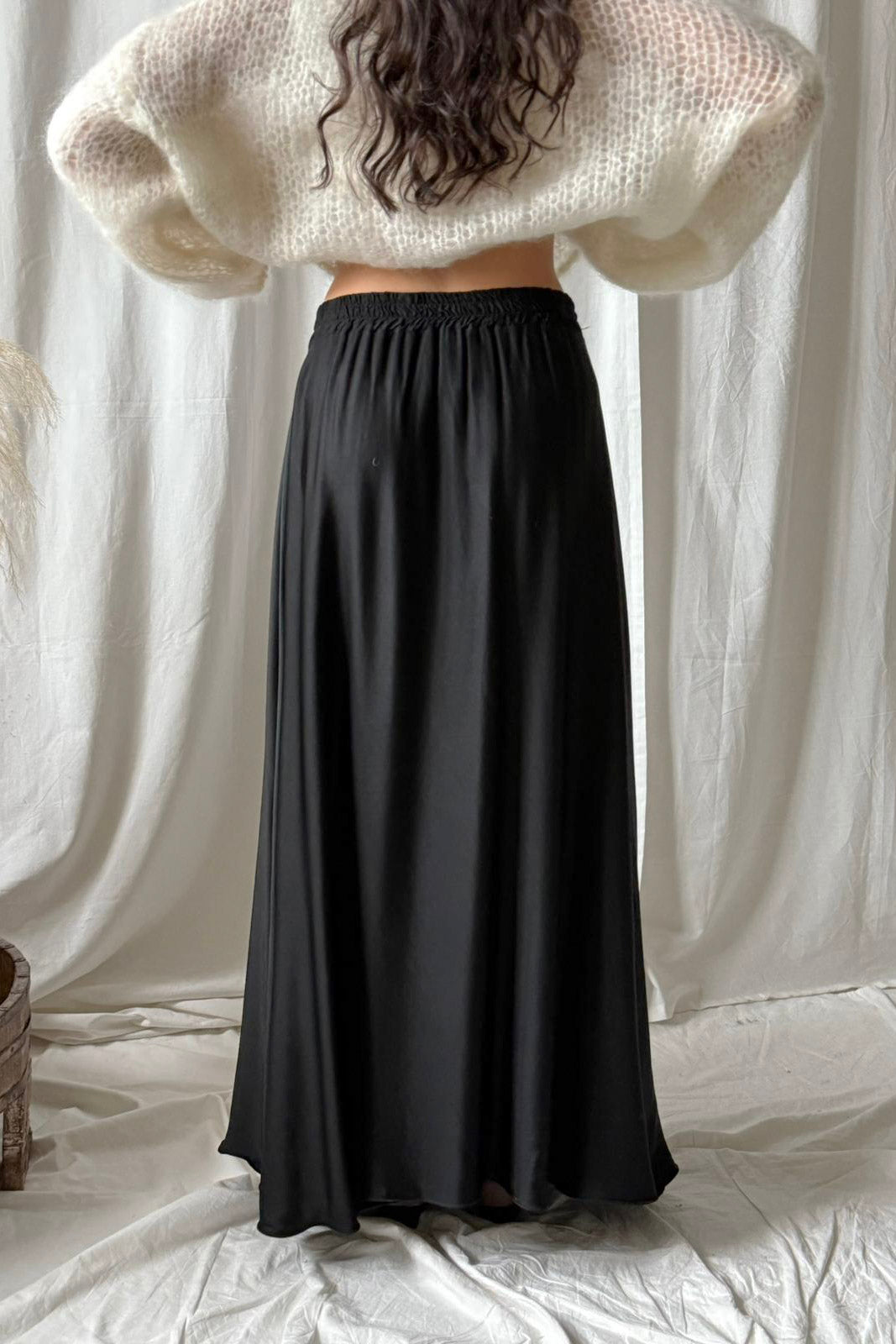 Upeasti laskeutuva satiinihame tarjoaa sekä mukavuutta että tyylikkyyttä. Hameessa on kaunis satiinin hohto, joka tuo hameeseen eleganttia ilmettä, ja pitkä helma liikkuu kauniisti kävellessä. Hameen yläosassa on joustava vyötäröresori, joka varmistaa täydellisen istuvuuden. Sopii täydellisesti niin arkeen, kuin juhlaan.