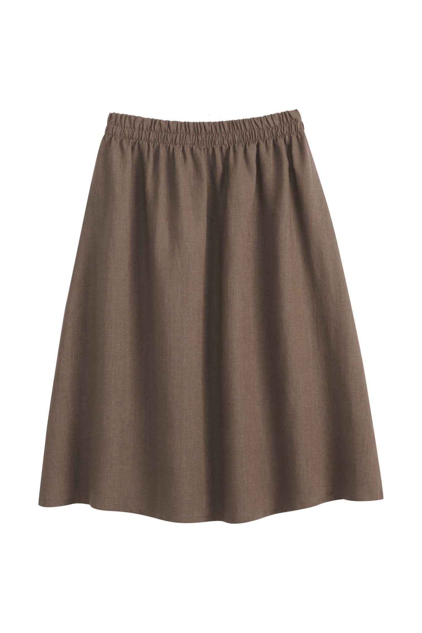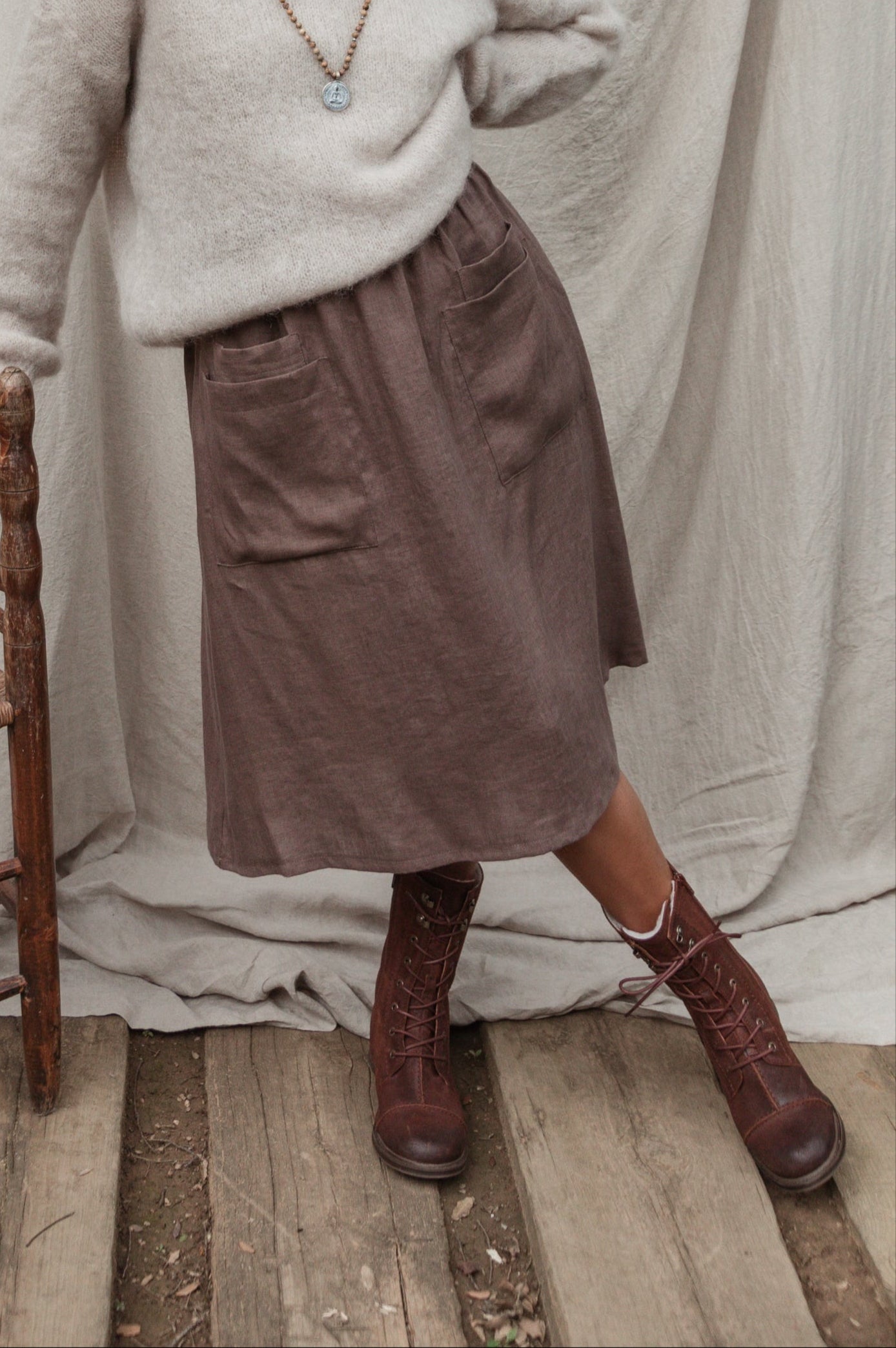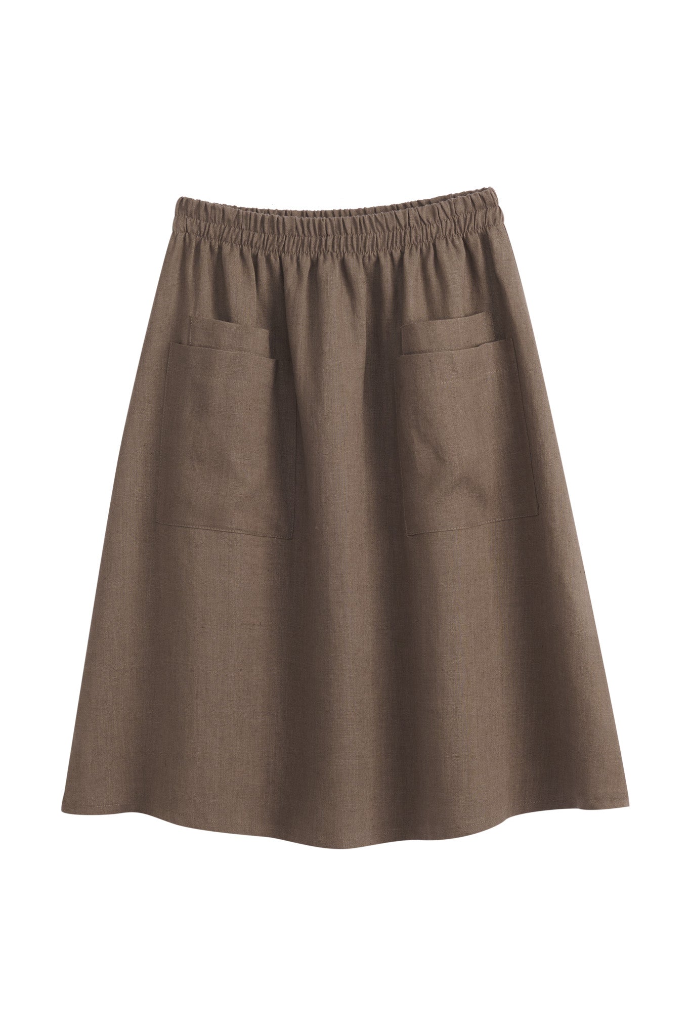 Kaunis A-linjainen pellavahame etutaskuilla. Etutaskut on ommeltu kahteen kerrokseen. Vyötärössä kuminauha.