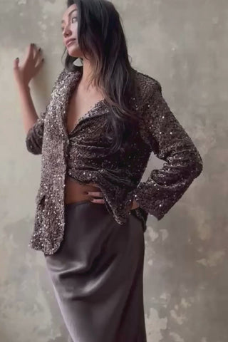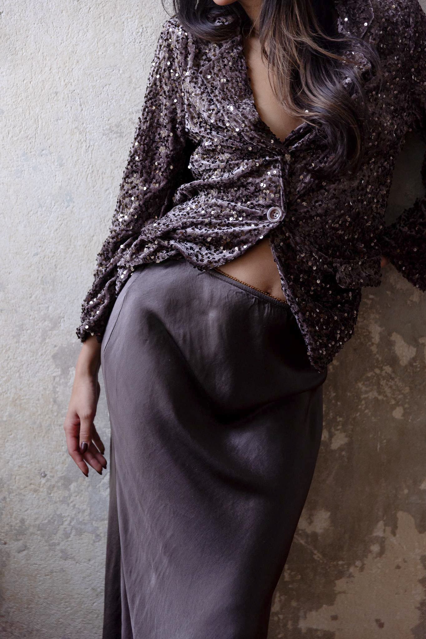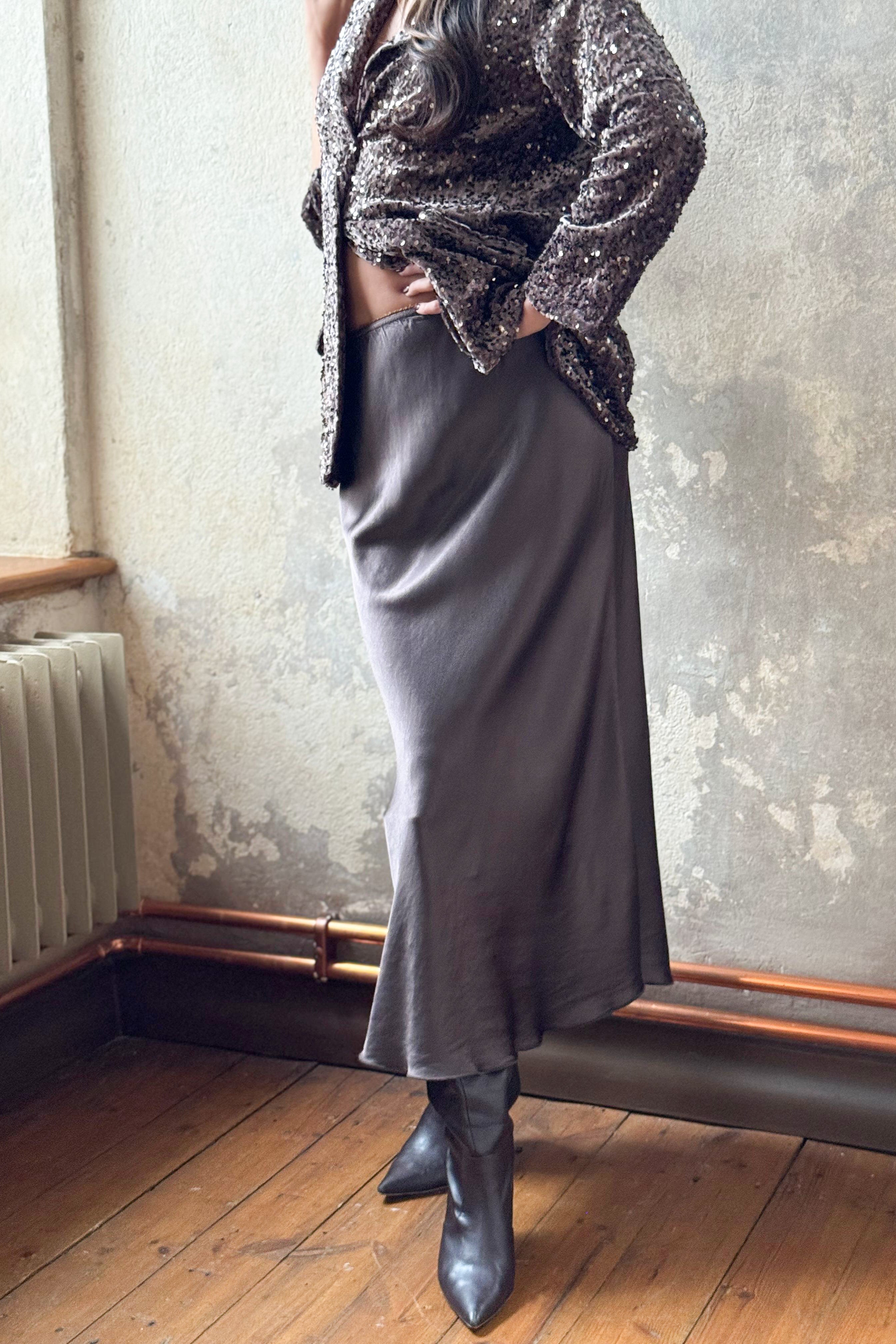 Naisellinen, hohtavapintainen viskoosihame joustovyötäröllä. Kevyesti A-linjainen malli.
