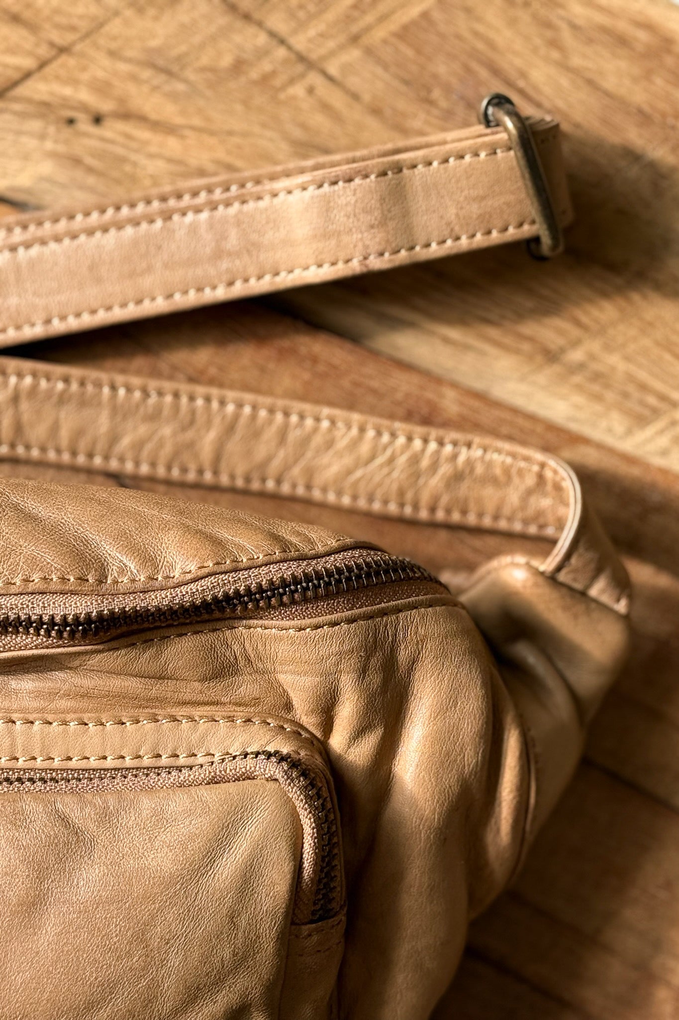 Rinnan yli trendikkäästi puettava vyölaukku. Laukku on laadukasta, pehmeää nahkaa. Vetoketjutasku edessä, säädettävä olkahihna. Sisäpuolella vuori ja sisätasku, jonne menevät turvallisesti vaikkapa maksukortit ja avaimet. Edessä on vielä kätevä pikkutasku.