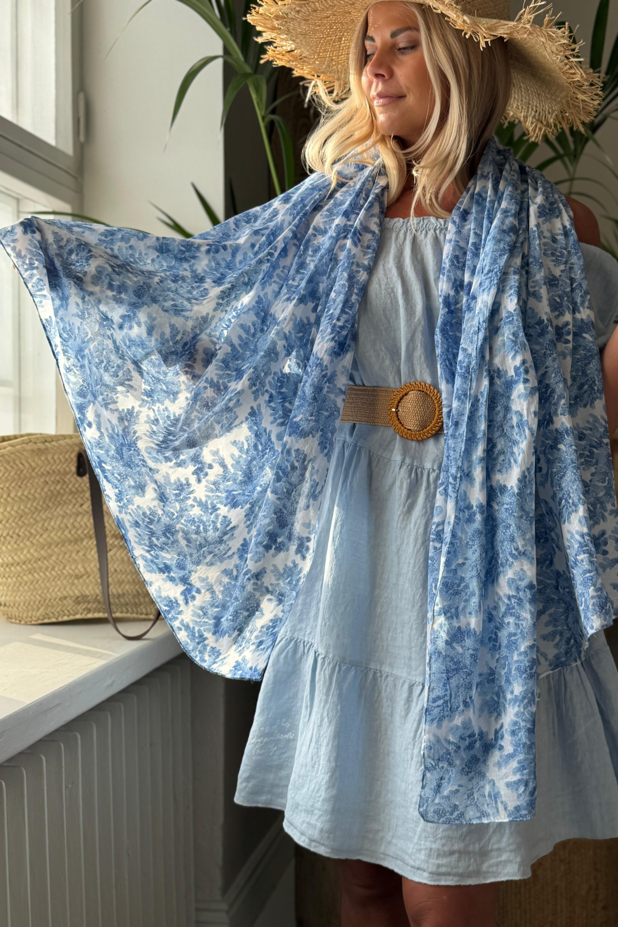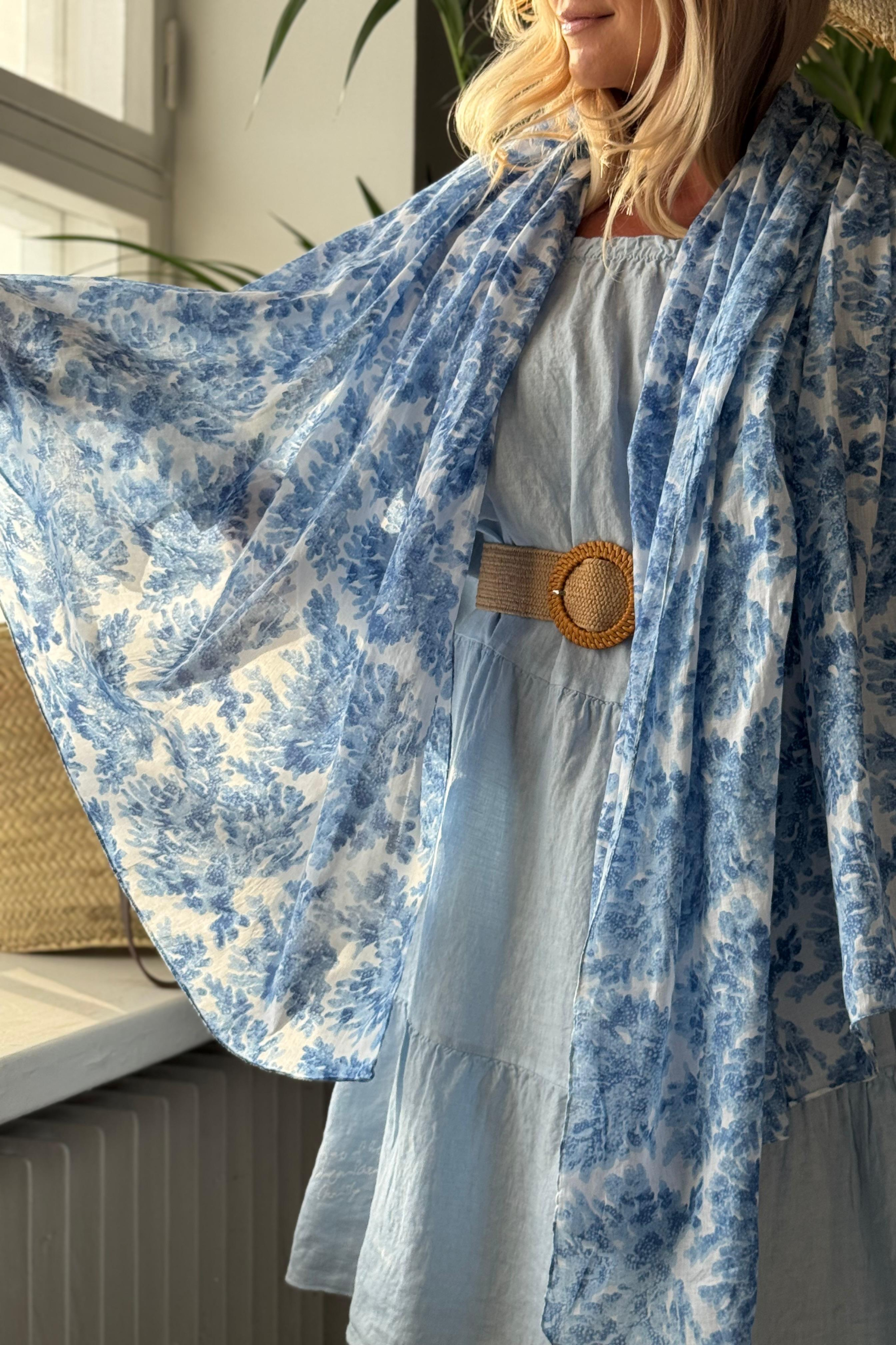 Kevyt puuvillahuivi kauniin sinisessä sävyssä.