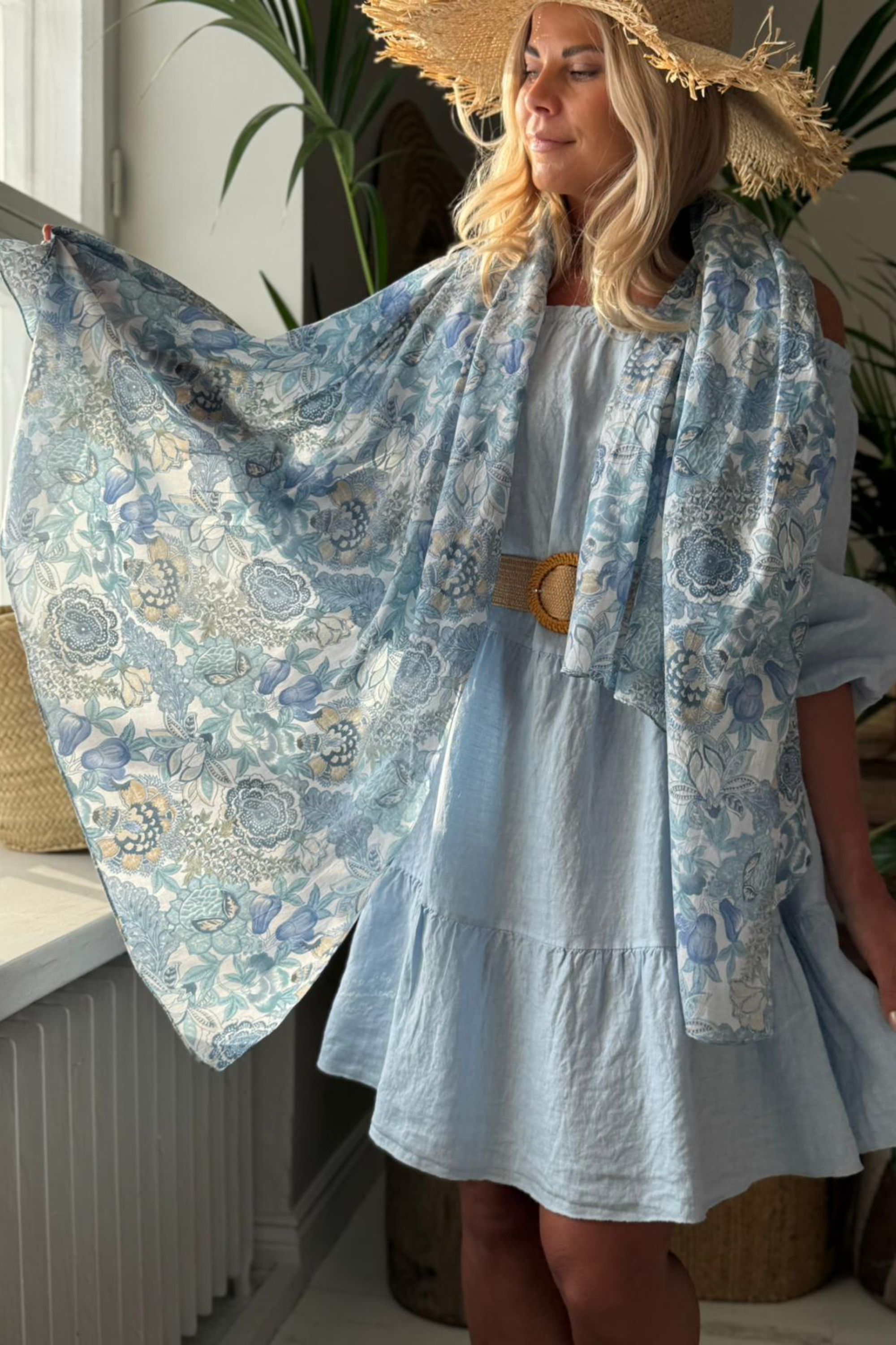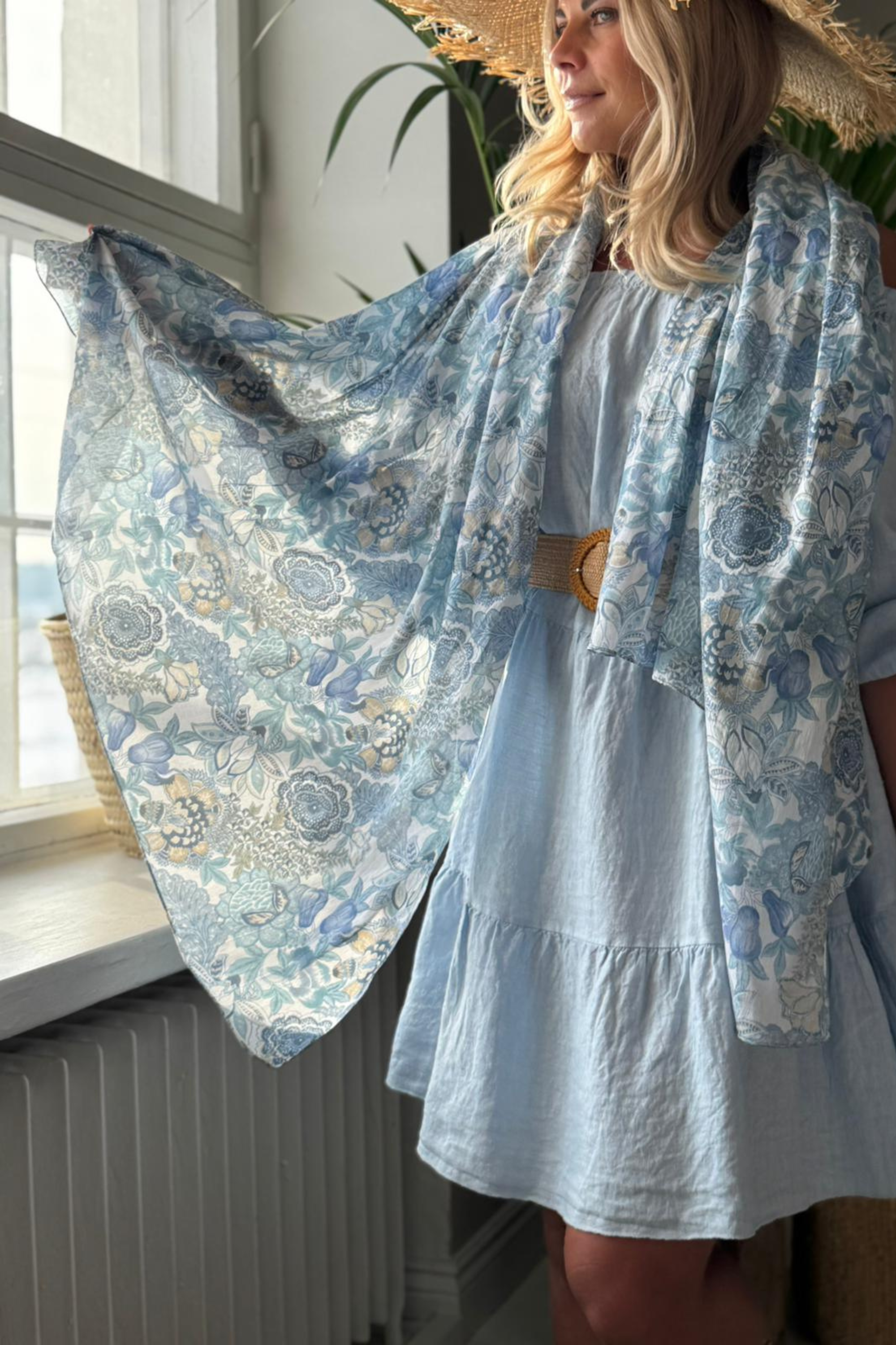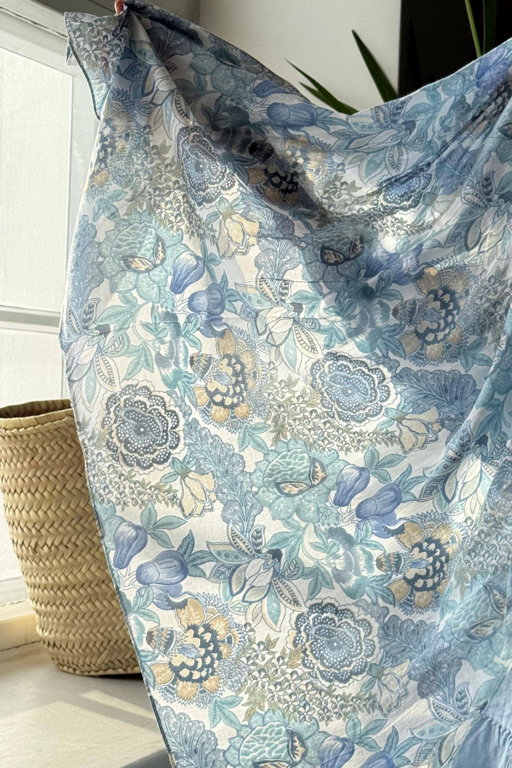 Kevyt sileäpintainen puuvillahuivi kauniin sinisessä sävyssä.
