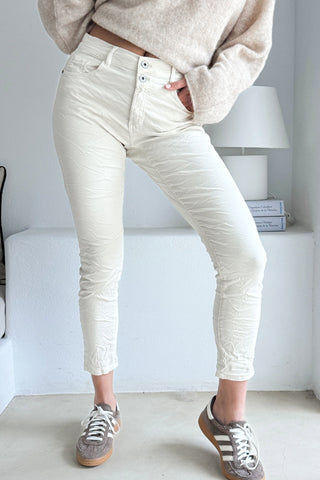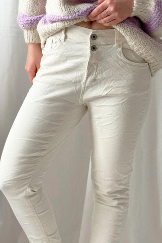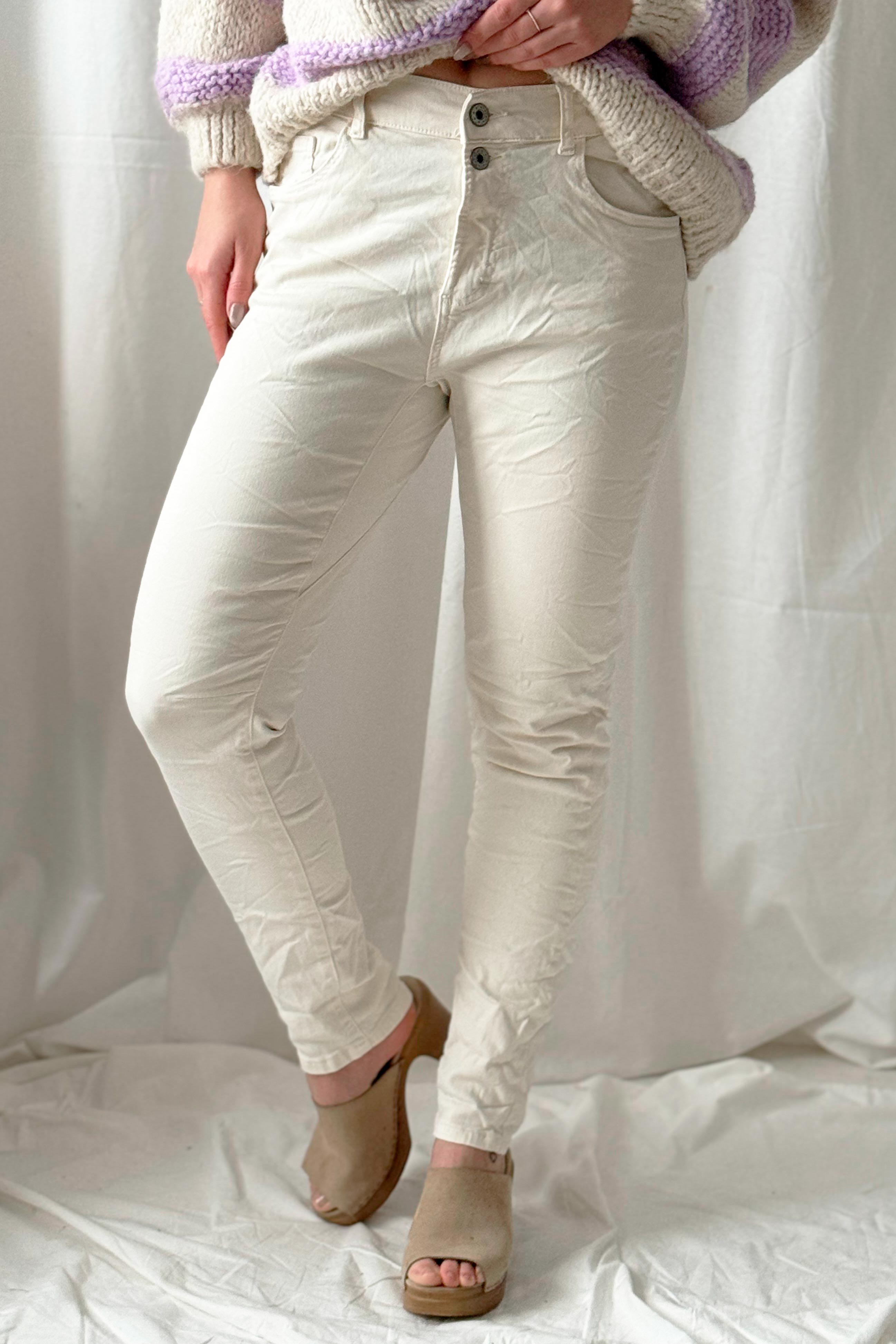 Todelliset must-have farkut! Rento Boyfriend-malli, pehmeää ja hyvin joustavaa stretch-materiaalia. Käännetyt lahkeet ja kuminauhavyötärö takana. Joustavan materiaalin ja puolikorkean vyötärön ansiosta todella miellyttävät housut päällä.