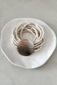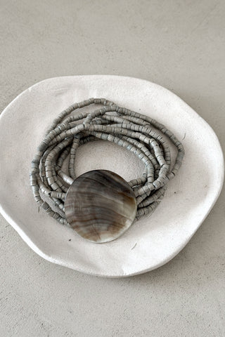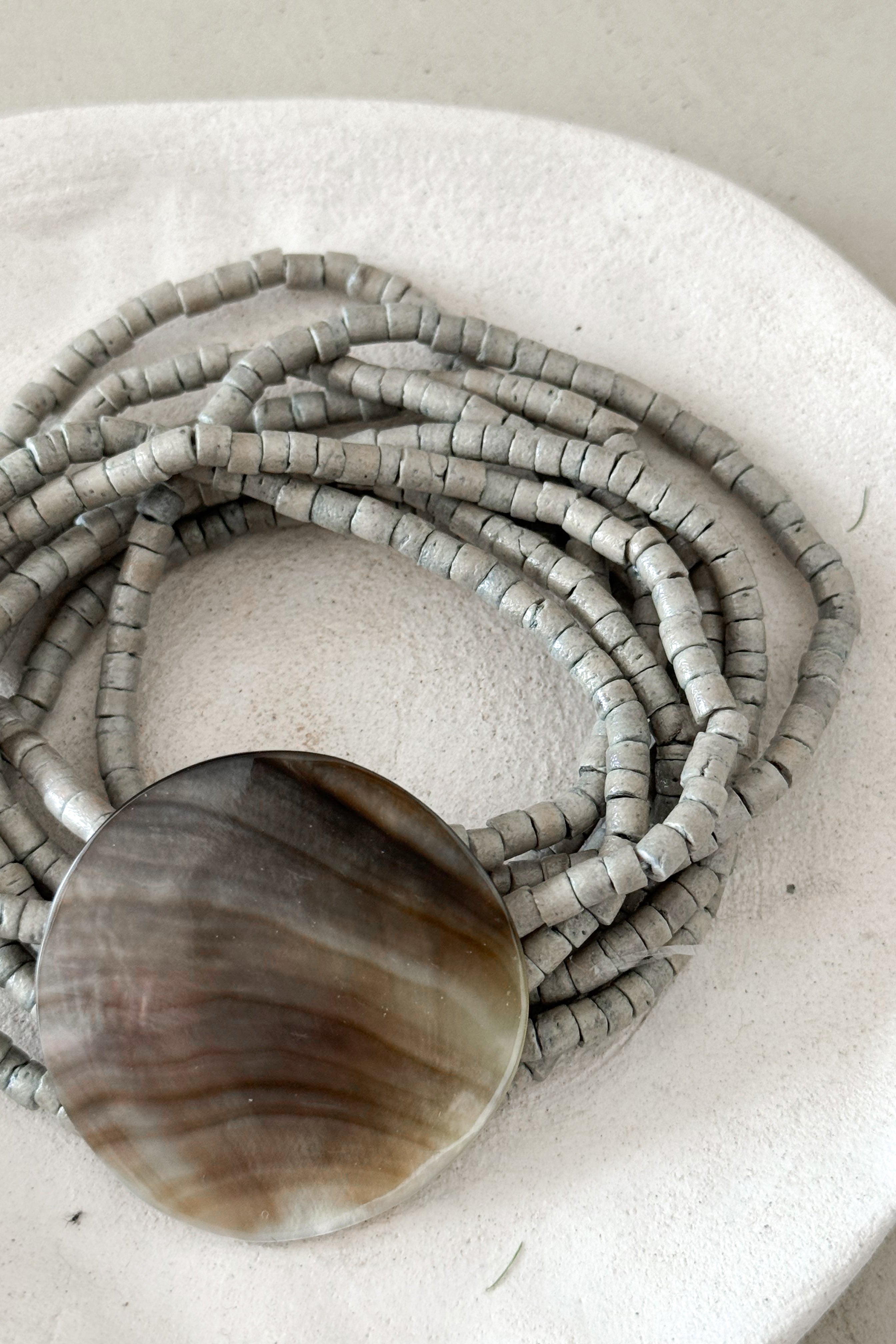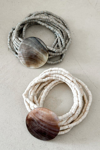 Tämä tyylikäs rannekoru yhdistää luonnonmateriaalien pehmeyden ja ajattoman muotoilun. Monikerroksiset helminauhat luovat näyttävän kokonaisuuden, jota koristaa keskellä upea simpukankuorikiekko.