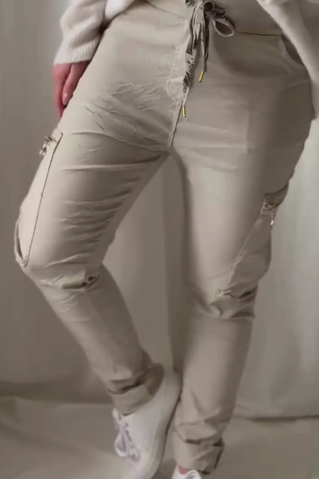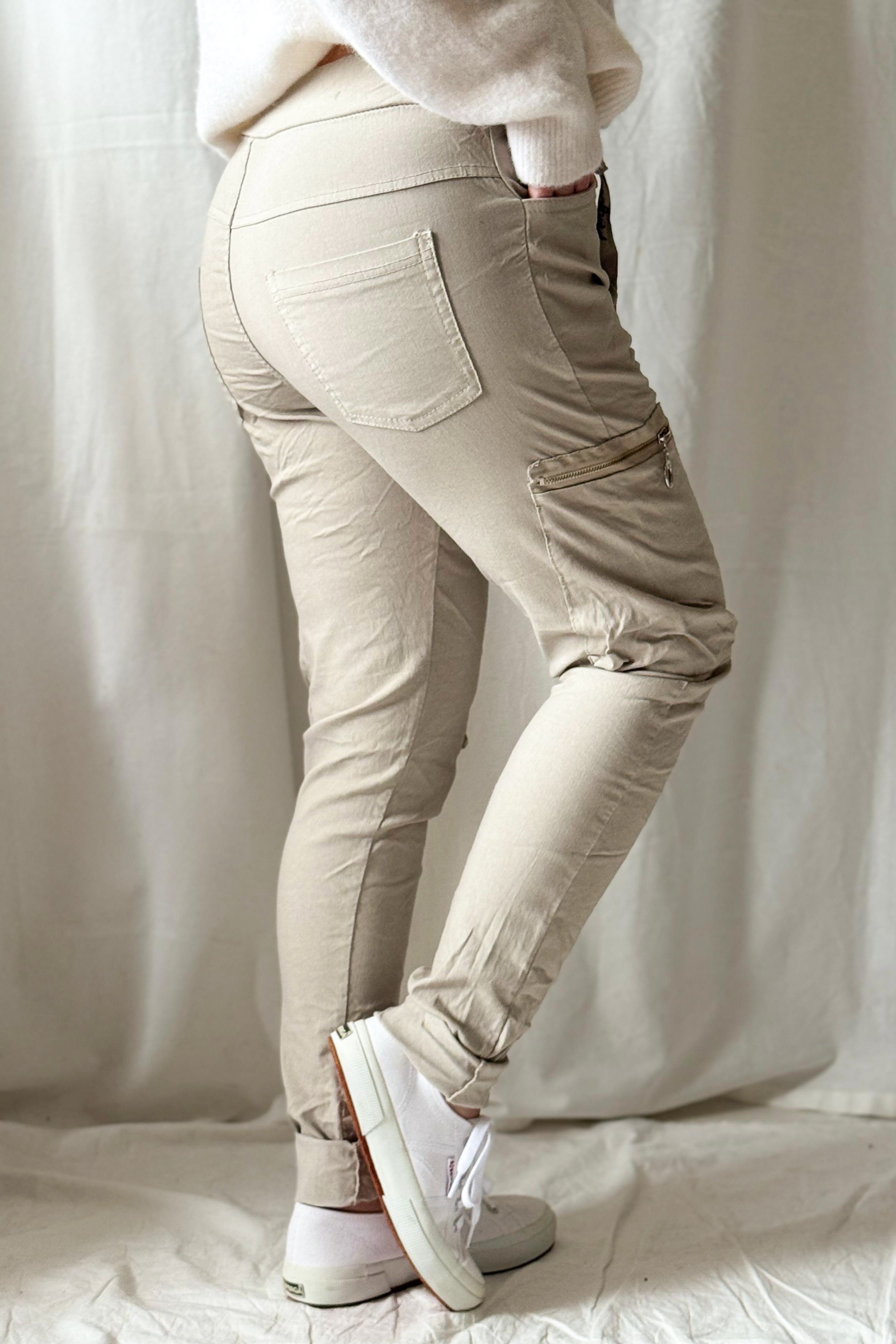 Joustavat ja mukavat joggerit, jotka istuvat kaikille vartalotyypeille. Korkeahko vyötärö, jossa kiristysnyörit. Pull on malli, ei nappeja eikä kinnaavia vetoketjuja. Reisitaskut joissa somisteena vetoketjut. Sopii myös pitkäsäärisille, käärittävät lahkeet. Materiaali bengalinea.