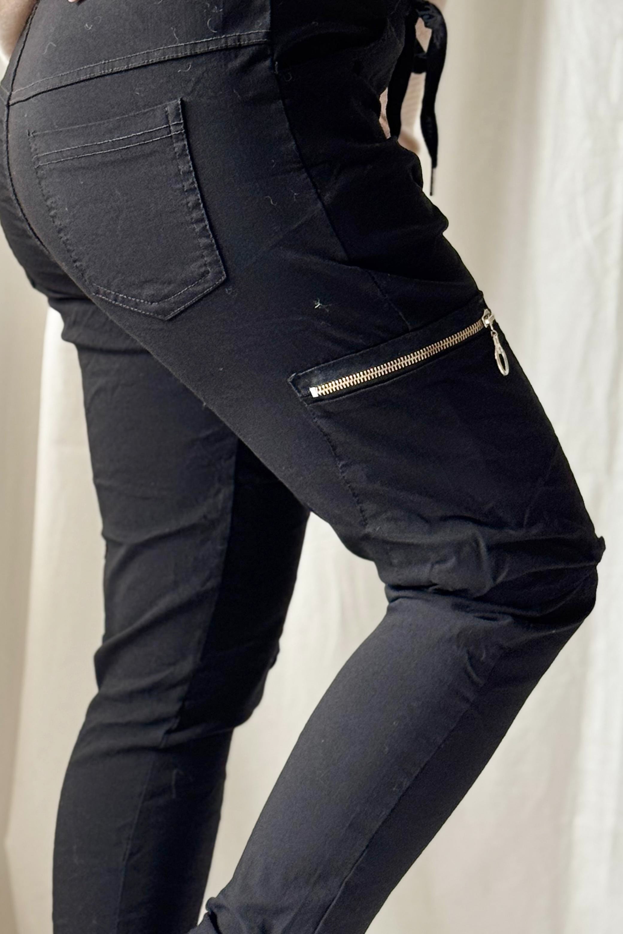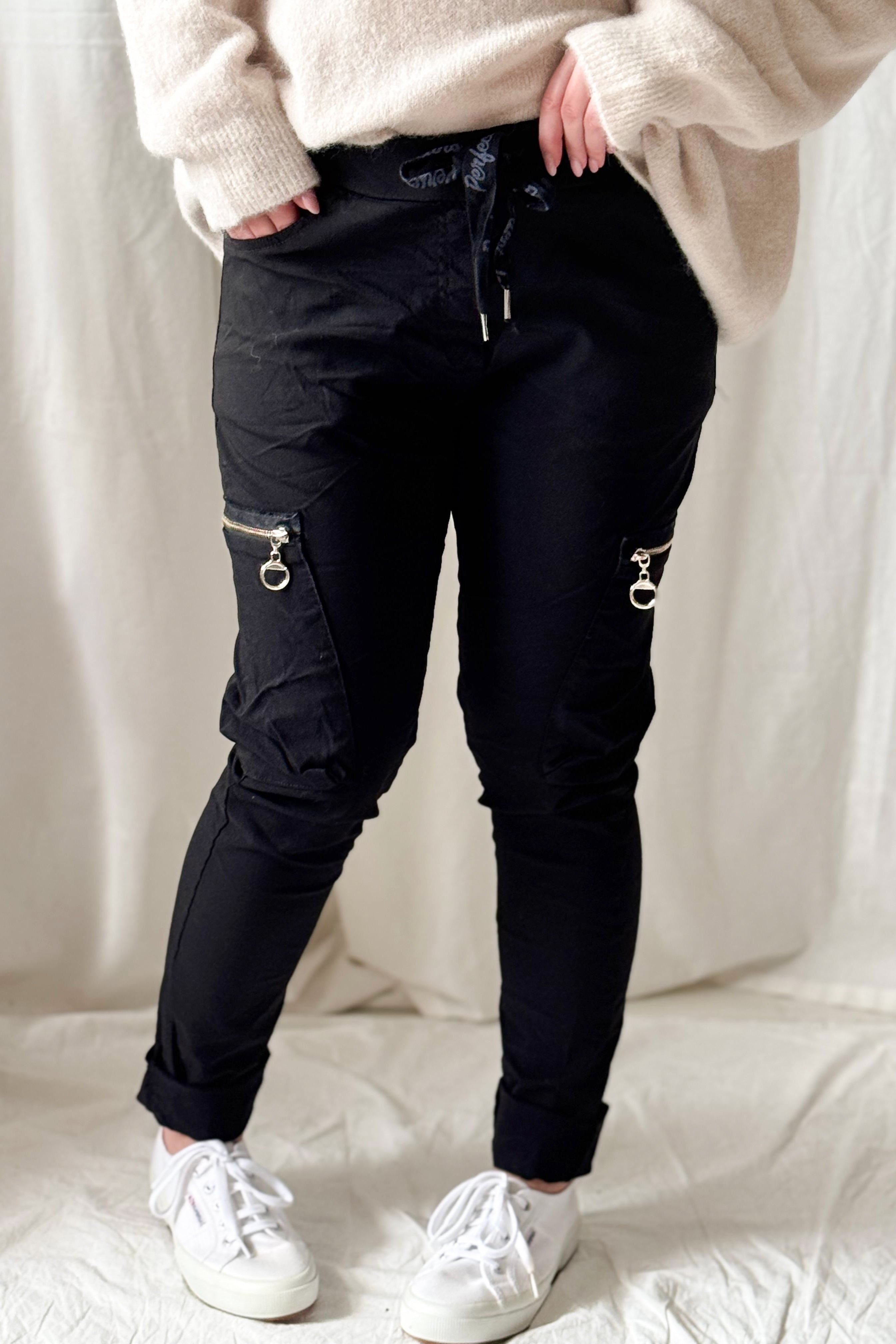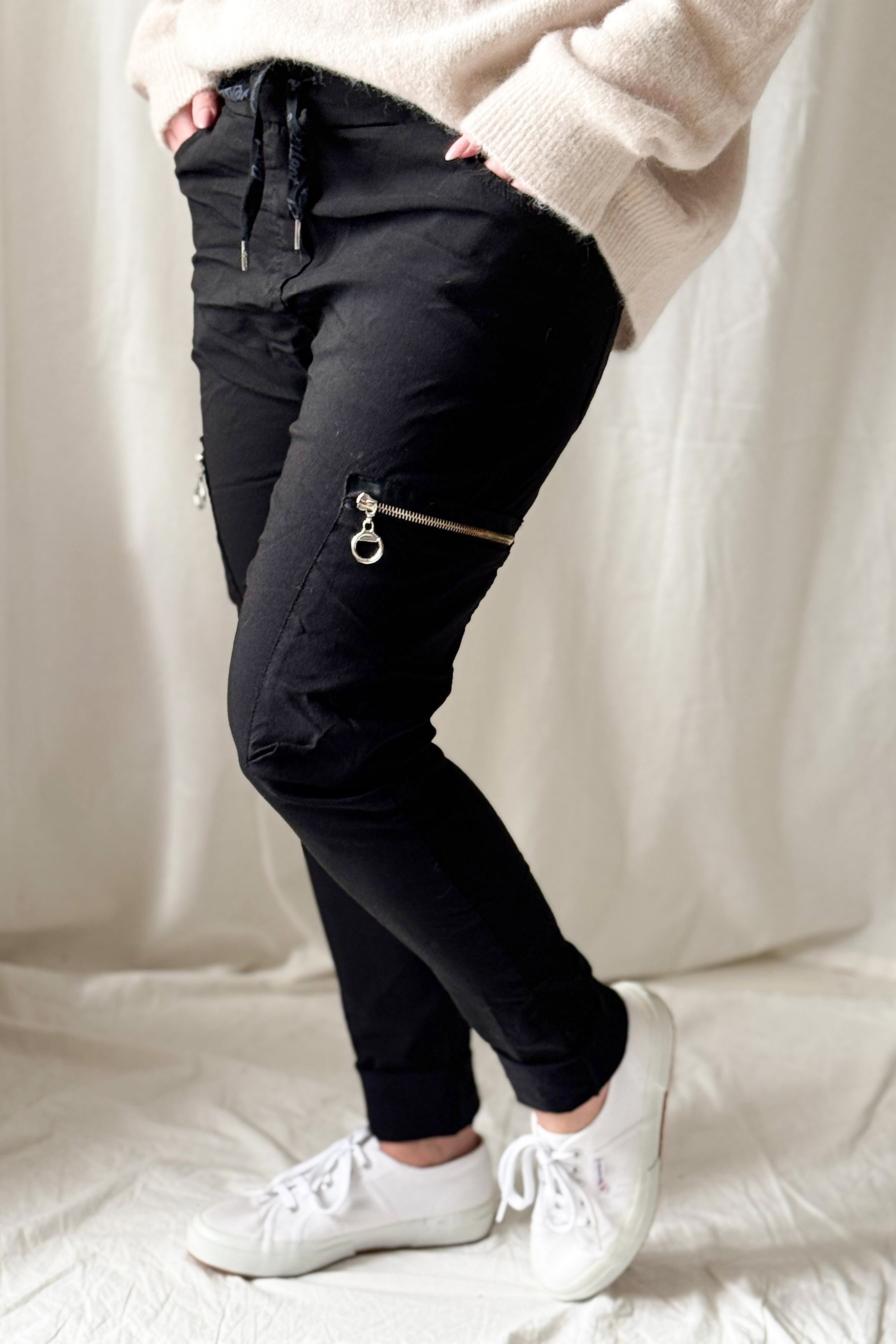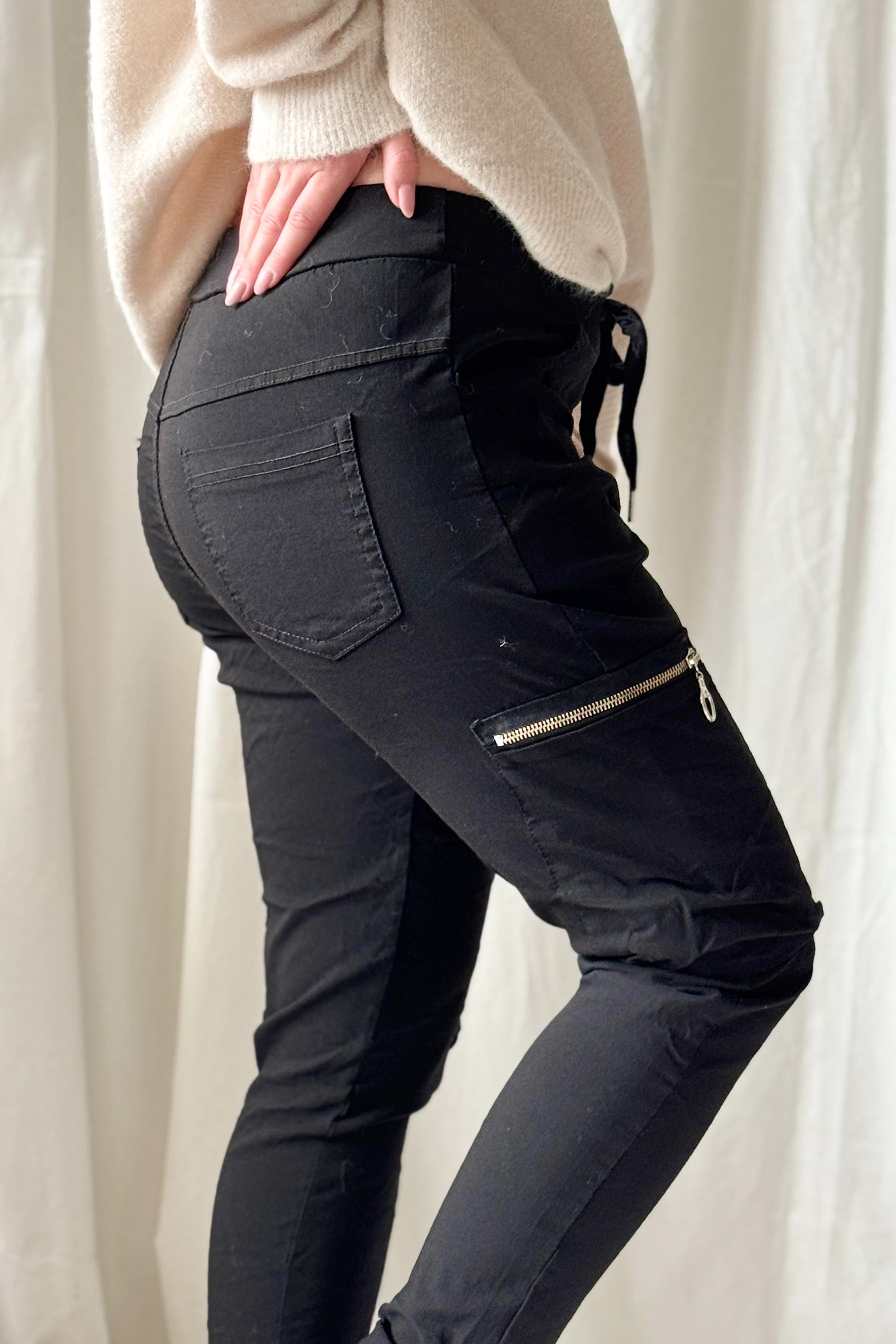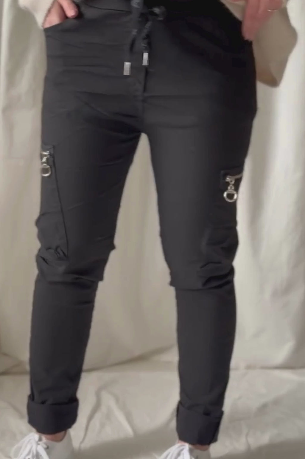 Joustavat ja mukavat joggerit, jotka istuvat kaikille vartalotyypeille. Korkeahko vyötärö, jossa kiristysnyörit. Pull on malli, ei nappeja eikä kinnaavia vetoketjuja. Reisitaskut joissa somisteena vetoketjut. Sopii myös pitkäsäärisille, käärittävät lahkeet. Materiaali bengalinea.