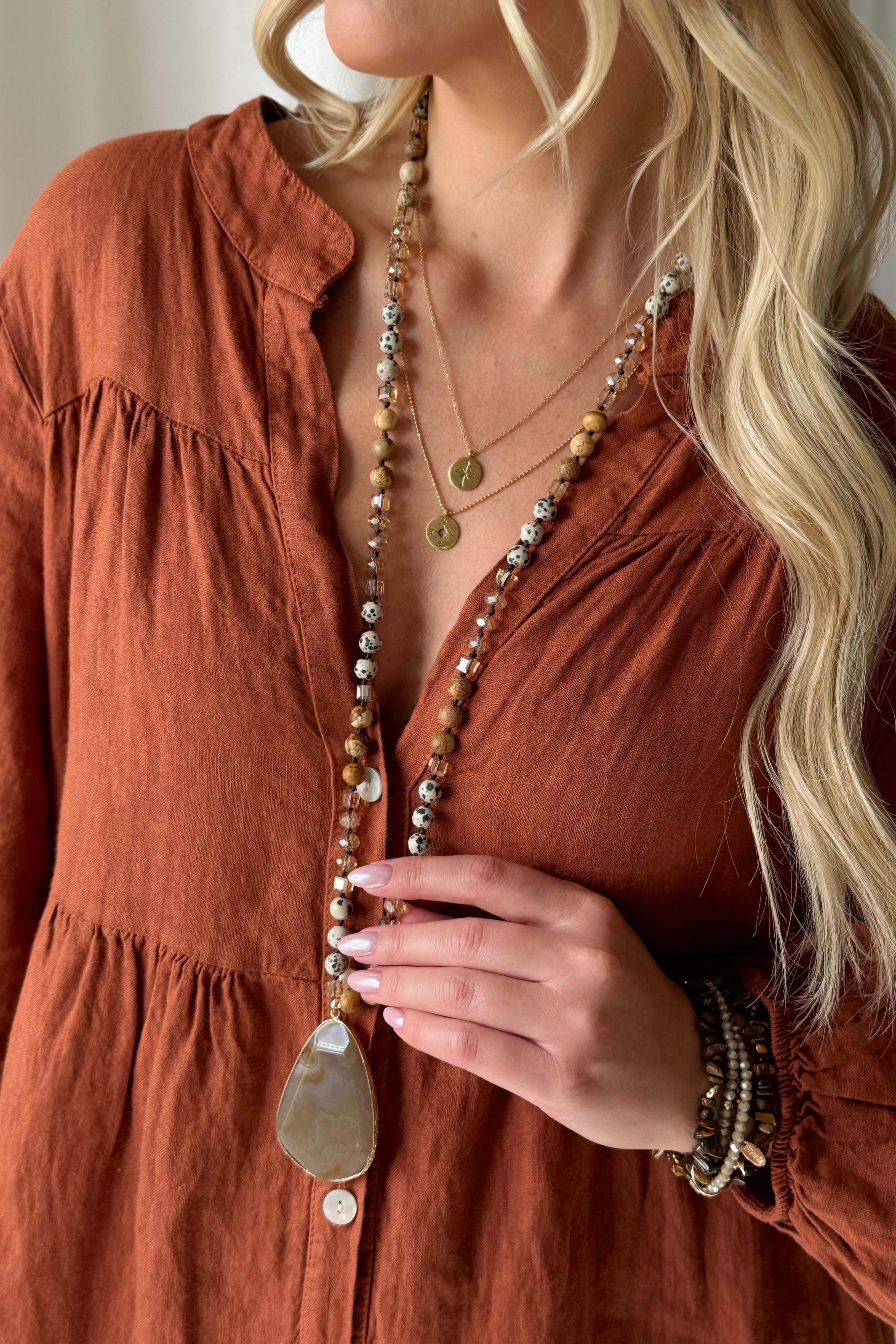 Kaunis ja näyttävä kaulakoru pisaran muotoisella riipuksella, jolla on kullanvärinen kehys. Ketju on koristettu helmillä ja pyöreillä kivillä. Riipus on luonnonkiveä joten väri voi vaihdella yksilöiden välillä.