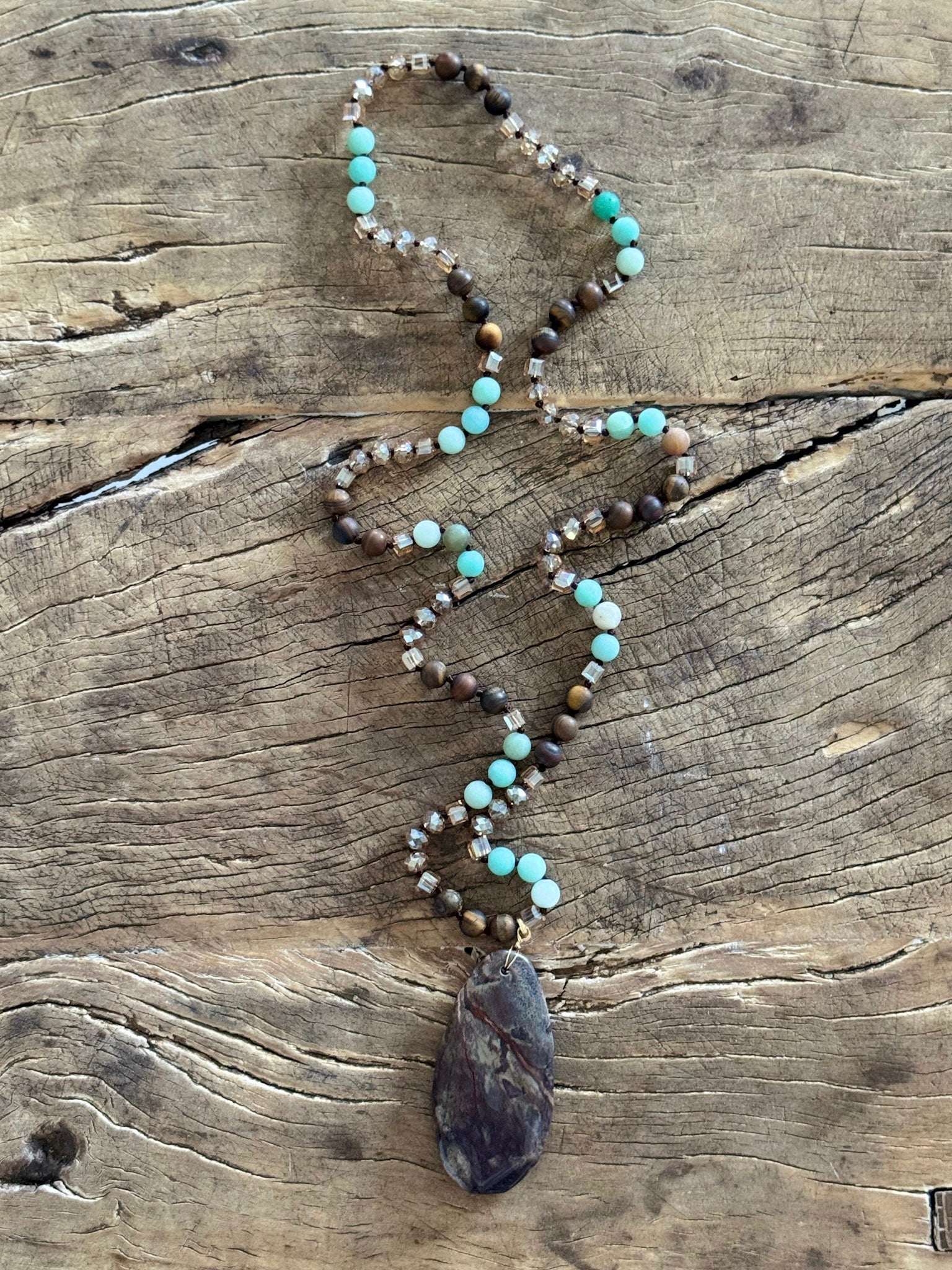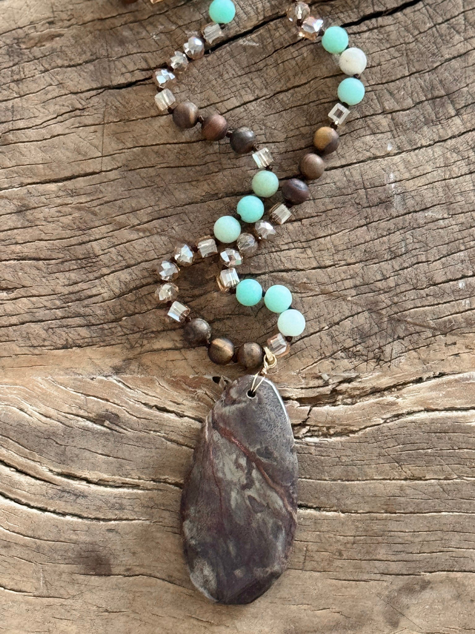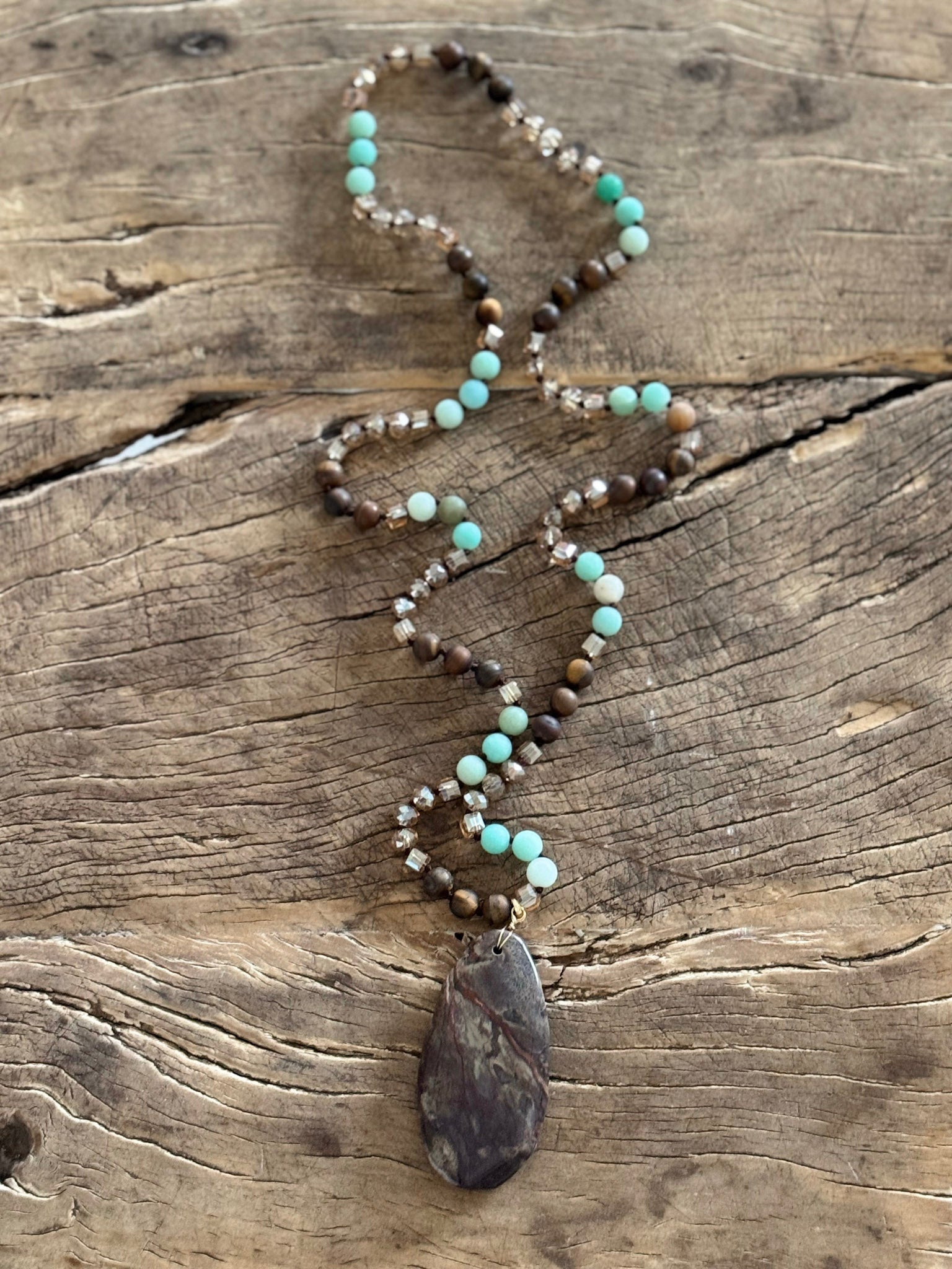 Luonnonläheinen kaulakoru kiviriipuksella. Ketjua koristaa helmet ja pyöreät kivet. Riipus vaihtelee yksilöiden välillä sillä riipus on luonnonkiveä.