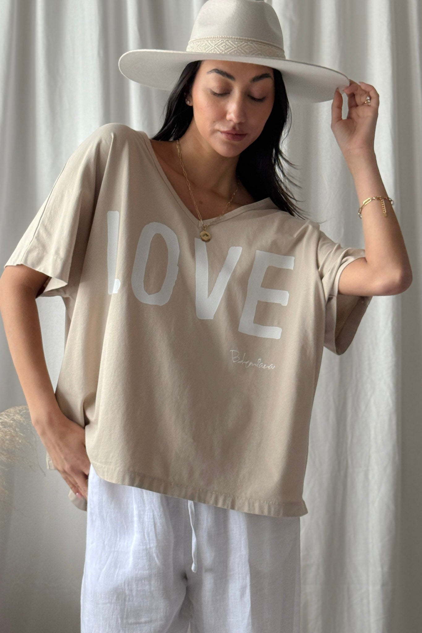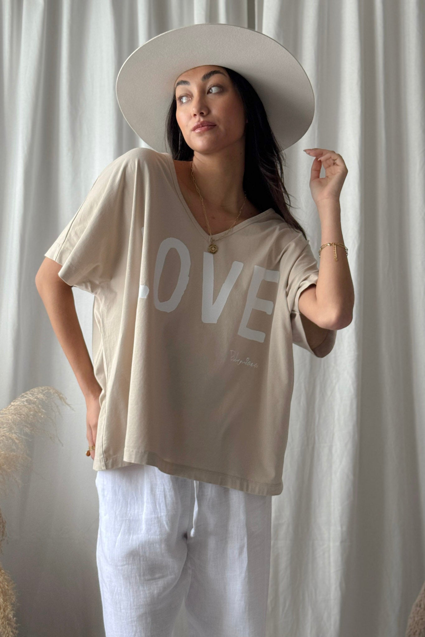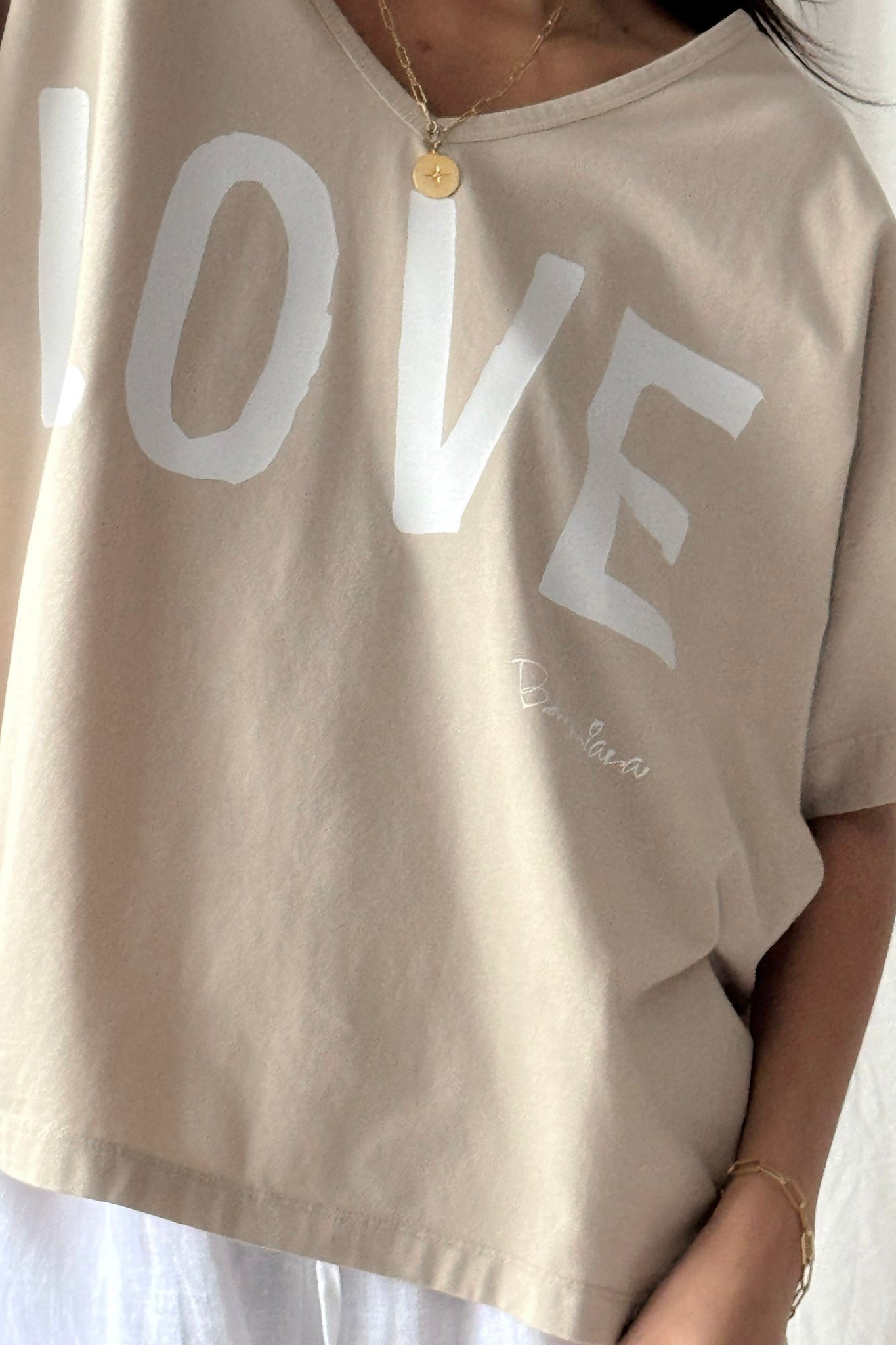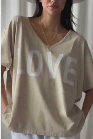 Ihana oversize T-paita LOVE-painatuksella ja imartelevalla V-pääntiellä. Valmistettu pehmeästä ja hengittävästä puuvillasta, joka tuntuu miellyttävältä ihoa vasten. Rento oversize-malli tarjoaa mukavuutta ja huolettoman tyylin arkeen.