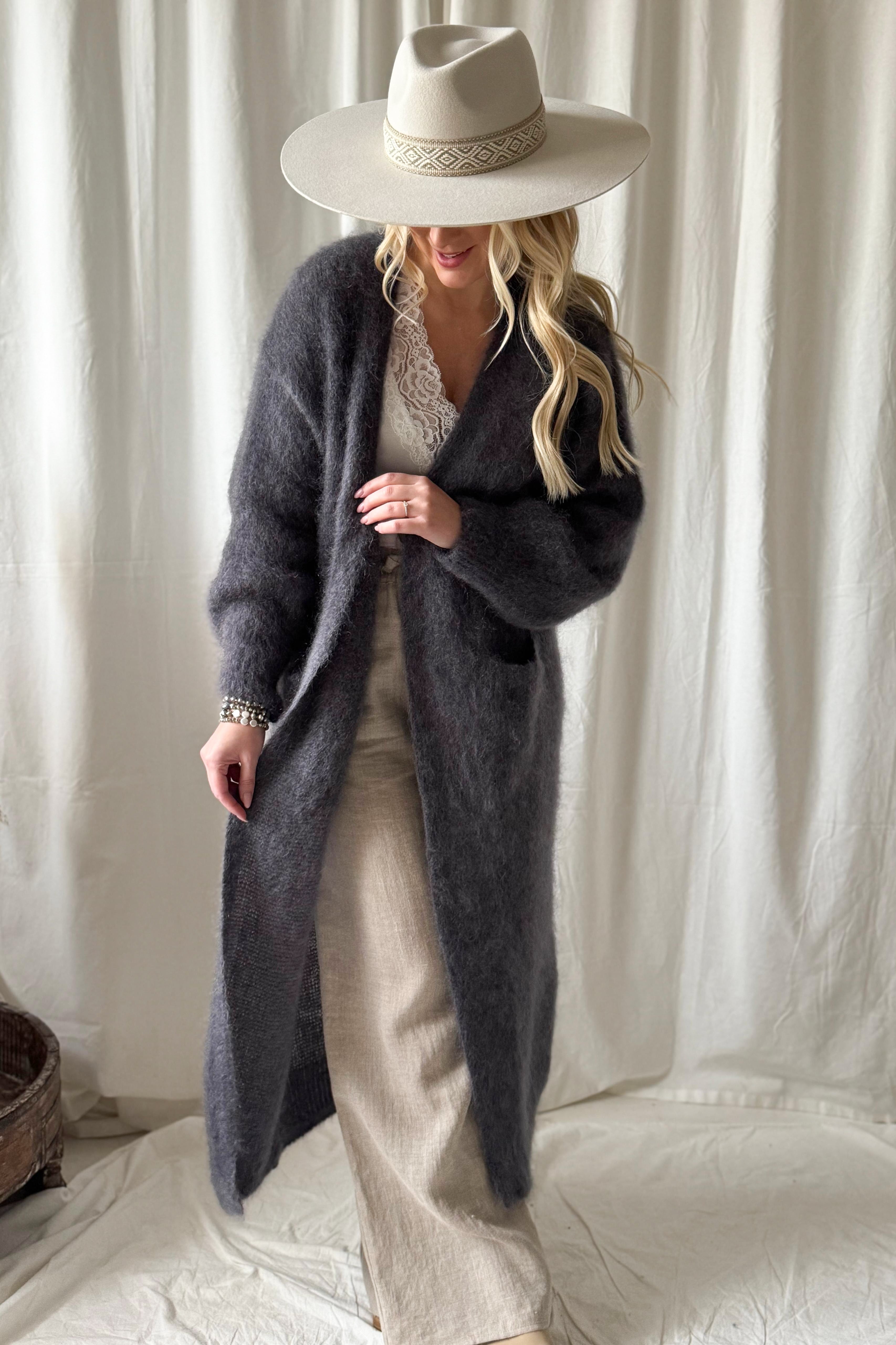 Ihanan muhkea ja ylellinen brushed kid mohair -neuletakki, jossa kevyt resori helmassa ja hihansuissa. Laskettu olkapäälinja. Neuleessa on pörröinen ja muhkea tuntu.
