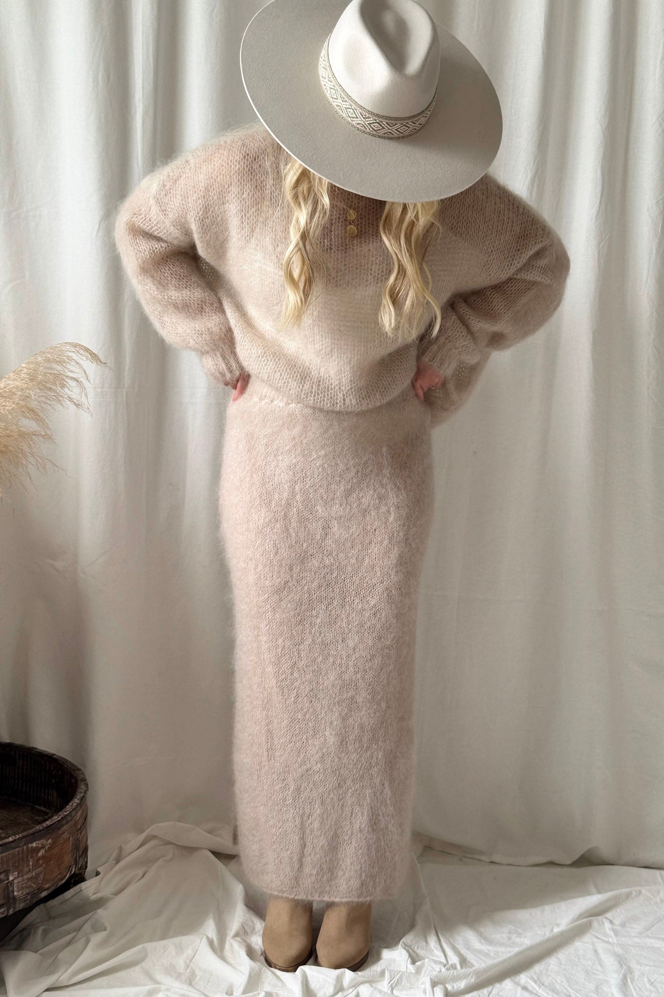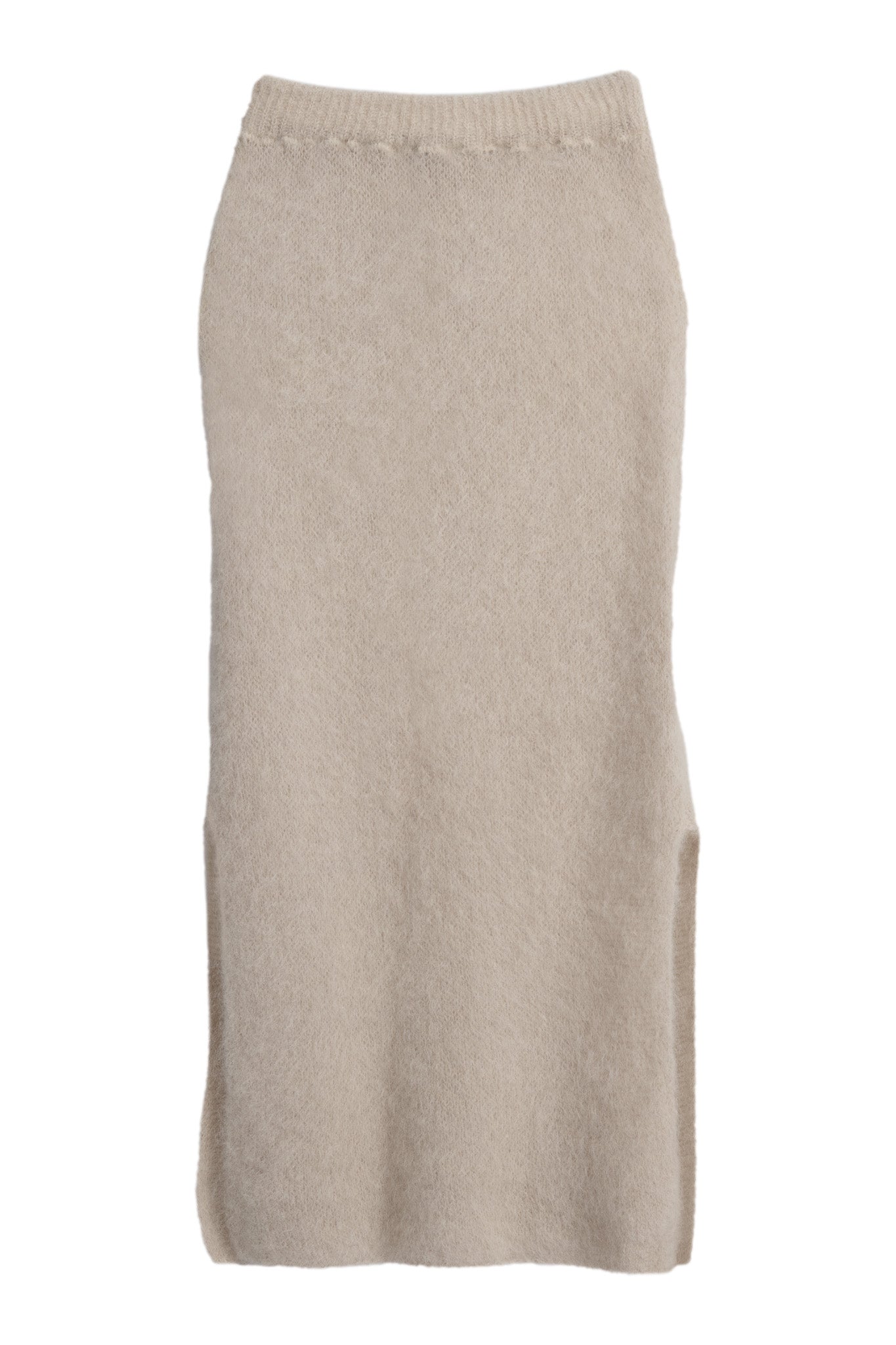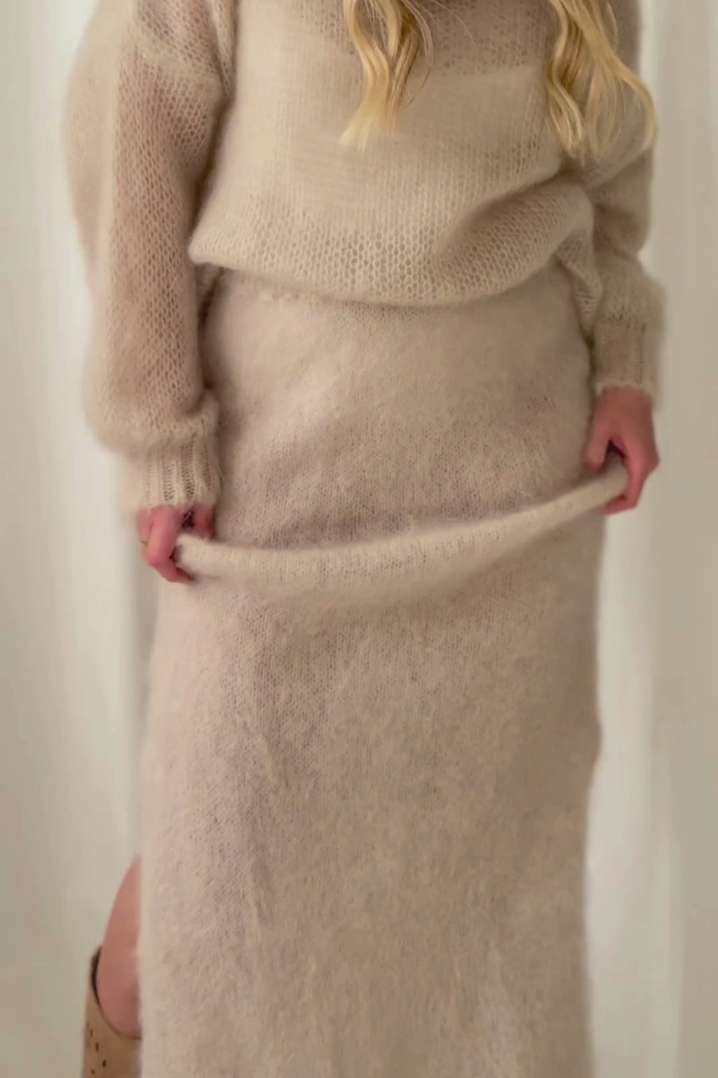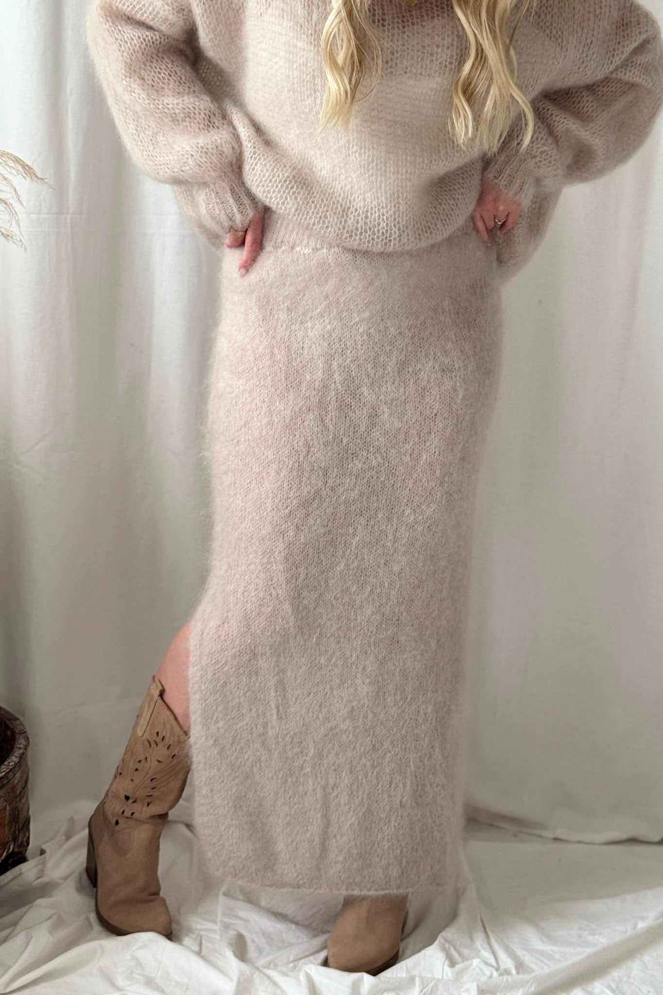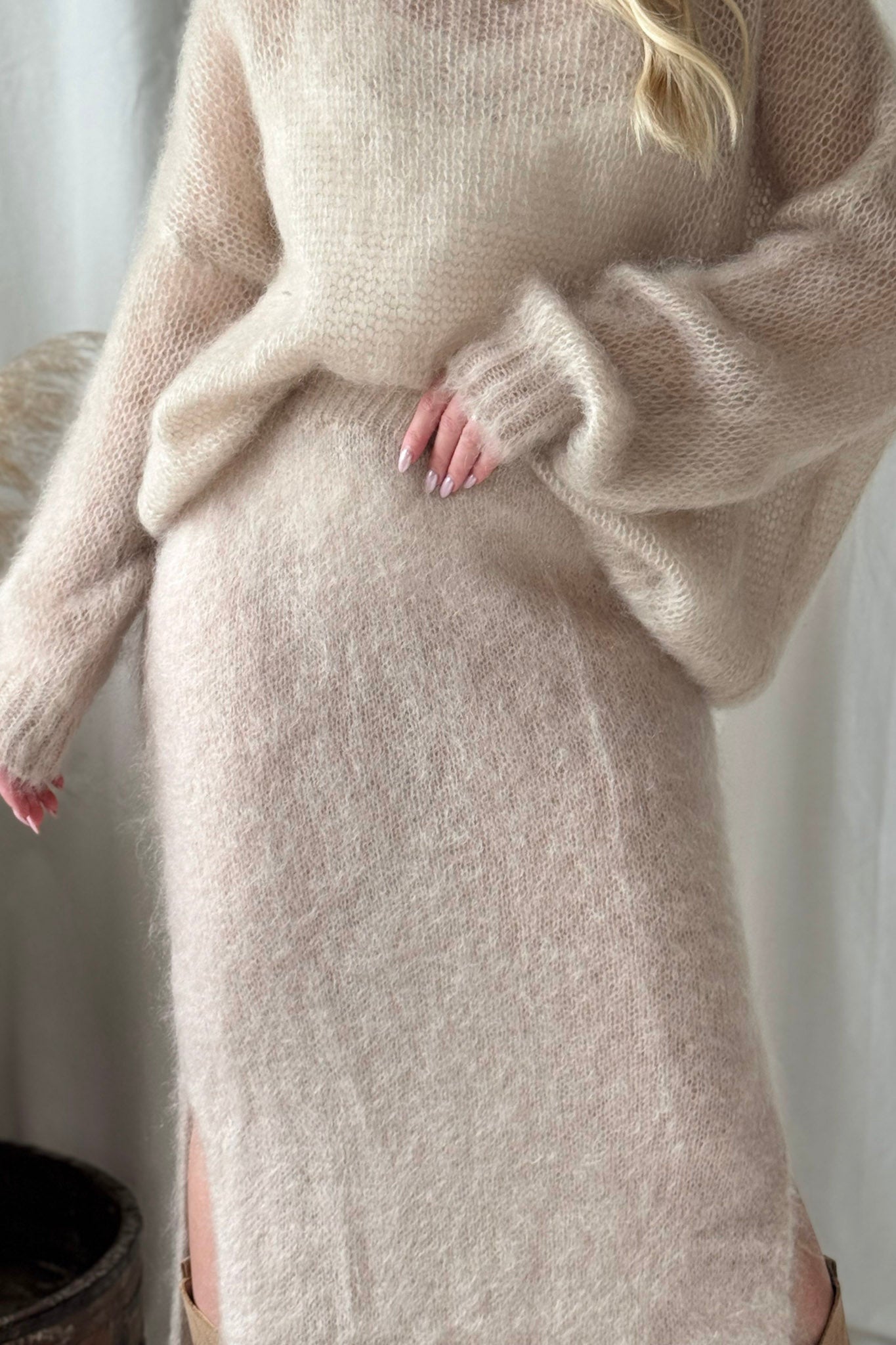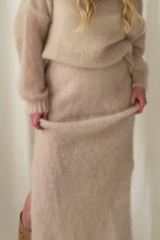 Ylellisen pehmeä ja yleisilmeeltään moderni mohairhame tuo syys- ja talvipukeutumiseen ripauksen eleganssia ja lämpöä. Hameessa on joustava vyötärö ja vartaloa myötäilevä siluetti, joka laskeutuu kauniisti. Sivuilla on vekit. Kevyesti pörröinen pinta tekee ilmeestä erityisen pehmeän ja ajattoman tyylikkään. Yhdistä muhkeaan neuleeseen tai silkkipaitaan. Täydellinen valinta sekä arkeen että juhlavampiin hetkiin.