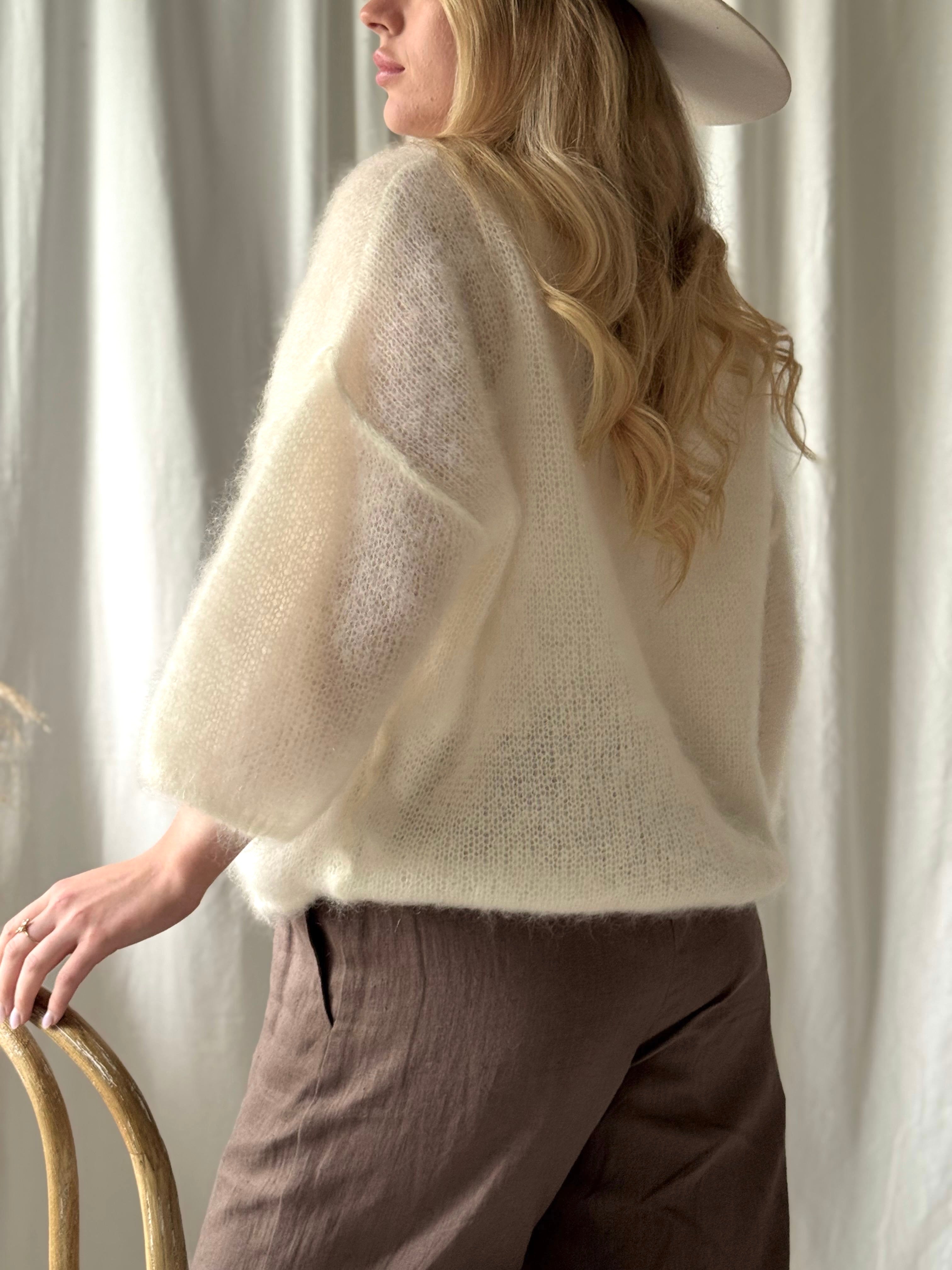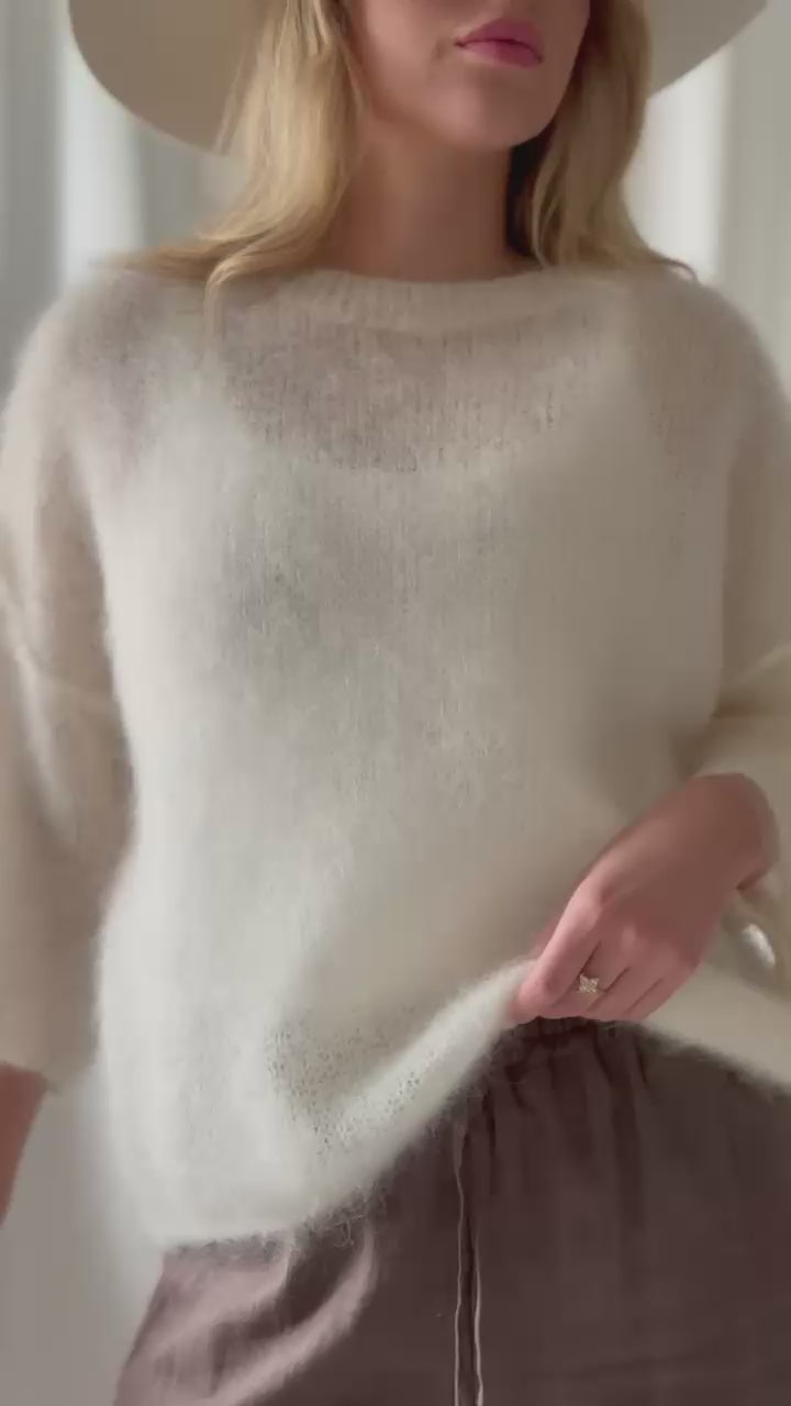 Hattaranpehmoinen ja naisellinen, klassinen neulemalli puolimittaisilla hihoilla ja pyöreällä pääntiellä. Henkäyksen keveä, kimmoisa kid mohair antaa neuleelle todella ylellisen tunnun.