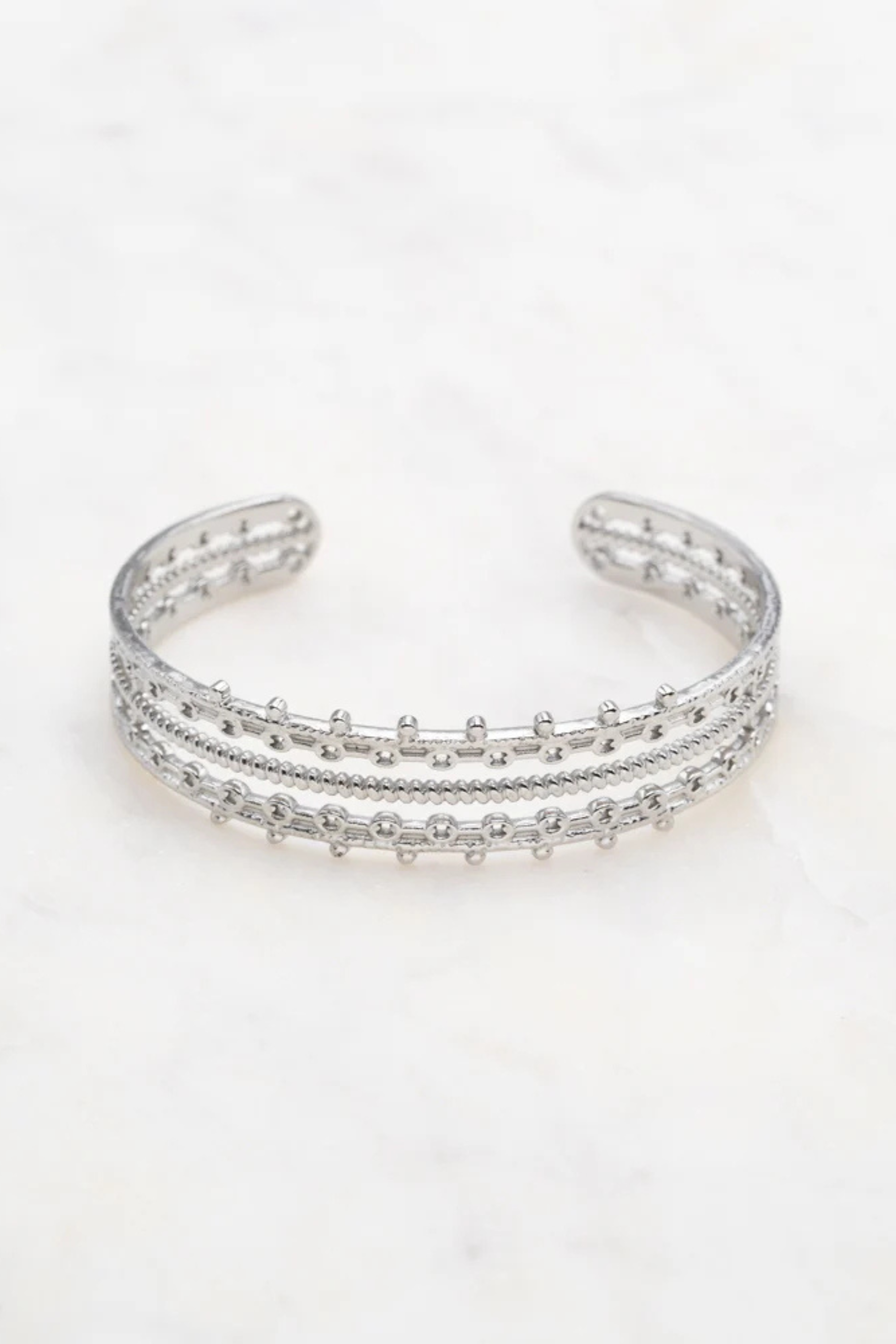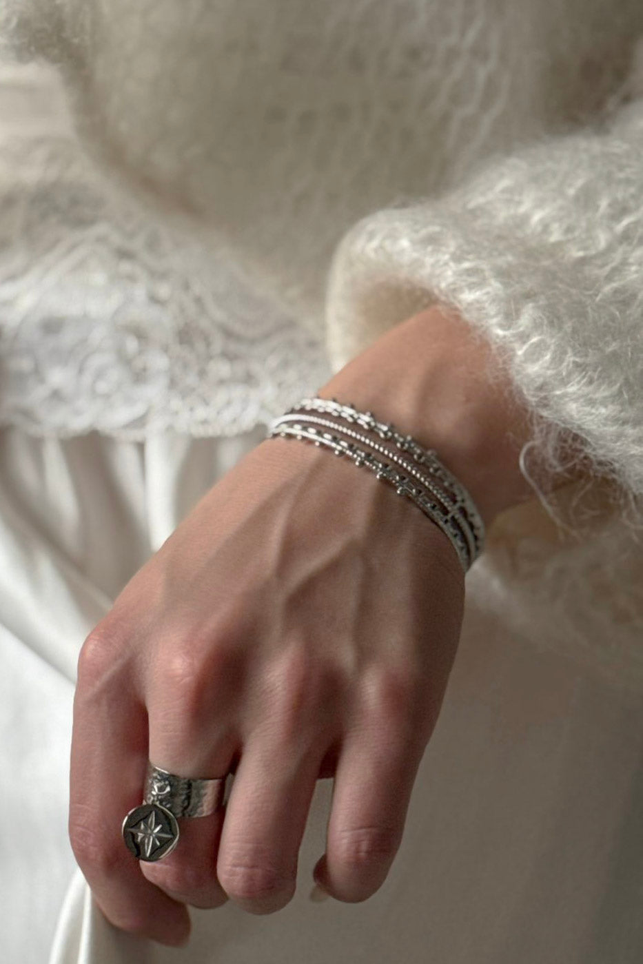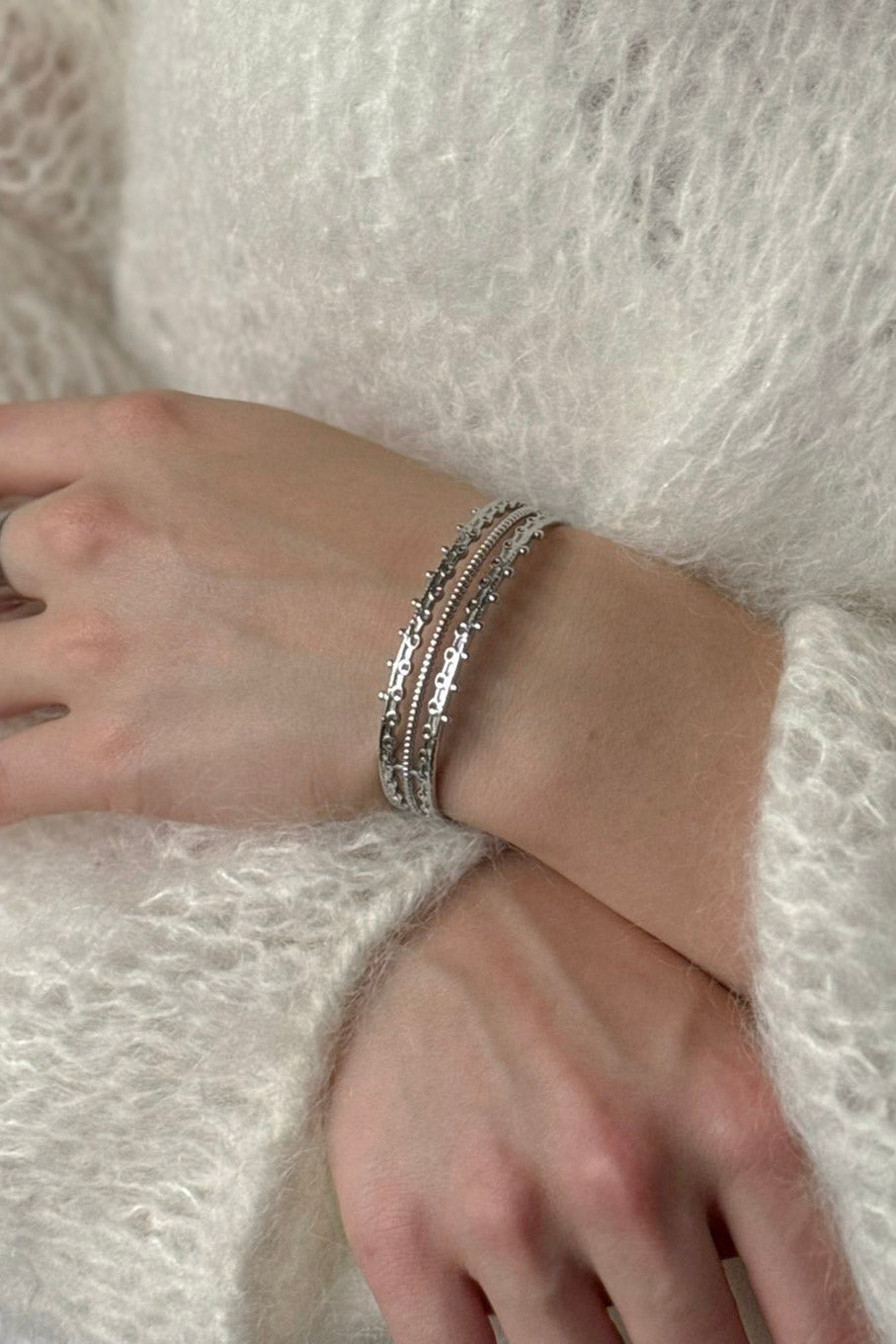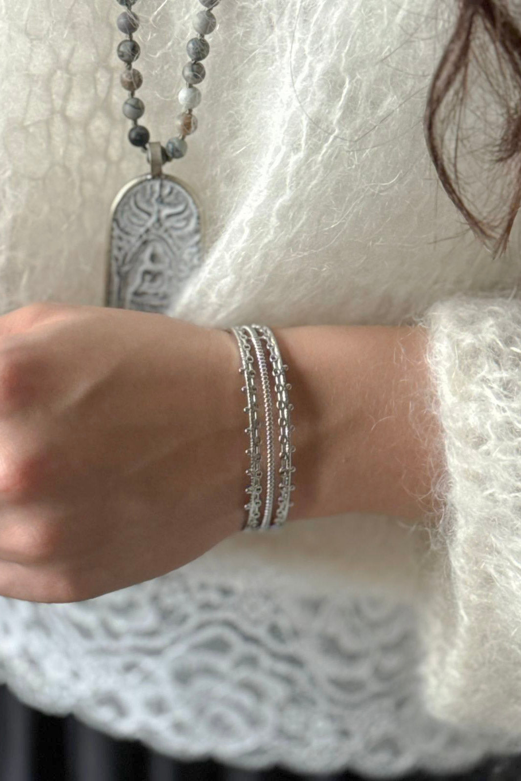 Tämä siro mutta näyttävä rannekoru huokuu naisellista voimaa ja henkisyyttä. Korun avoin ja joustava muoto tekee siitä miellyttävän käyttää ja täydellisen lisän sekä arkisiin että juhlavampiin asuihin. Koru on komikerroksinen.