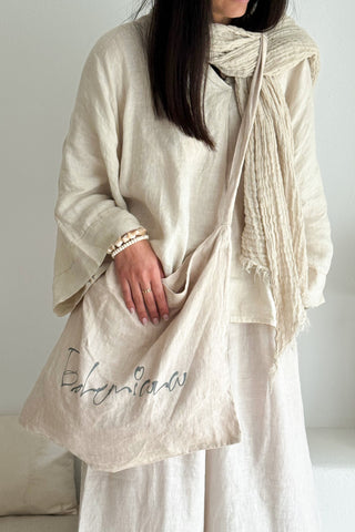 Sävysävyyn pellavakassi asusteeksi Bohemiana-brändiltämme. Tämä pitkäolkaiminen malli on unisex ja sopii kannettavaksi kätevästi yli olan. Sisällä on sisätasku johon mahtuu isompikin puhelin.