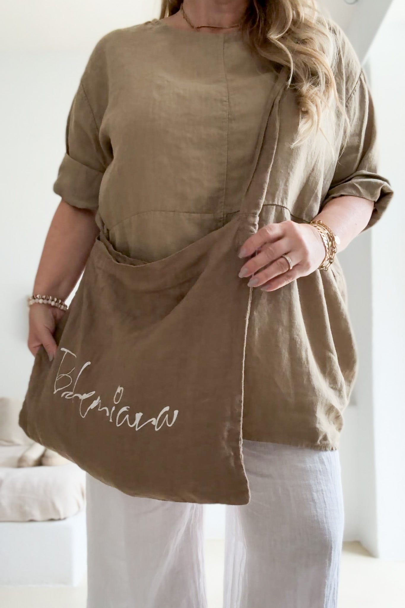 Sävysävyyn pellavakassi asusteeksi Bohemiana-brändiltämme. Tämä pitkäolkaiminen malli on unisex ja sopii kannettavaksi kätevästi yli olan. Sisällä on sisätasku johon mahtuu isompikin puhelin.