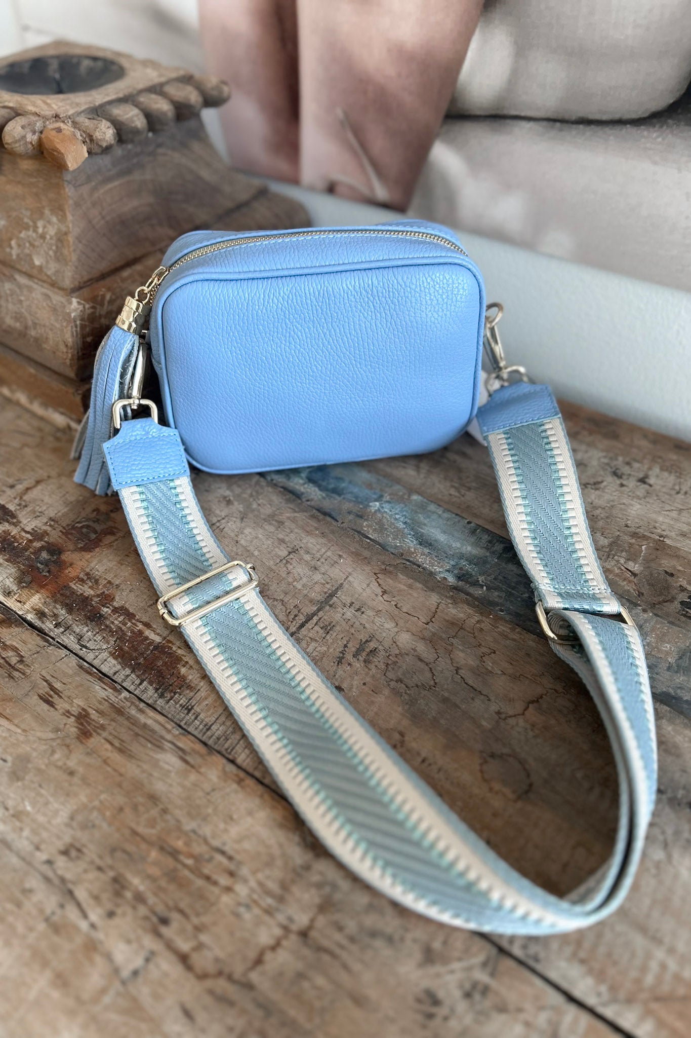 Näyttävä ja tyylikäs laukun olkahihna, jossa on nahkaiset vahvikkeet päädyissä sekä metalliset soljet. Olkahihnan pituutta voi säätää. Paksua ja jämäkkää kangasta ja helppo kiinnittää laukun solkiin.