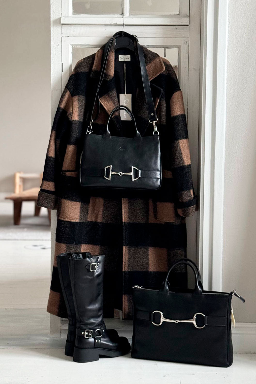 Väliseinässä kännykkätasku, takana vetoketjutasku
