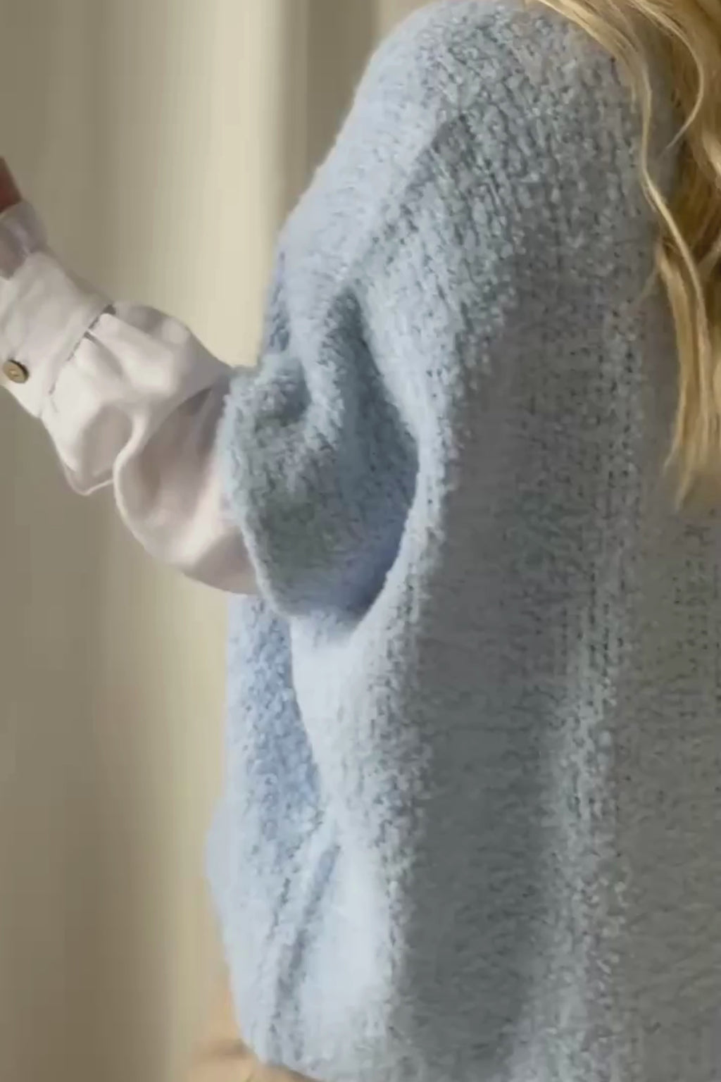 Bouckle-mallistomme pehmeä neuleliivi sopii paidan päälle tai vaikka yksinään ja on lämmittävä vaate viileisiin ja kylmiin hetkiin. Neuleliivi on väljää joten se mahtuu asukokonaisuuden päälle helposti. Boucle-neuleet ovat materiaaliltaan helppohoitoisia, eivätkä kutita ihoa.