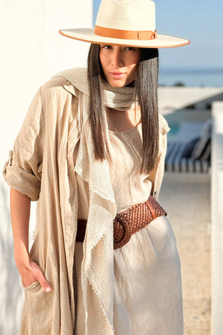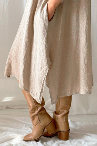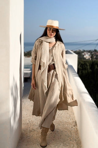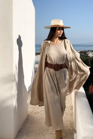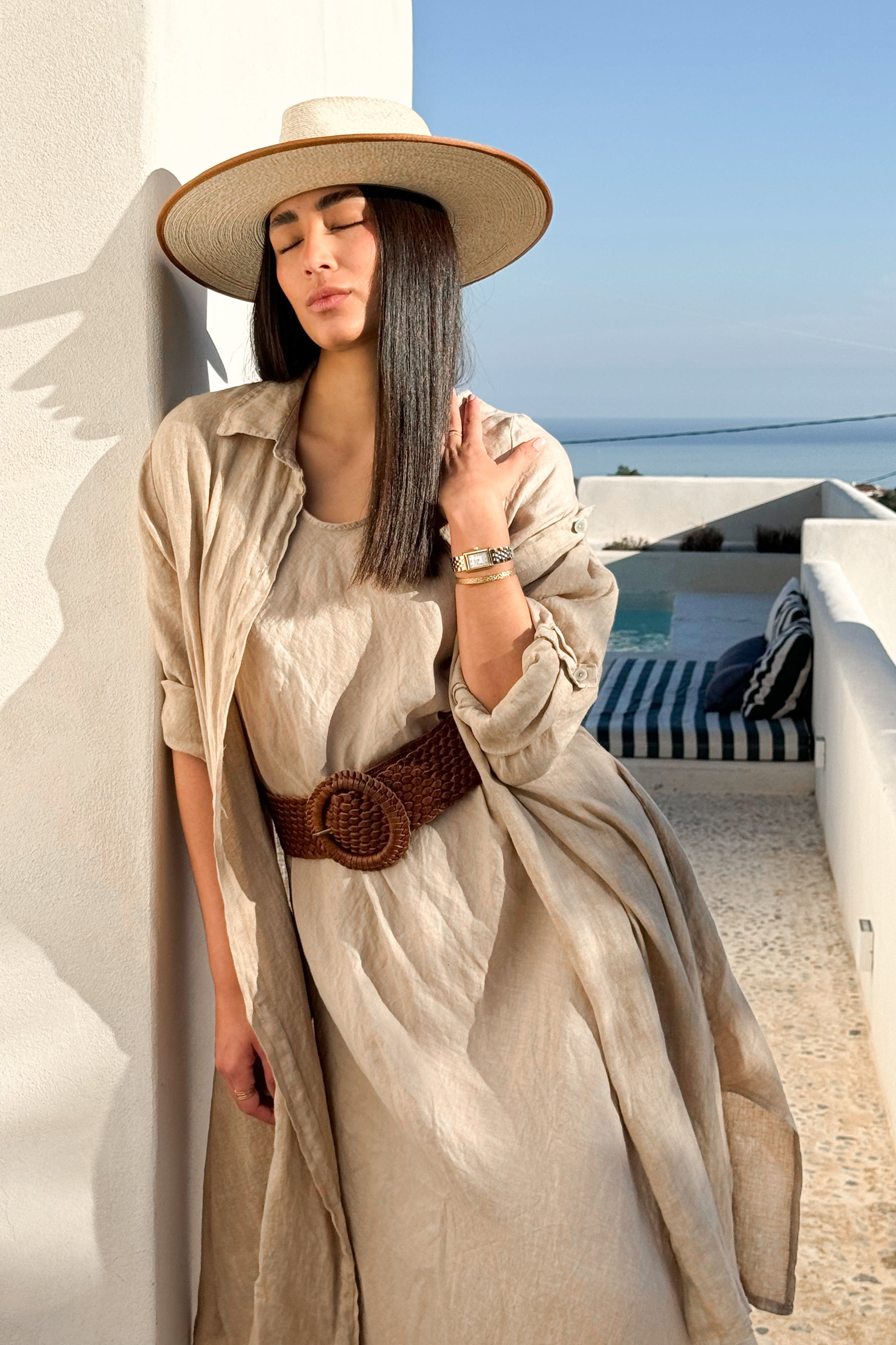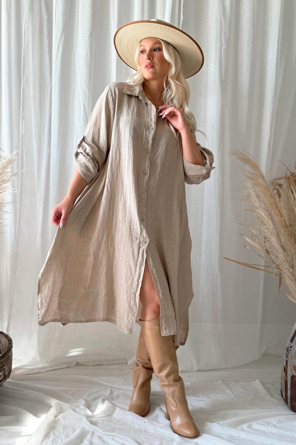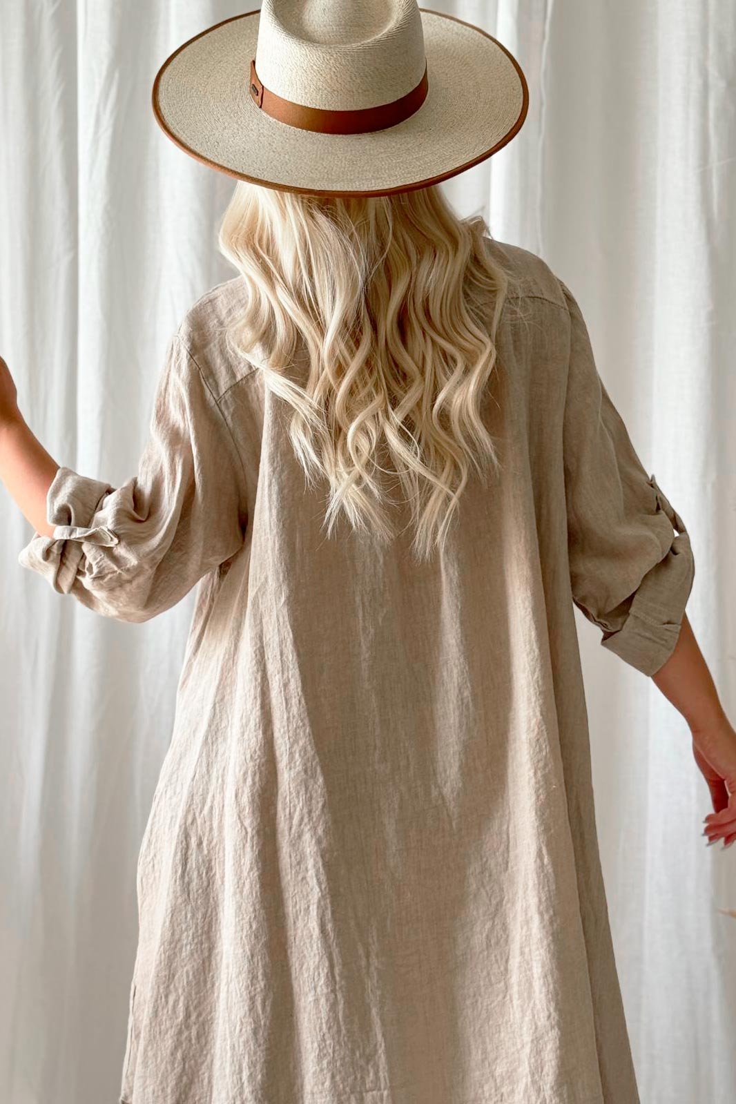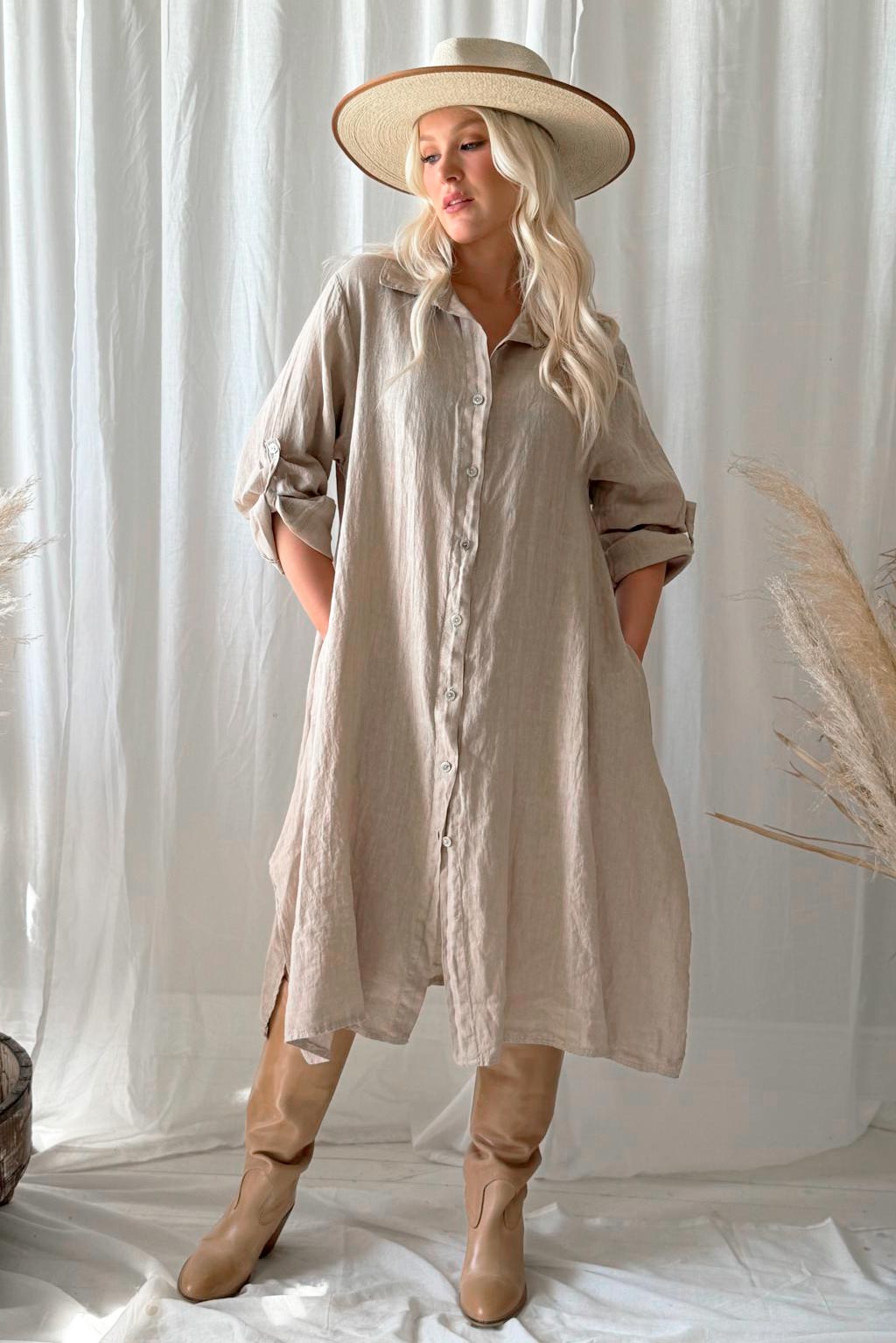Upea pellavainen paitamekko, jossa kaulukset, halkiot sivuilla ja edessä napitus. Täydellinen pitkä ja kevyt paitamekko, joka sopii puettavaksi sekä pellavahousujen, että farkkujen kanssa.