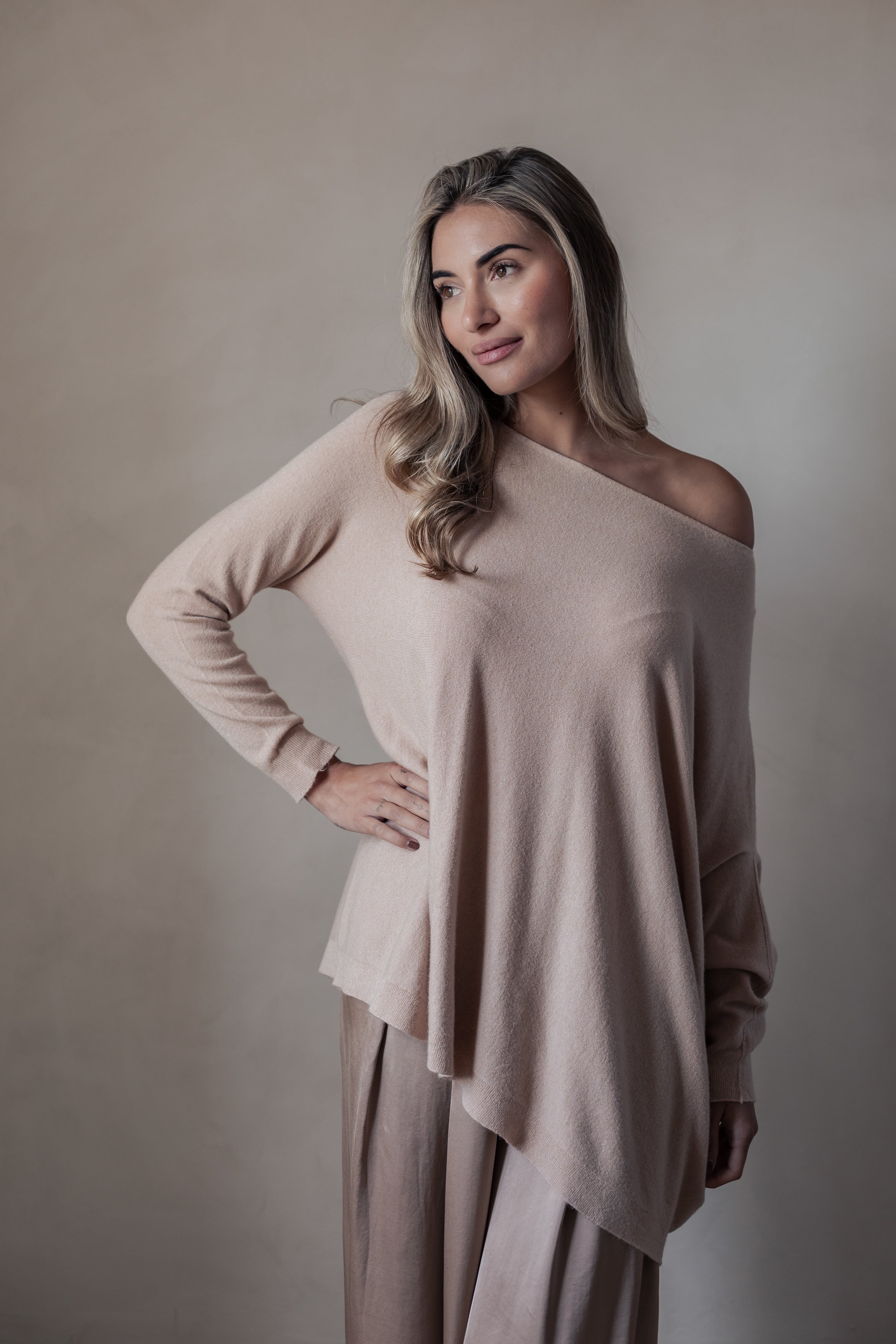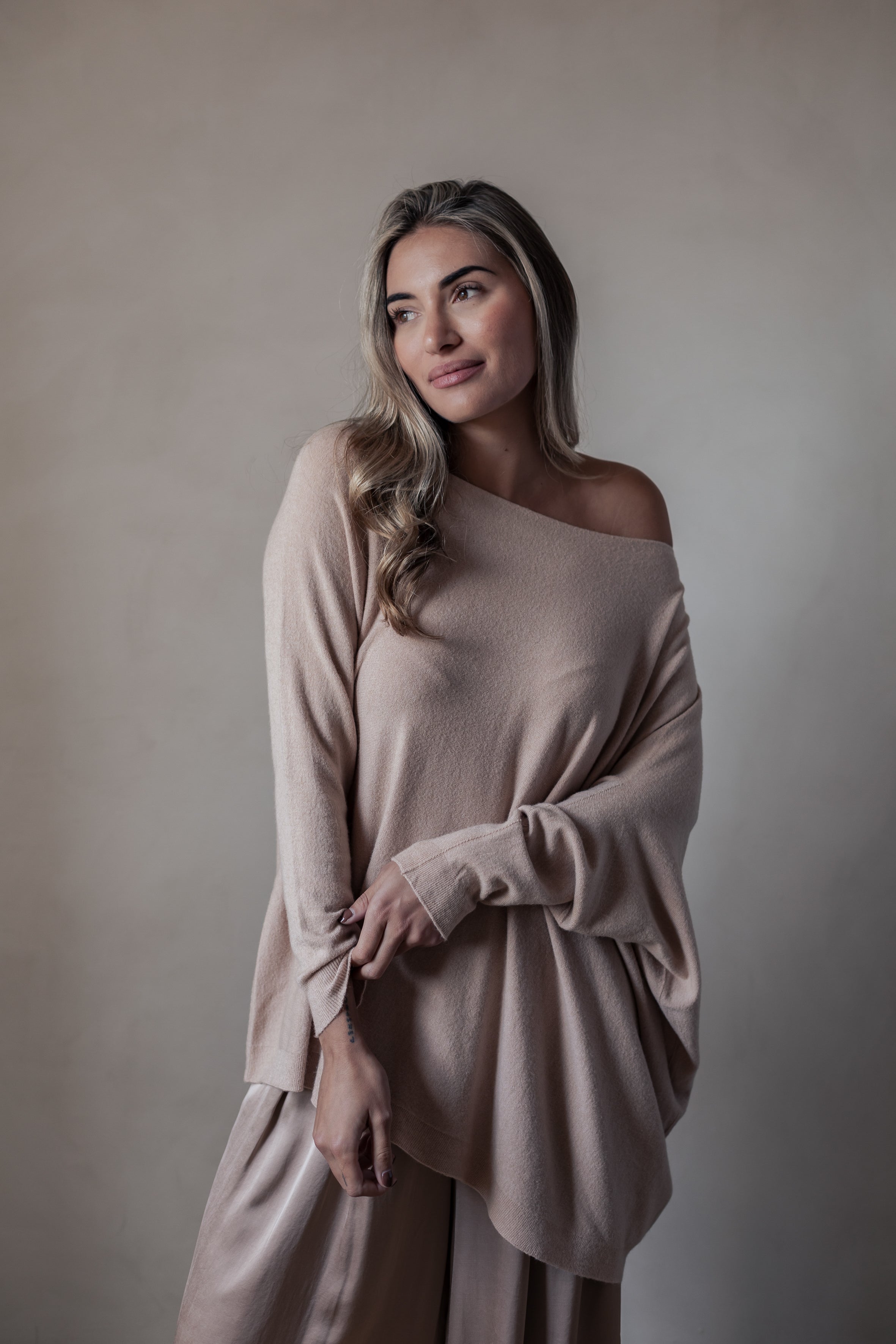 Huikean ylellinen, joustava neule jossa leikkauksessa epäsymmetrinen helma. Voit pukea off shoulderiksi tai laskea helman vyötäröltä alas tunikaksi. Hihoissa ja helmassa kevyet resorit. Koko hienouden kruunaa erityinen viskoosisekoite-neuloksen materiaali.