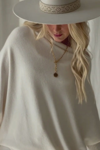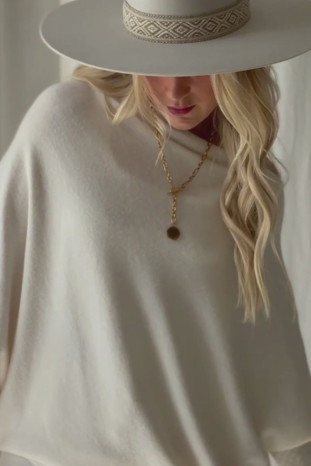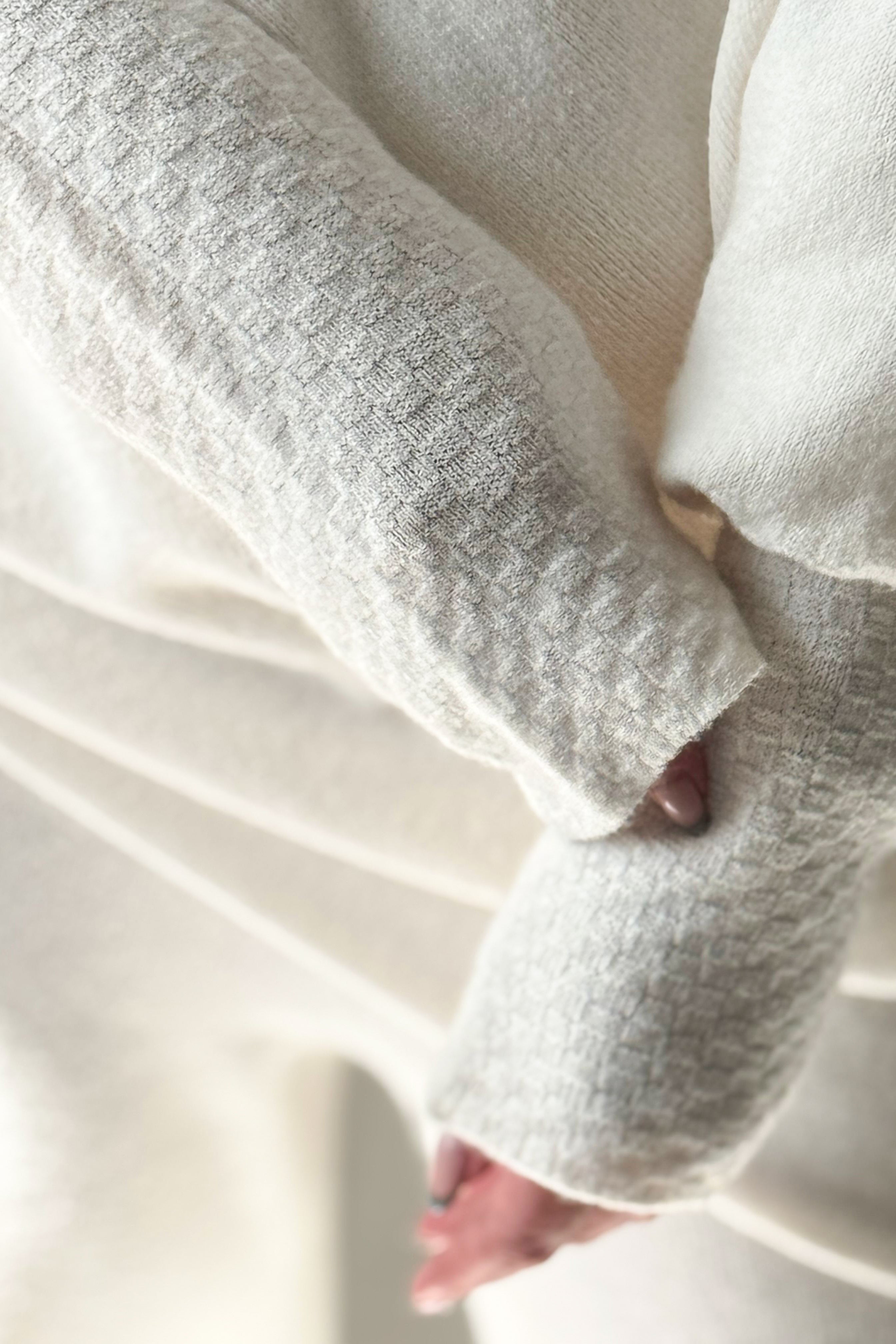 Huikea epäsymmetrinen neule jossa voit helman nostaa ylemmäs tai tunikaksi. Hihoissa on kaunis neulekirjoilu. Koko hienouden kruunaa erityinen viskoosisekoite-neuloksen materiaali.