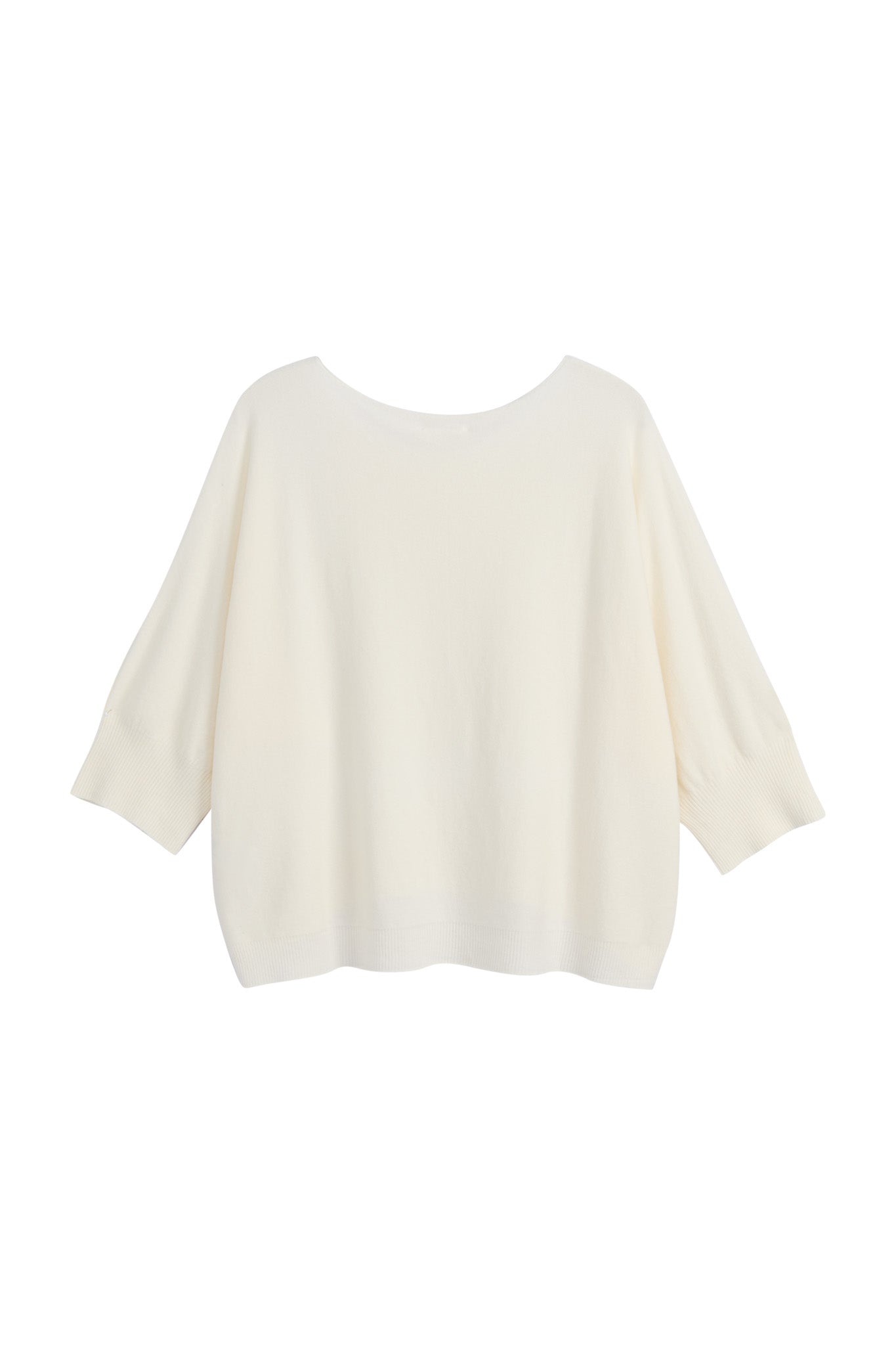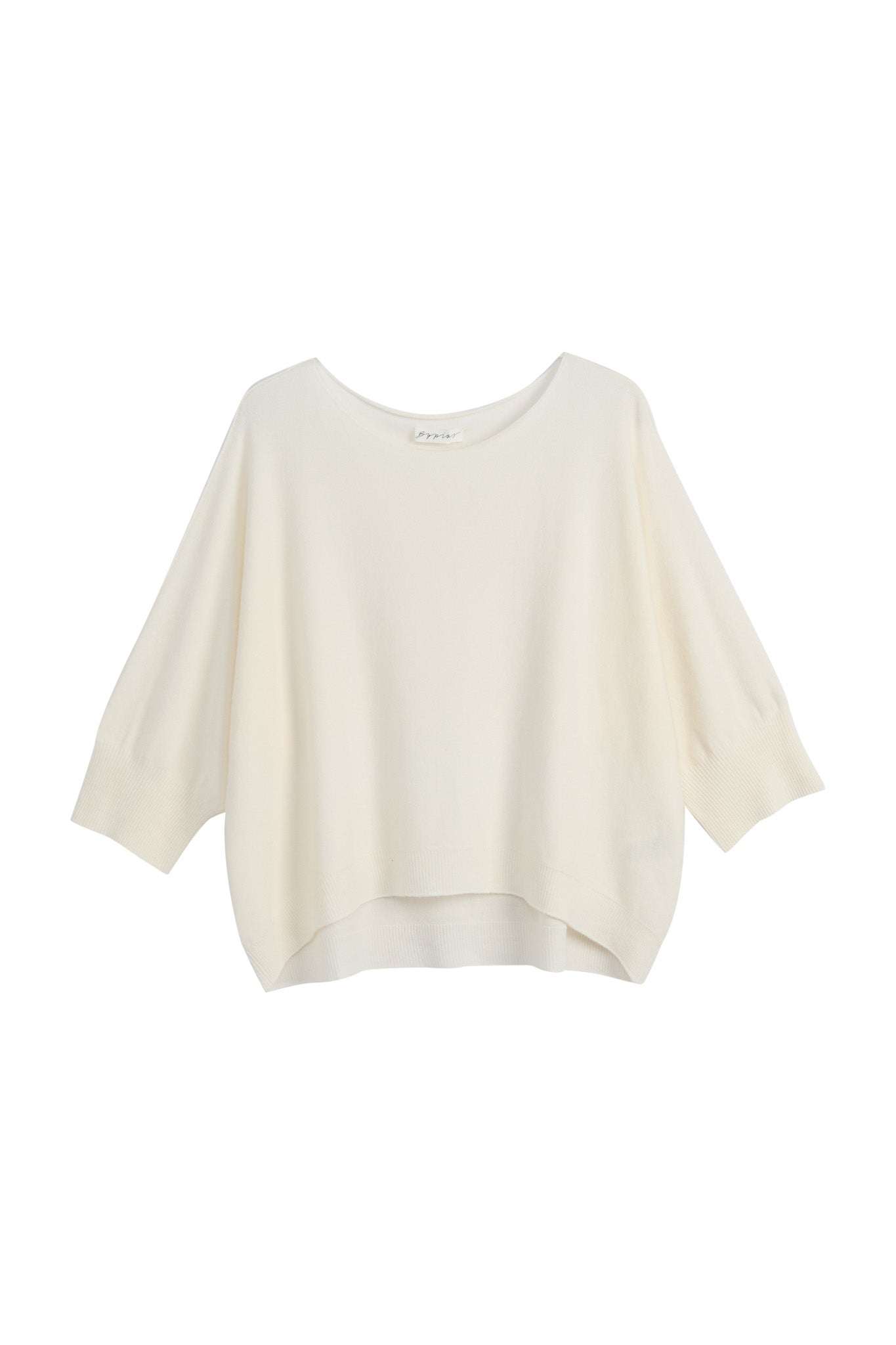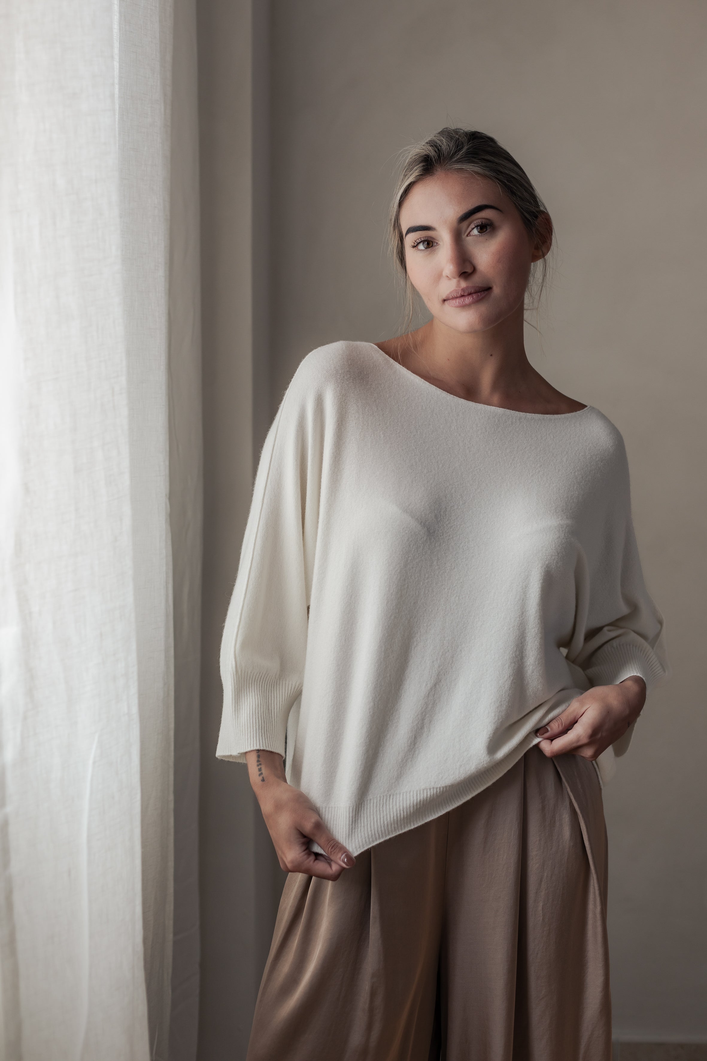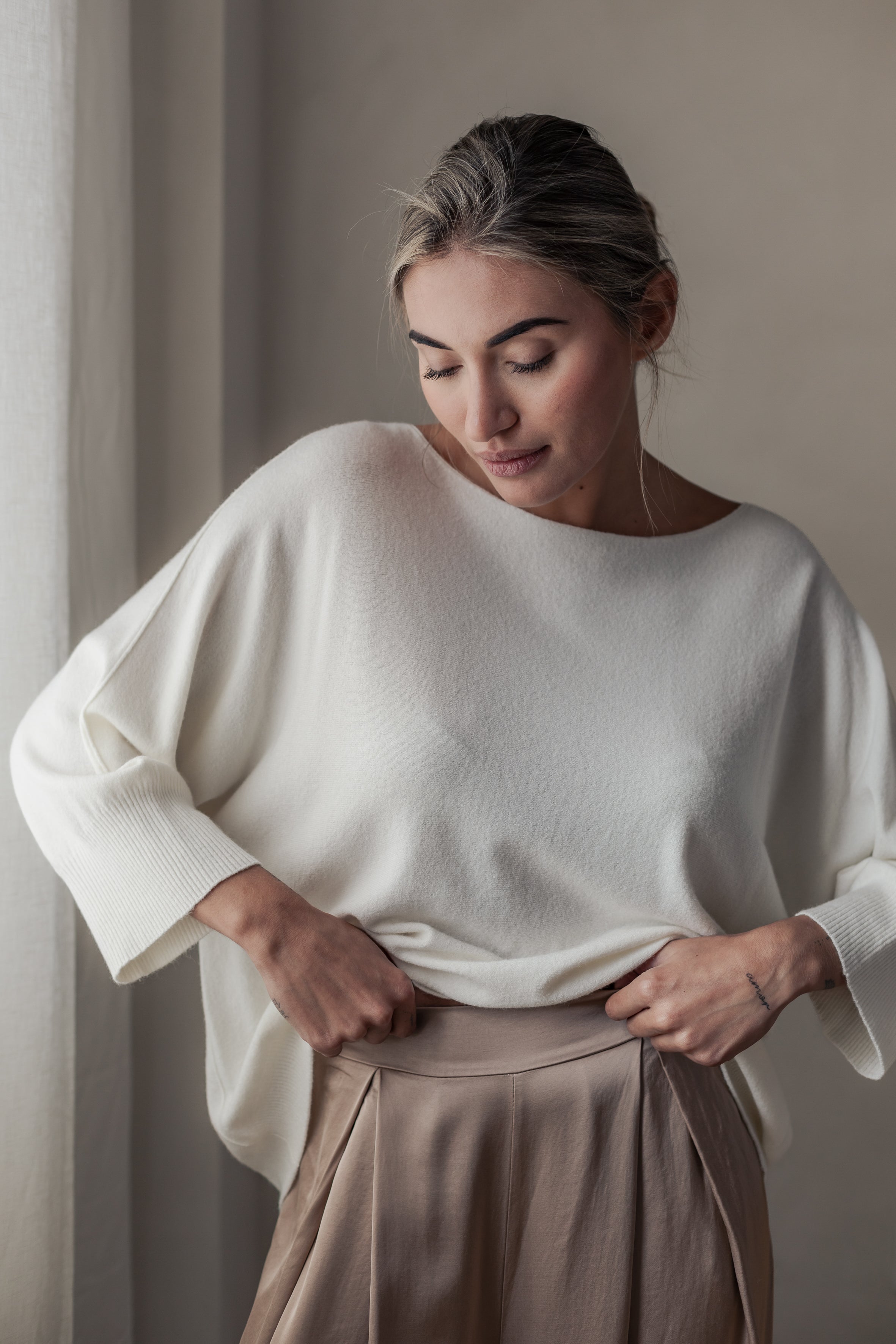 Huikean ylellinen, joustava neule, jossa leveä helma ja hieman vajaamittaiset hihat. Hihoissa ja helmassa kevyet resorit. Koko hienouden kruunaa erityinen viskoosisekoite-neuloksen materiaali.