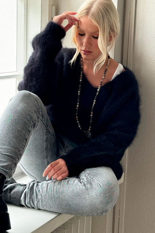 Ihanan muhkea ja ylellinen brushed kid mohair -neule, jossa v-pääntie ja kevyt resori helmassa ja hihansuissa. Laskettu olkapäälinja. Neuleessa on pörröinen ja muhkea tuntu.