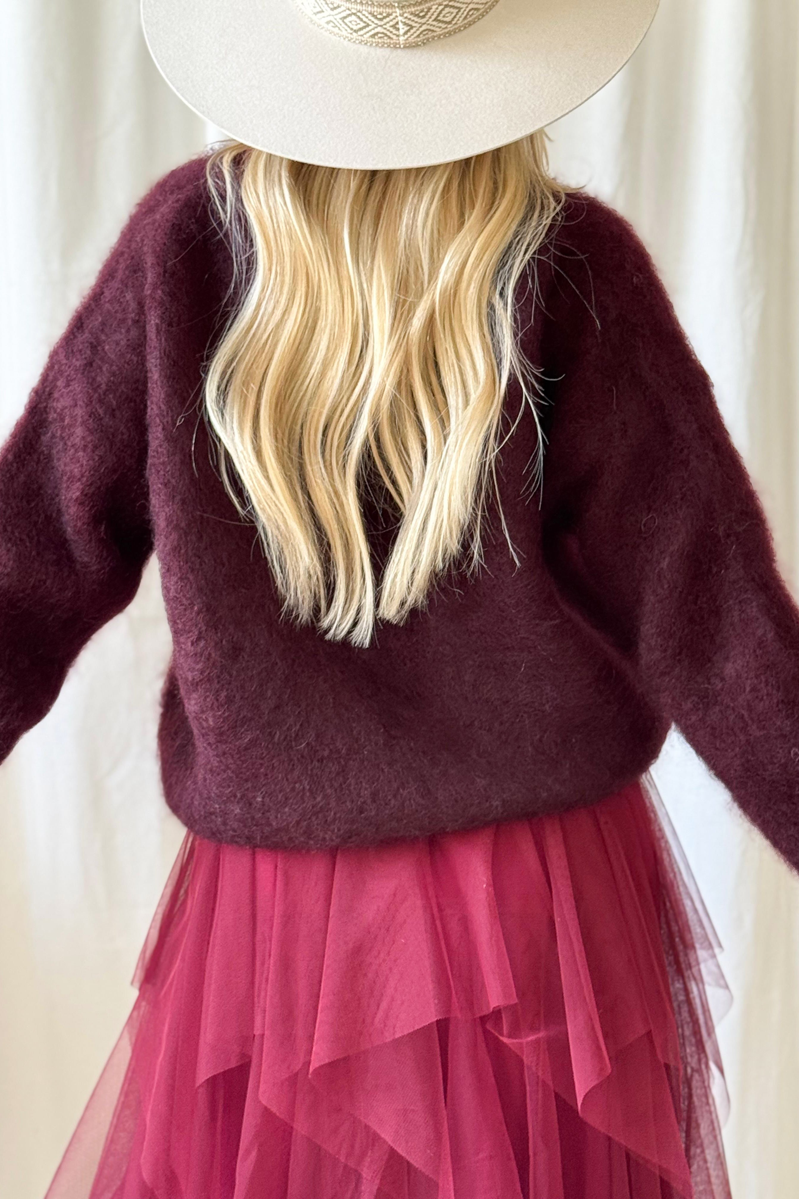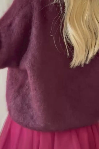 Ihanan muhkea ja ylellinen brushed kid mohair -neule, jossa v-pääntie ja kevyt resori helmassa ja hihansuissa. Laskettu olkapäälinja. Neuleessa on pörröinen ja muhkea tuntu.