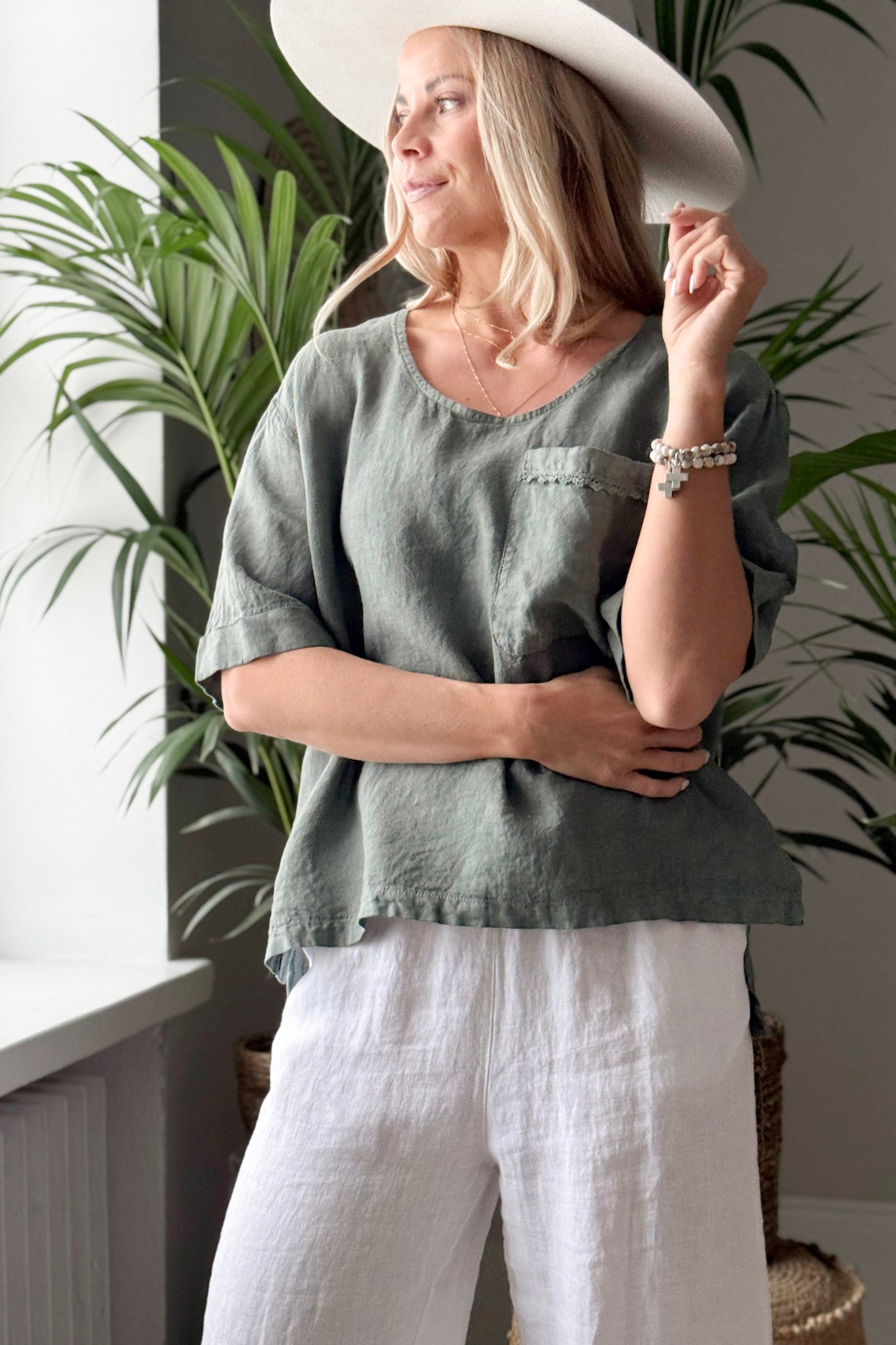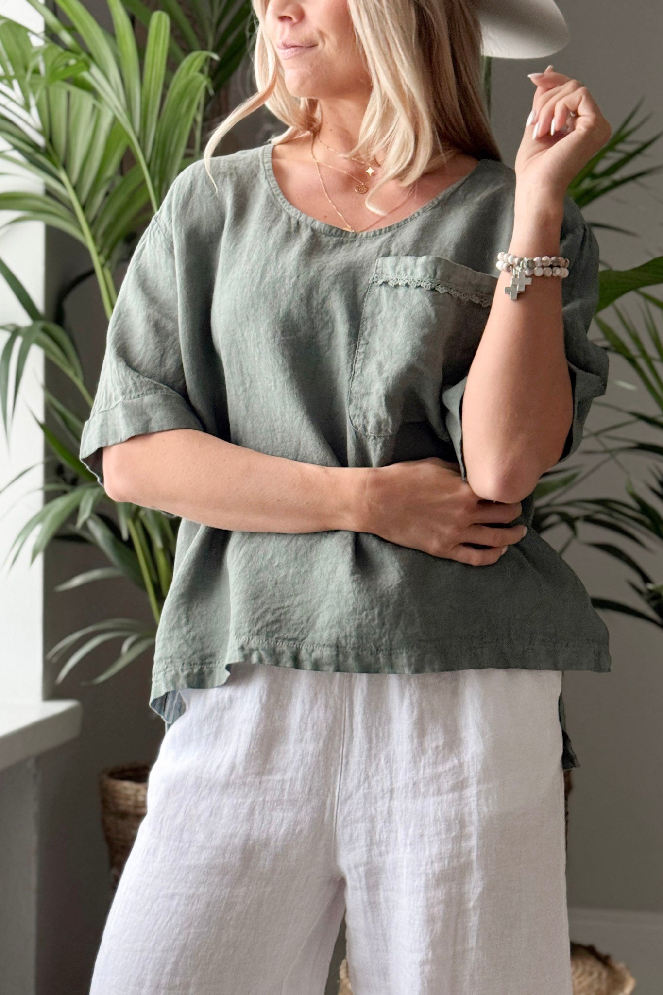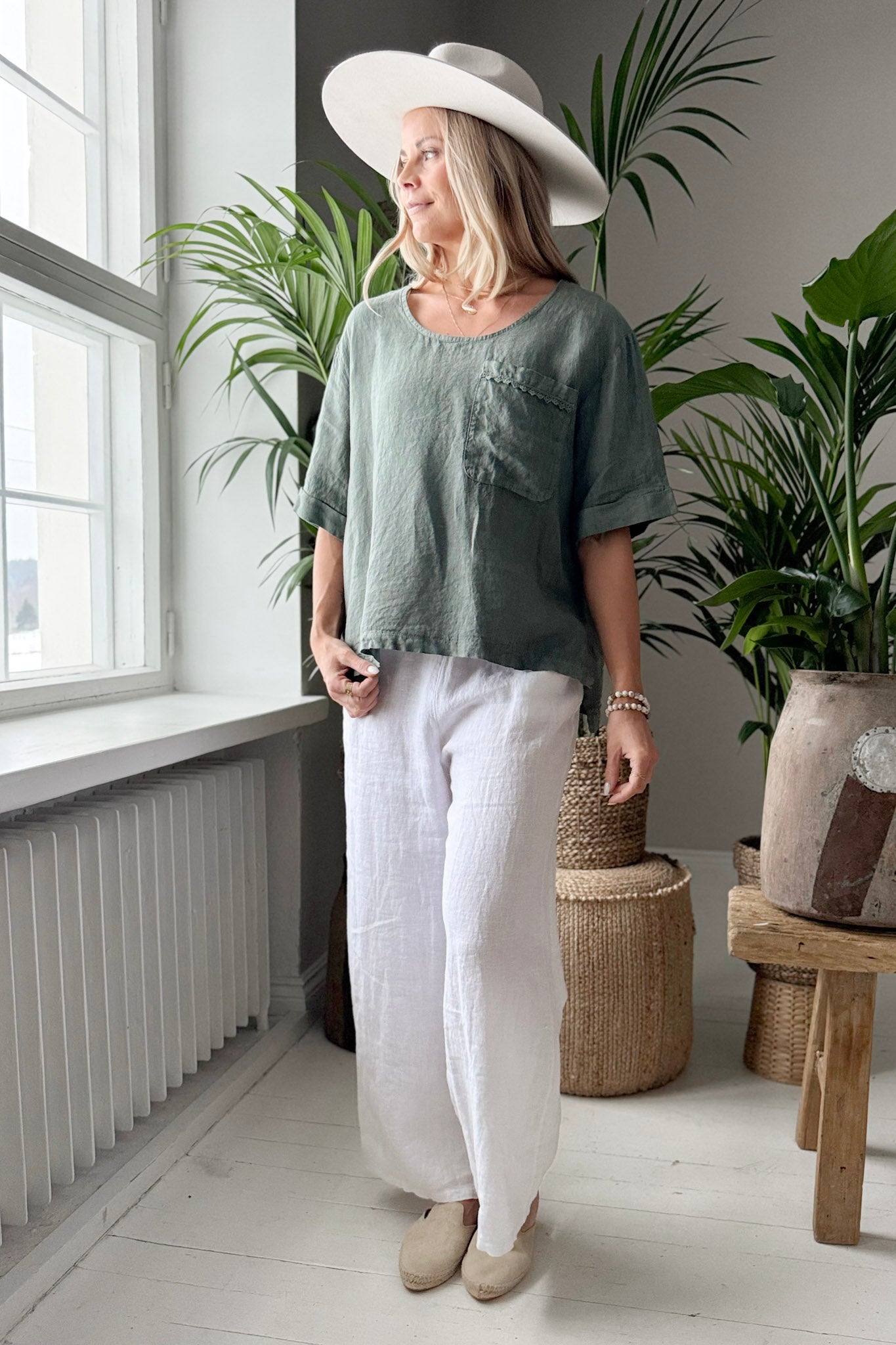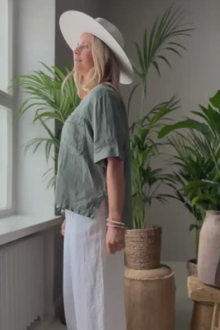 Rento ja ajaton pellavapaita, jossa yhdistyvät mukavuus ja kauniit yksityiskohdat. Etupuolen rintataskua koristaa hienovarainen kapea pitsinauha, joka tuo ilmeeseen pehmeyttä. Pyöreä kaula-aukko ja puolimittaiset, kevyesti käärityt hihat luovat huolettoman ja rennon kokonaisuuden. Sivujen halkiot lisäävät liikkumavapautta ja keventävät ilmettä, ja hieman pidempi takaosa tuo paidalle kauniin laskeutuvuuden.
