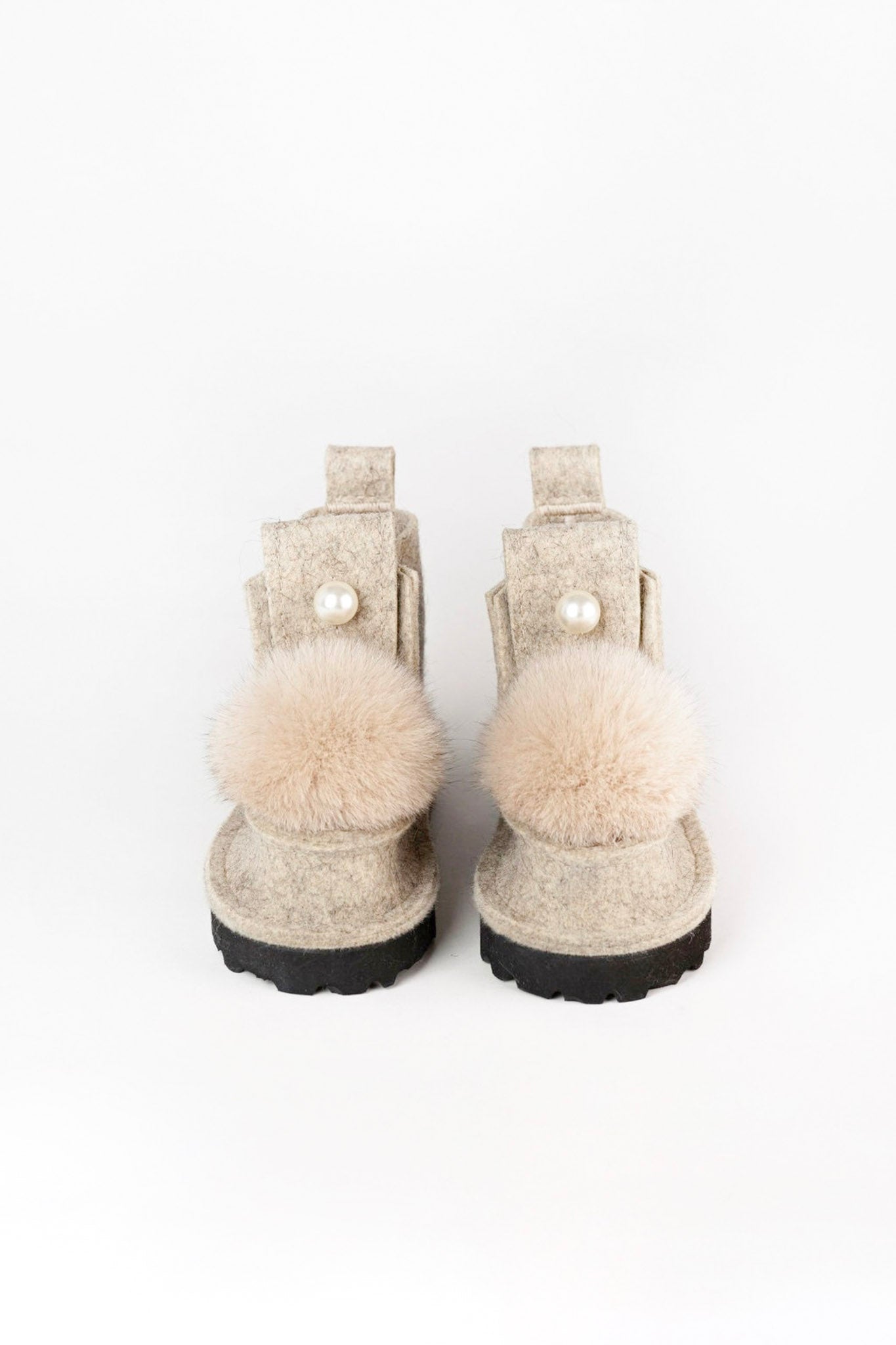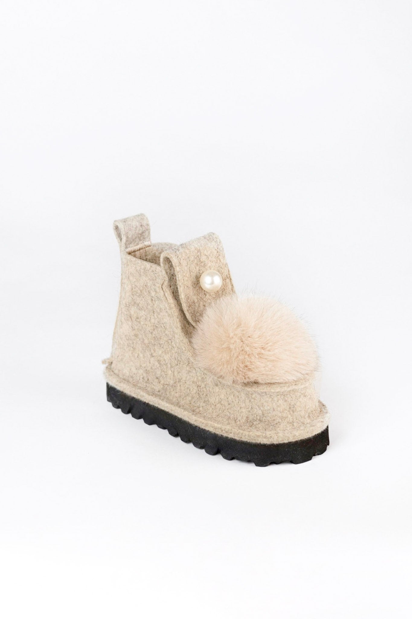 Kauniit beiget huopakengät tuovat lämpöä ja mukavuutta joka askeleeseen. Suomessa käsityönä valmistetut kengät ovat 100 % villaa, mikä tekee niistä kestävät ja luonnollisesti hengittävät. Ulkonäköä täydentävät tyylikäs karvatupsu ja helmikoriste. Kengissä on kestävä EVA-pohjallinen, joka muotoutuu jalkaan ja tarjoaa erinomaisen tuen sekä pitkän käyttöiän. Paksu pohja lisää pehmeyttä ja tekee kävelystä miellyttävää. Huolellinen viimeistely ja tukeva rakenne tekevät näistä huopakengistä käytännöllisen ja kauniin valinnan jokapäiväiseen käyttöön.
