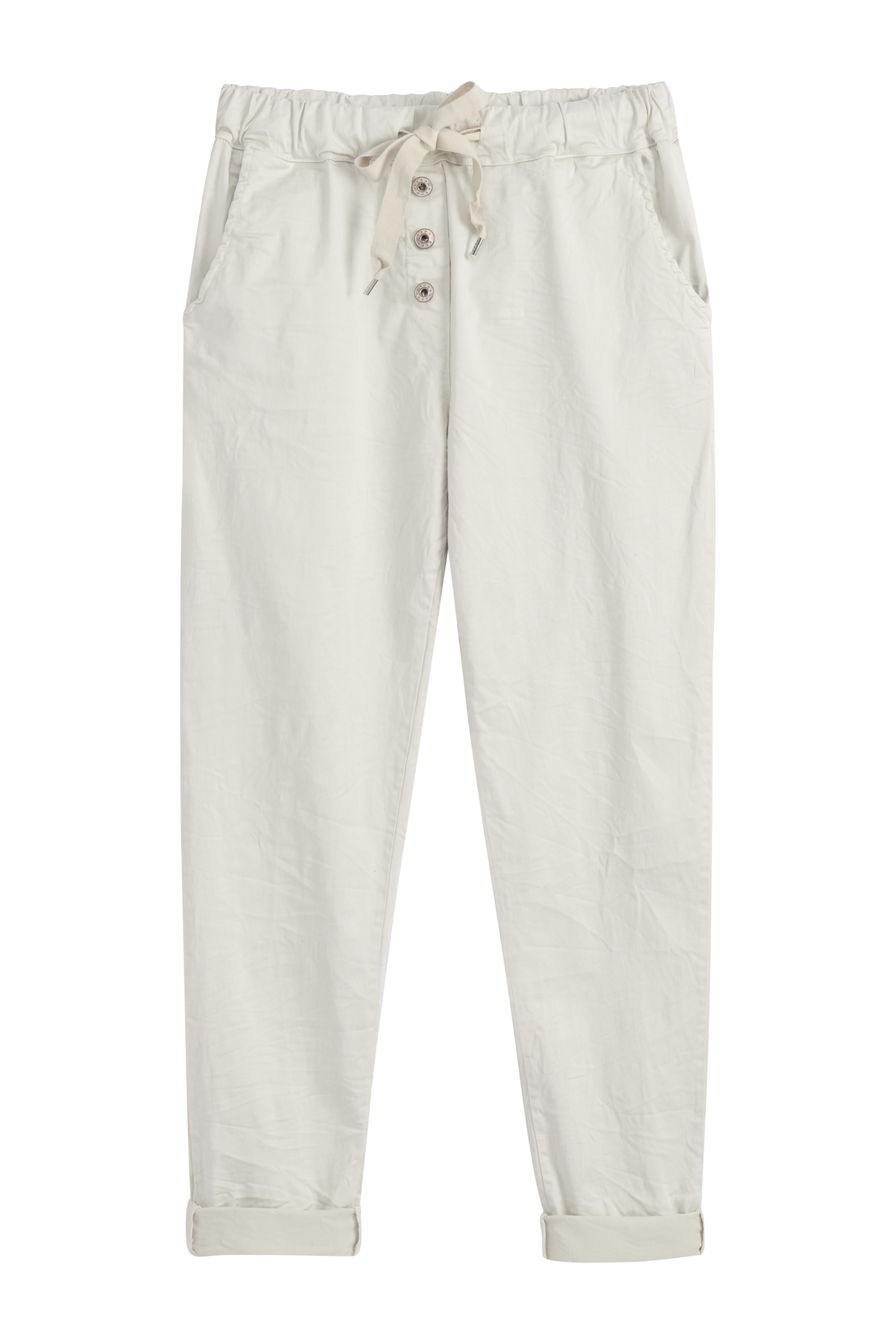 Supermukavat joggerit ihanan pehmeästä tencelistä! Joggereissa on edessä koristeena kolme nappia ja taskut ja ne sujahtavat mukavasti jalkaan. Kiristysnauha vyötäröllä.