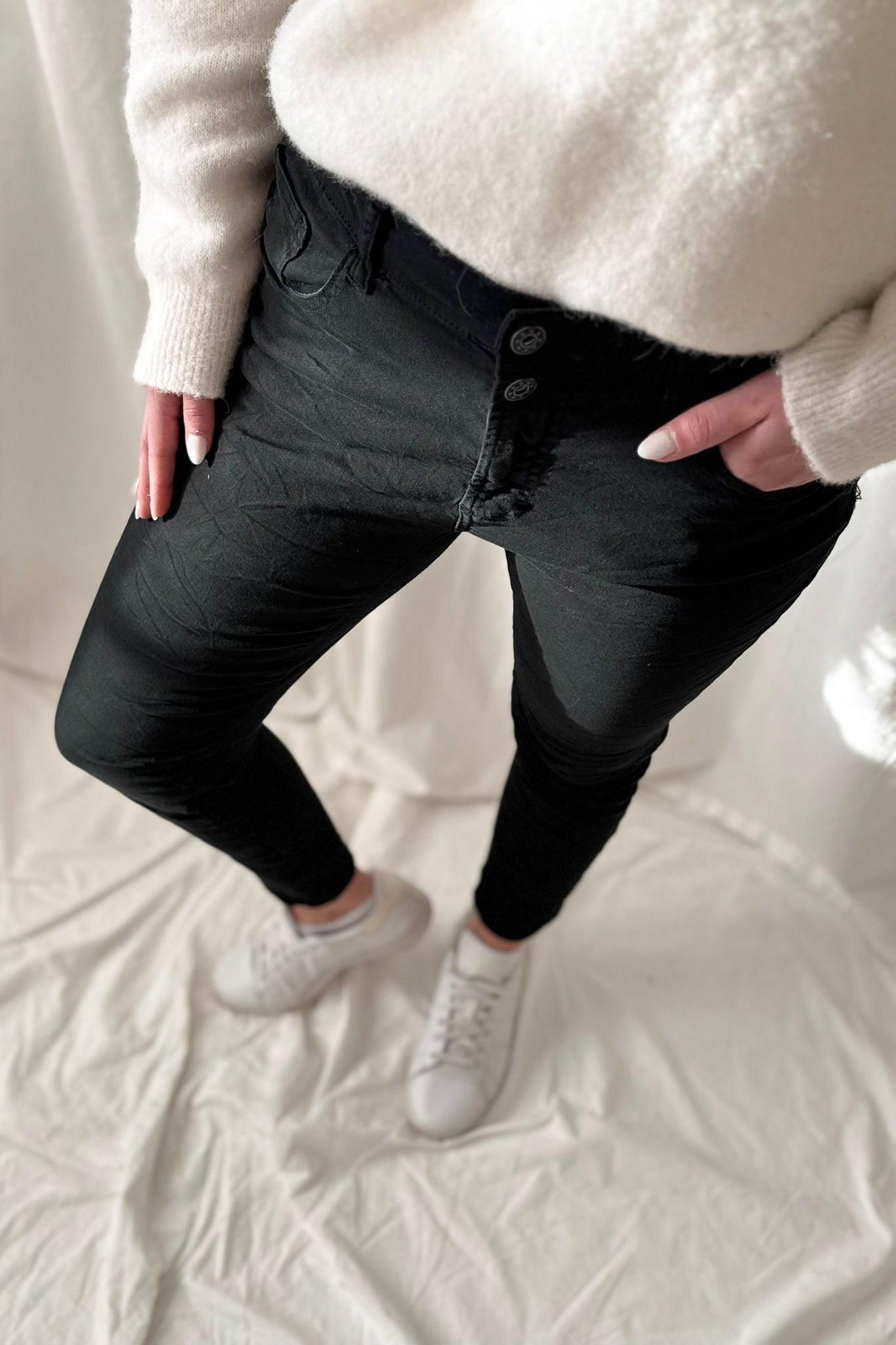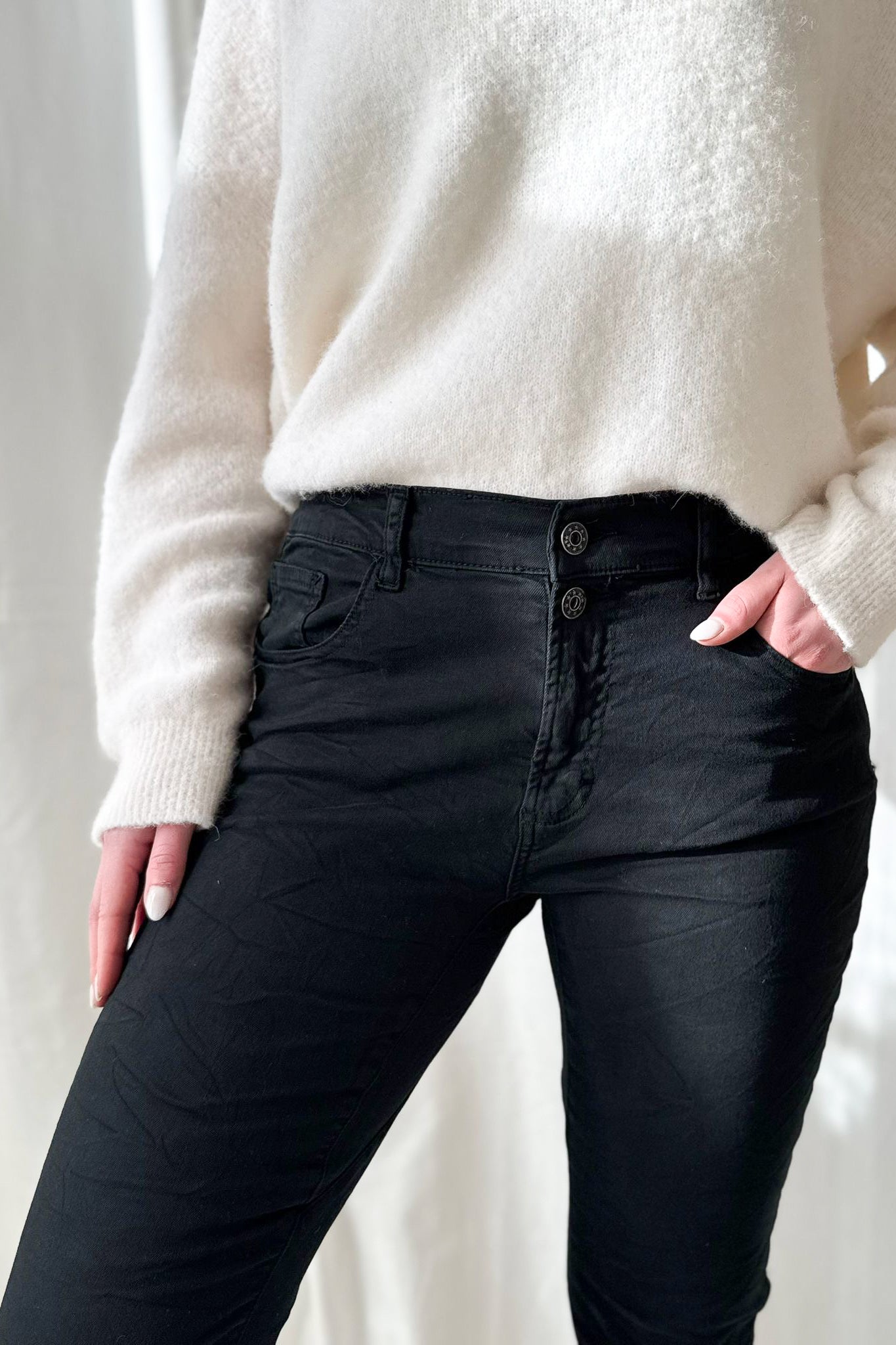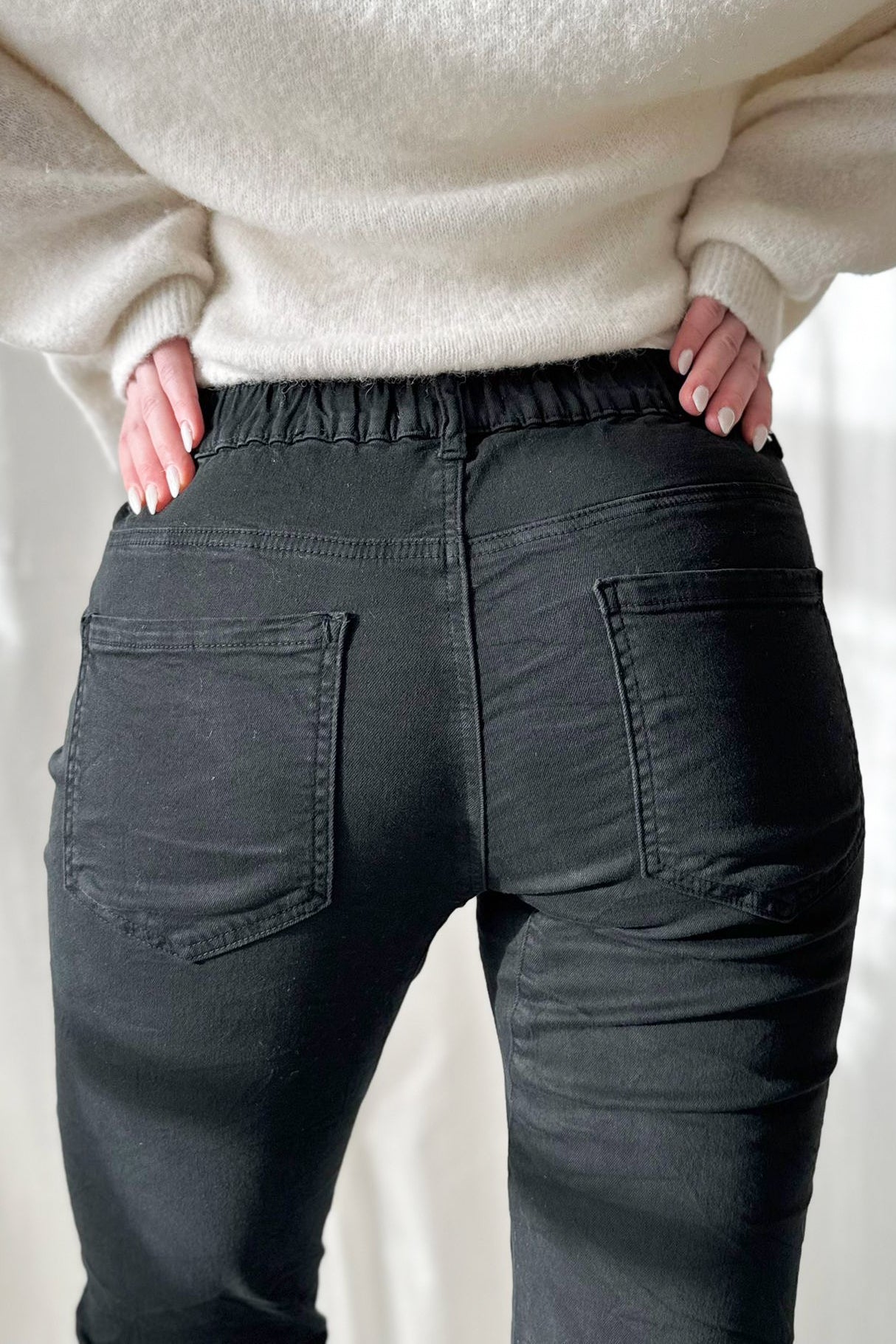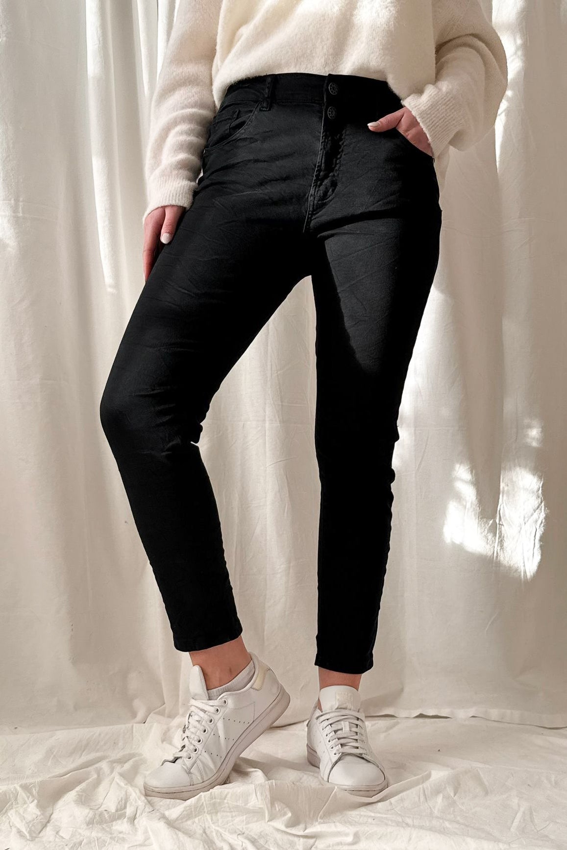 Boyfriend-malli, pehmeää ja hyvin joustavaa stretch materiaalia. Käännetyt lahkeet ja kuminauhavyötärö takana. Rento malli, joka on miellyttävä päällä.