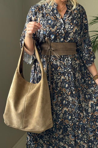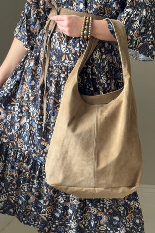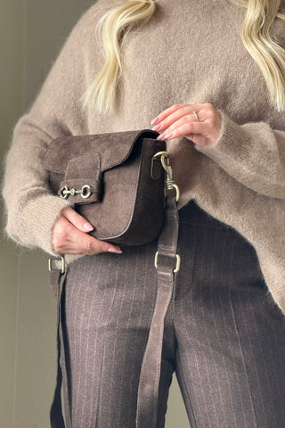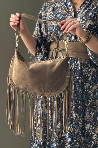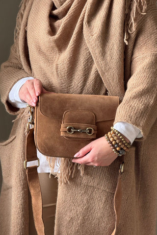 Lämminsävyinen ruskea nahkalaukku tuo asuun boheemia pehmeyttä ja maanläheistä harmoniaa. Ruskea väri sopii erinomaisesti yhteen pellavan, villan ja muiden luonnonmateriaalien kanssa – se on luonnollinen valinta rentoon ja ajattomaan tyyliin.