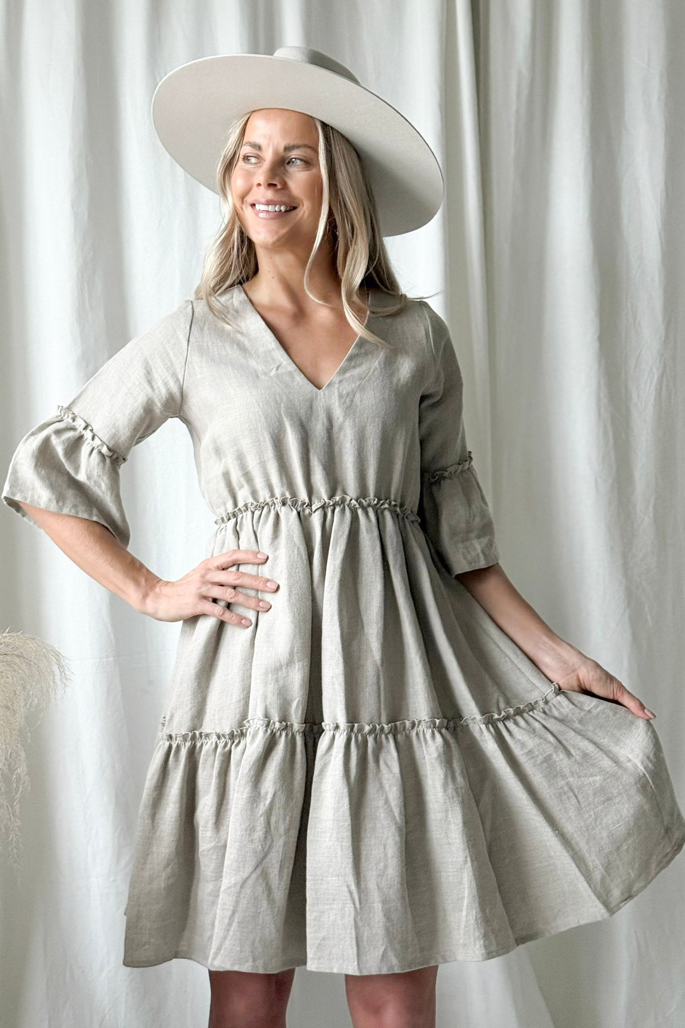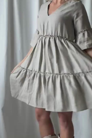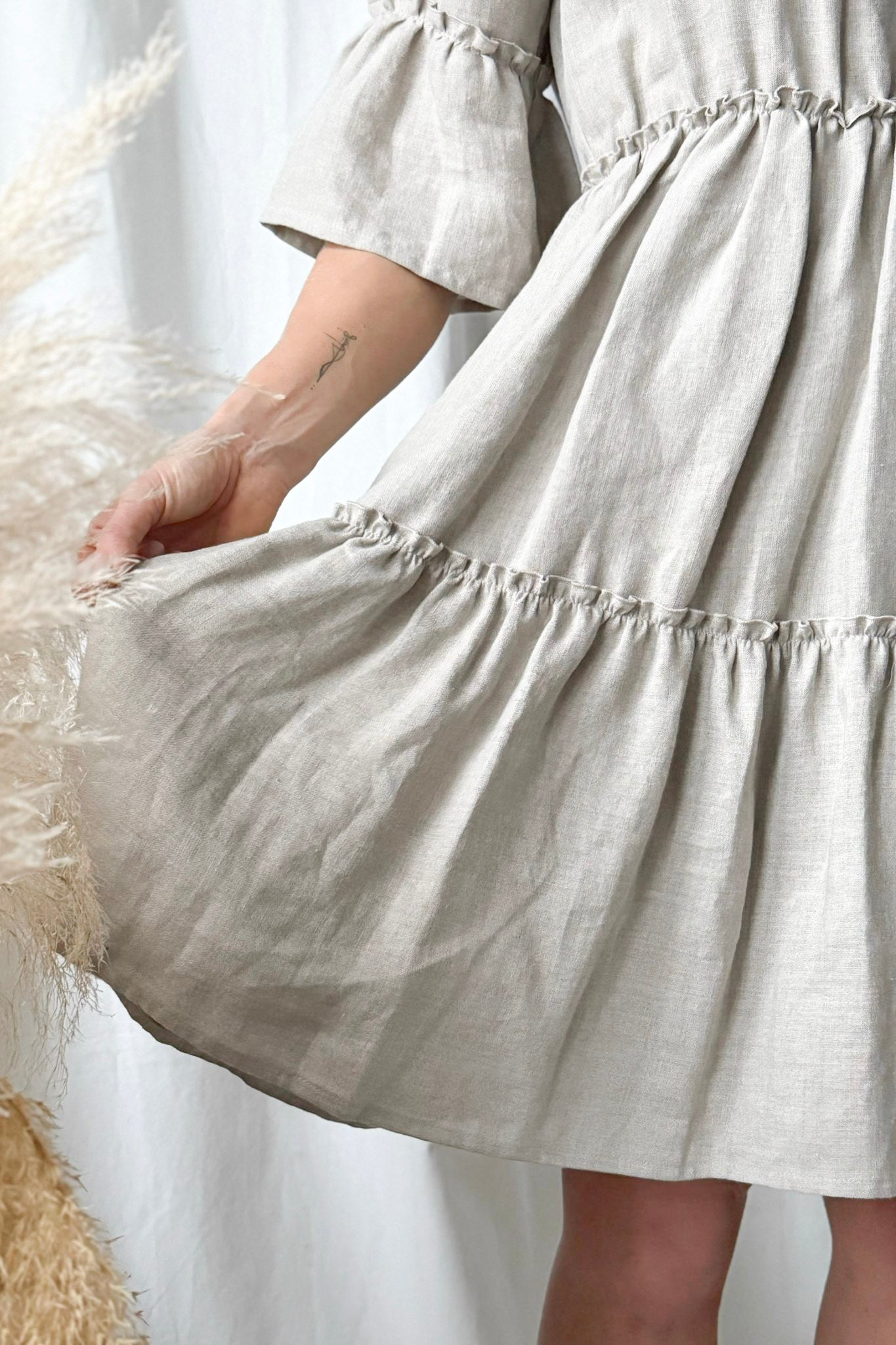 A-linjainen pellavamekko, jossa rypytys vyötäröllä ja V-pääntie. Helmassa kaunis frilla. Puolipitkissä hihoissa frillat hihansuissa.
