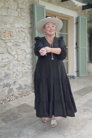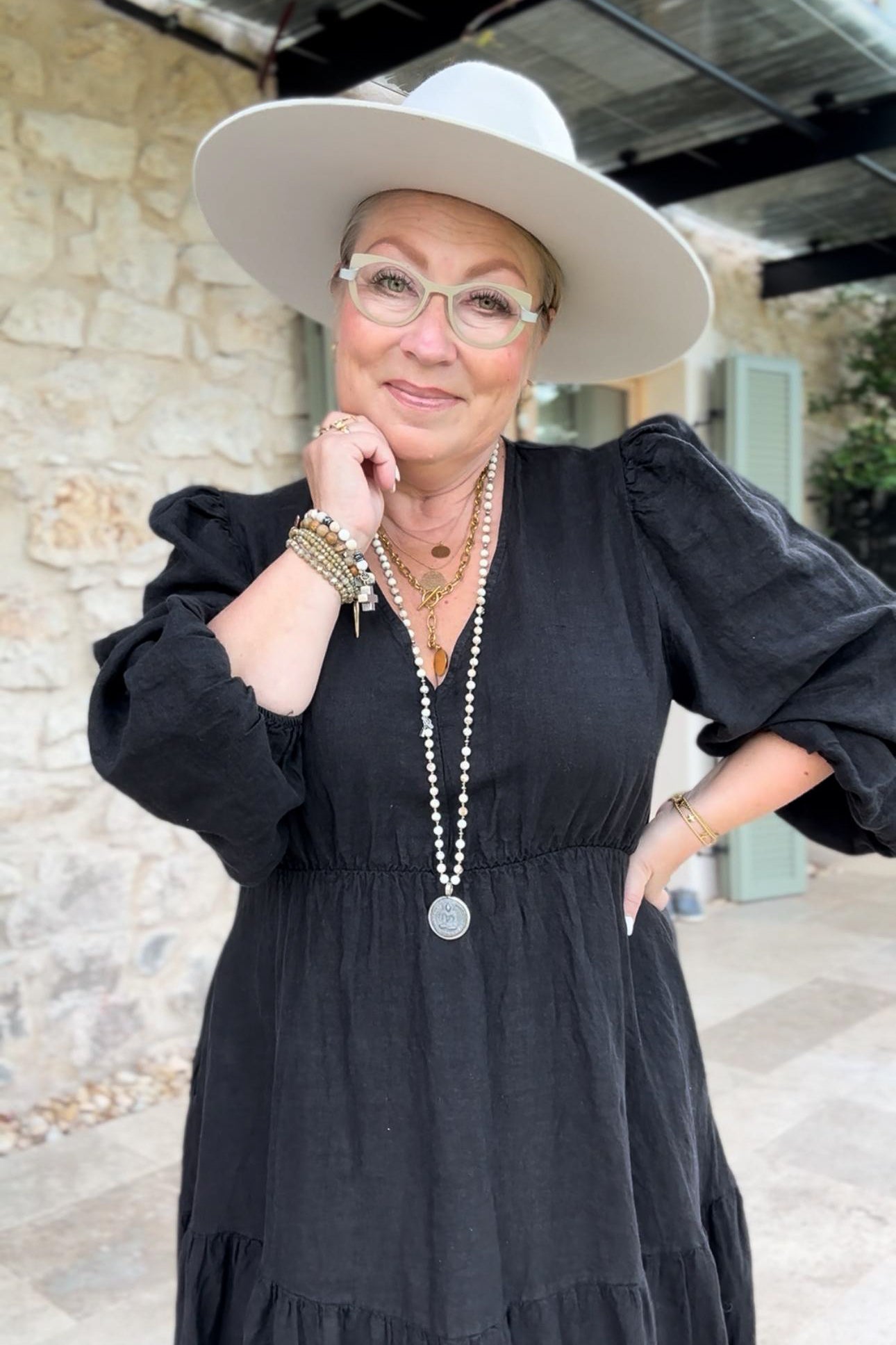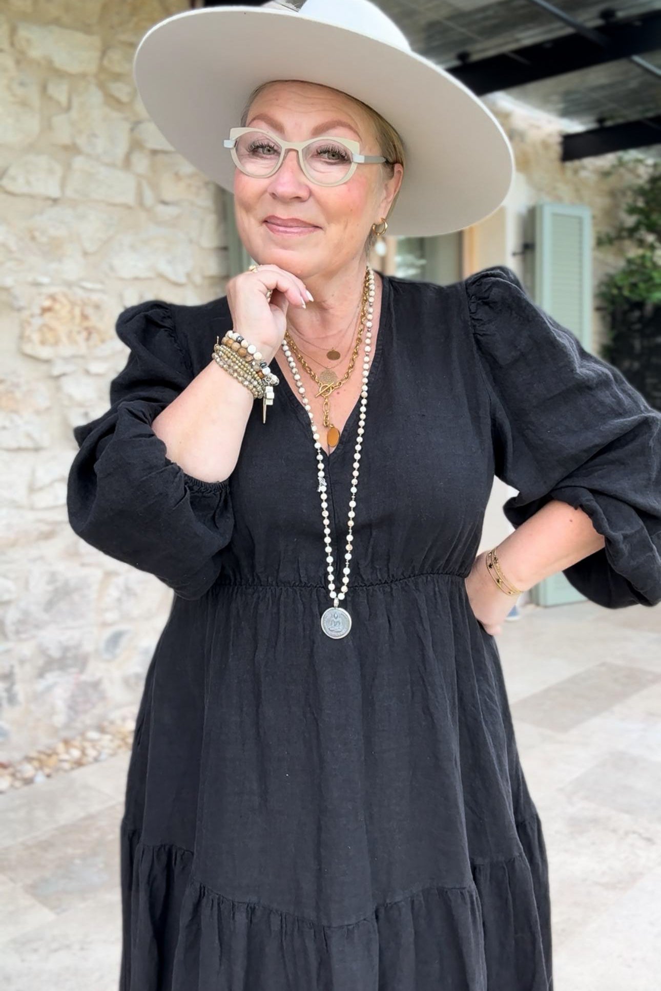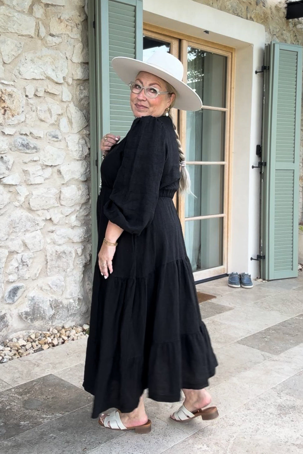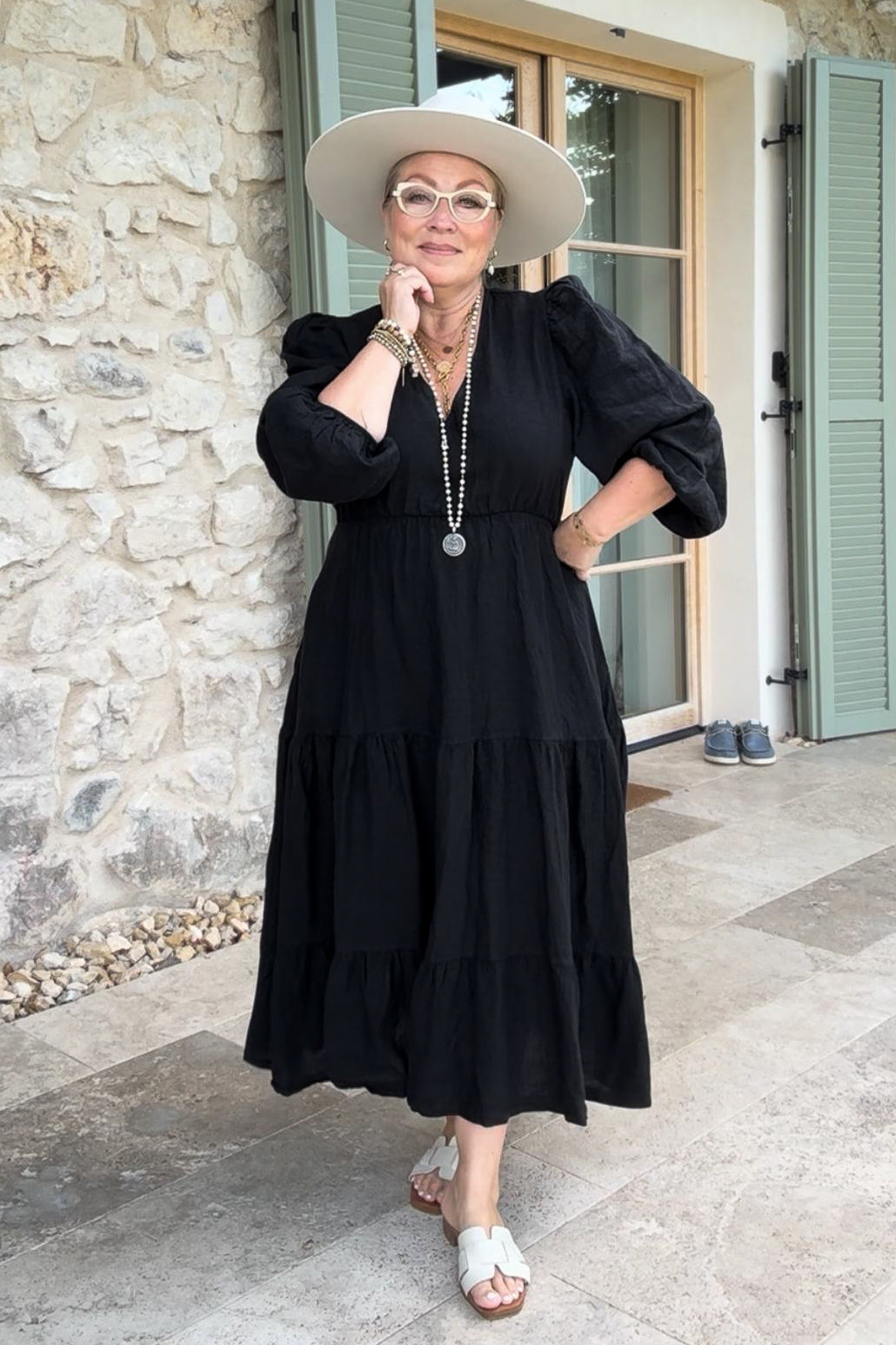 Kaunis frilloin koristeltu pellavamekko, jossa v-pääntie ja puhvitetut hihat. Sivuissa kätevät taskut ja vyötäröllä joustava kuminauha.