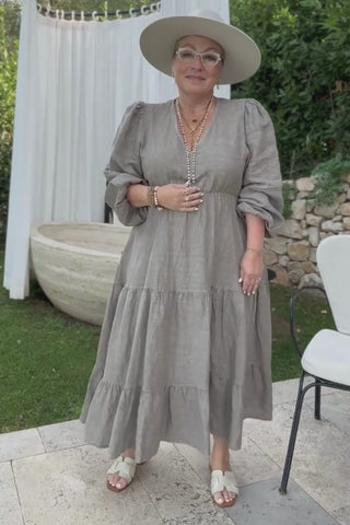 Kaunis frilloin koristeltu pellavamekko, jossa v-pääntie ja puhvitetut hihat. Sivuissa kätevät taskut ja vyötäröllä joustava kuminauha.