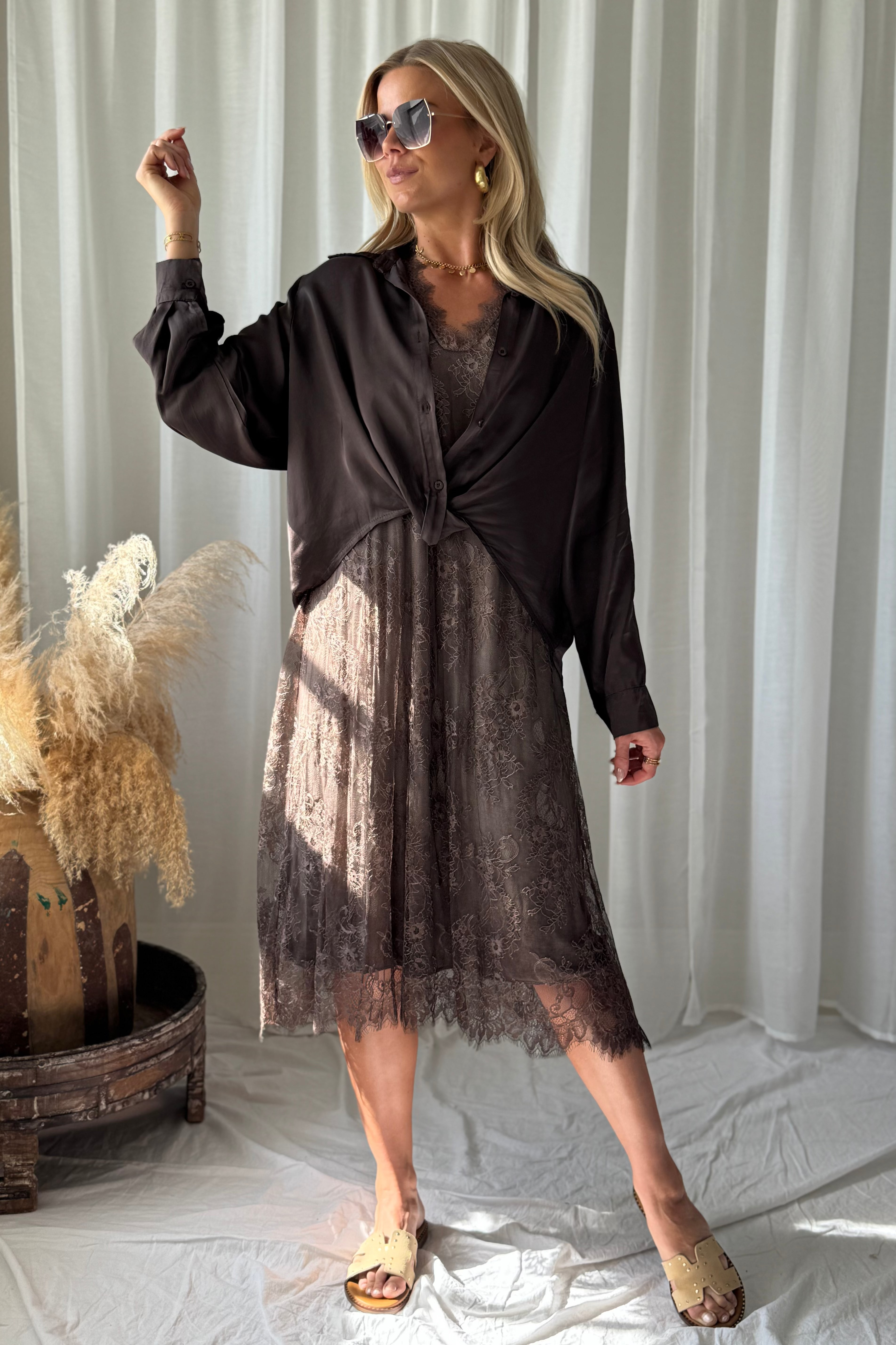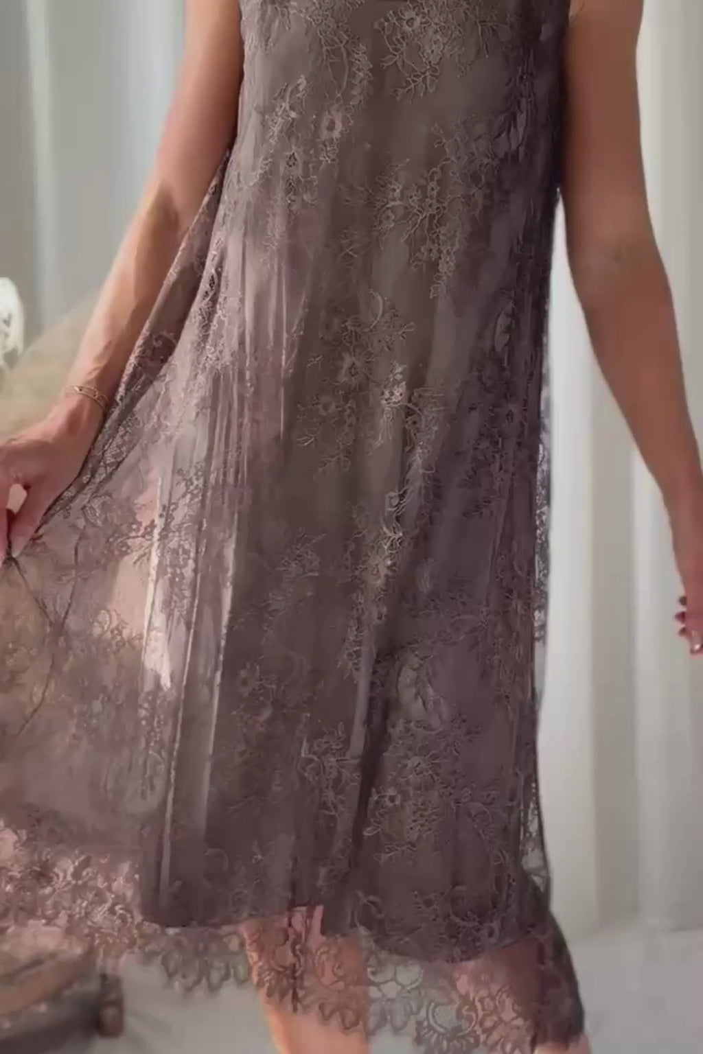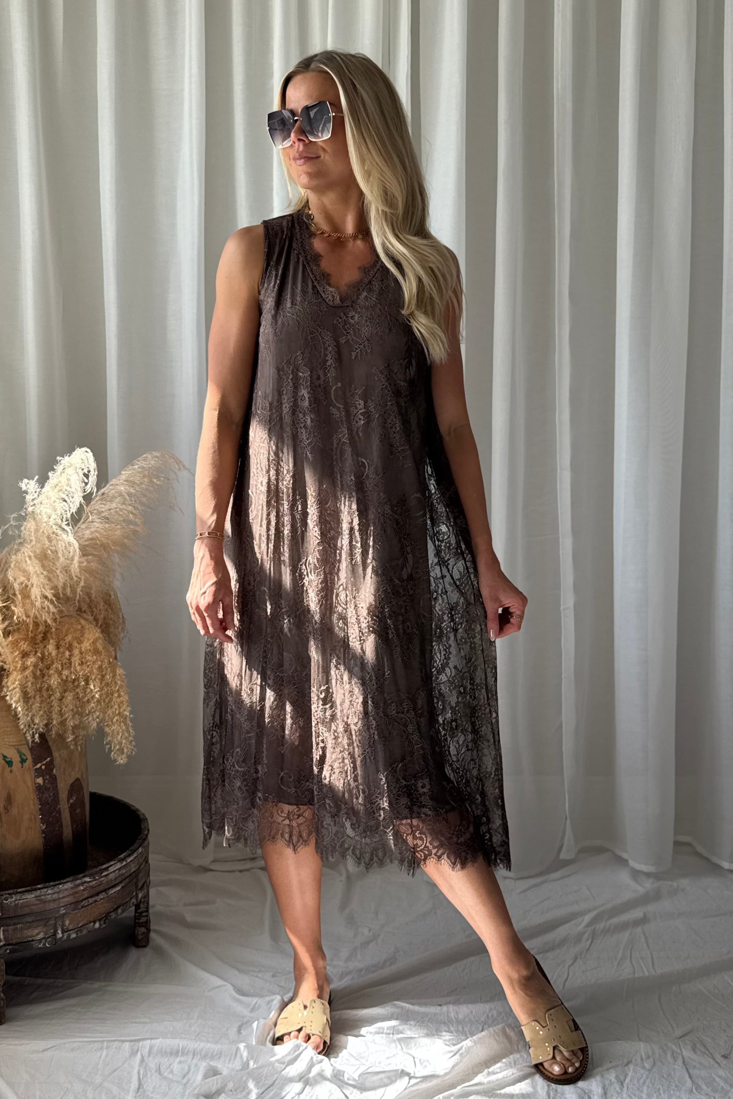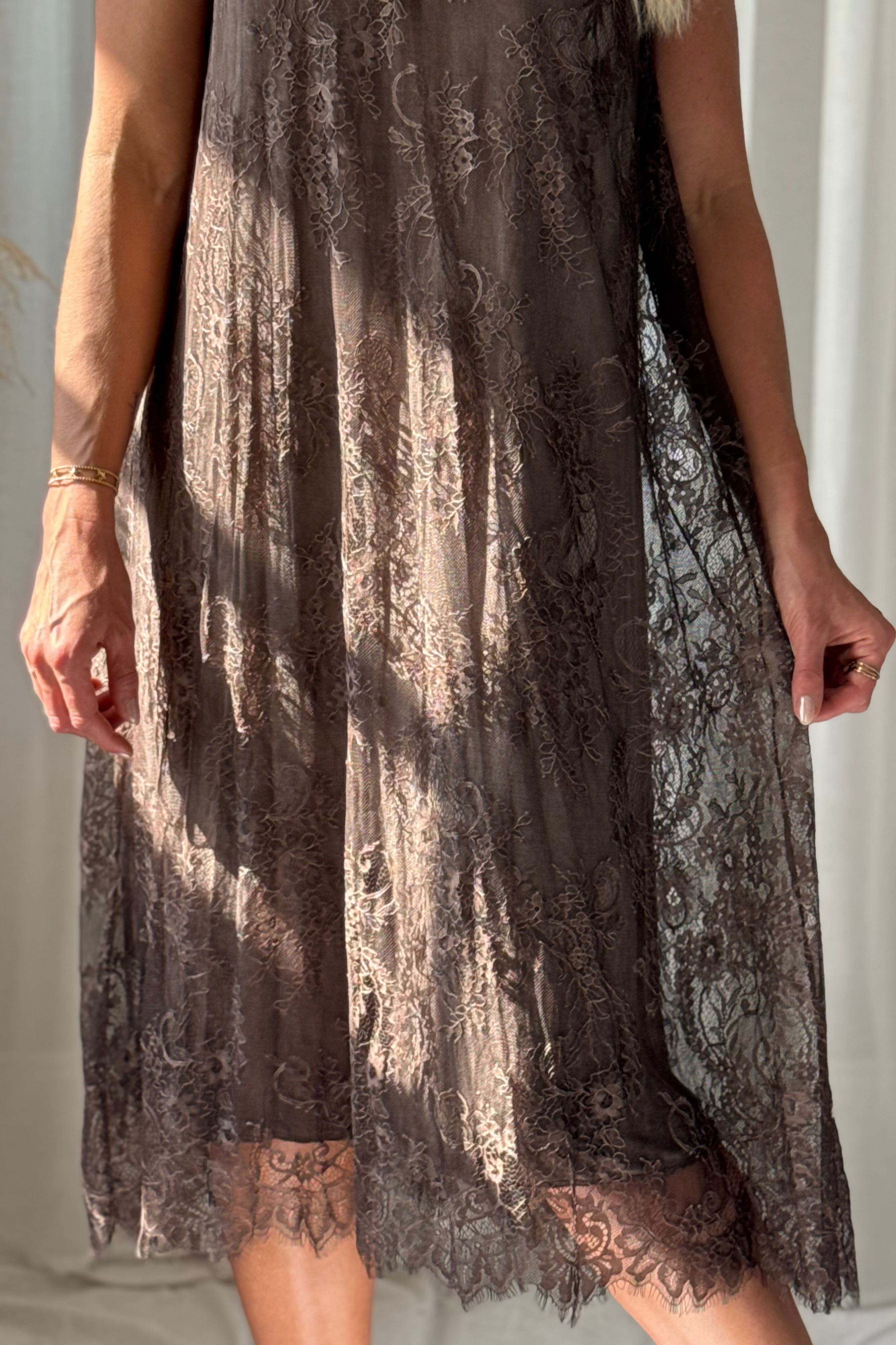 Hihaton pitsimekko, jossa on imarteleva V-pääntie ja kevyt, väljä istuvuus. Mekko on kauttaaltaan herkkää pitsiä ja siinä on kauniisti laskeutuva helma, jota viimeistelee elegantti pitsireunus. Tämä romanttinen mekko hurmaa ilmavuudellaan ja kauniilla yksityiskohdillaan. Materiaali on hieman joustavaa, mikä lisää käyttömukavuutta ja istuvuutta.