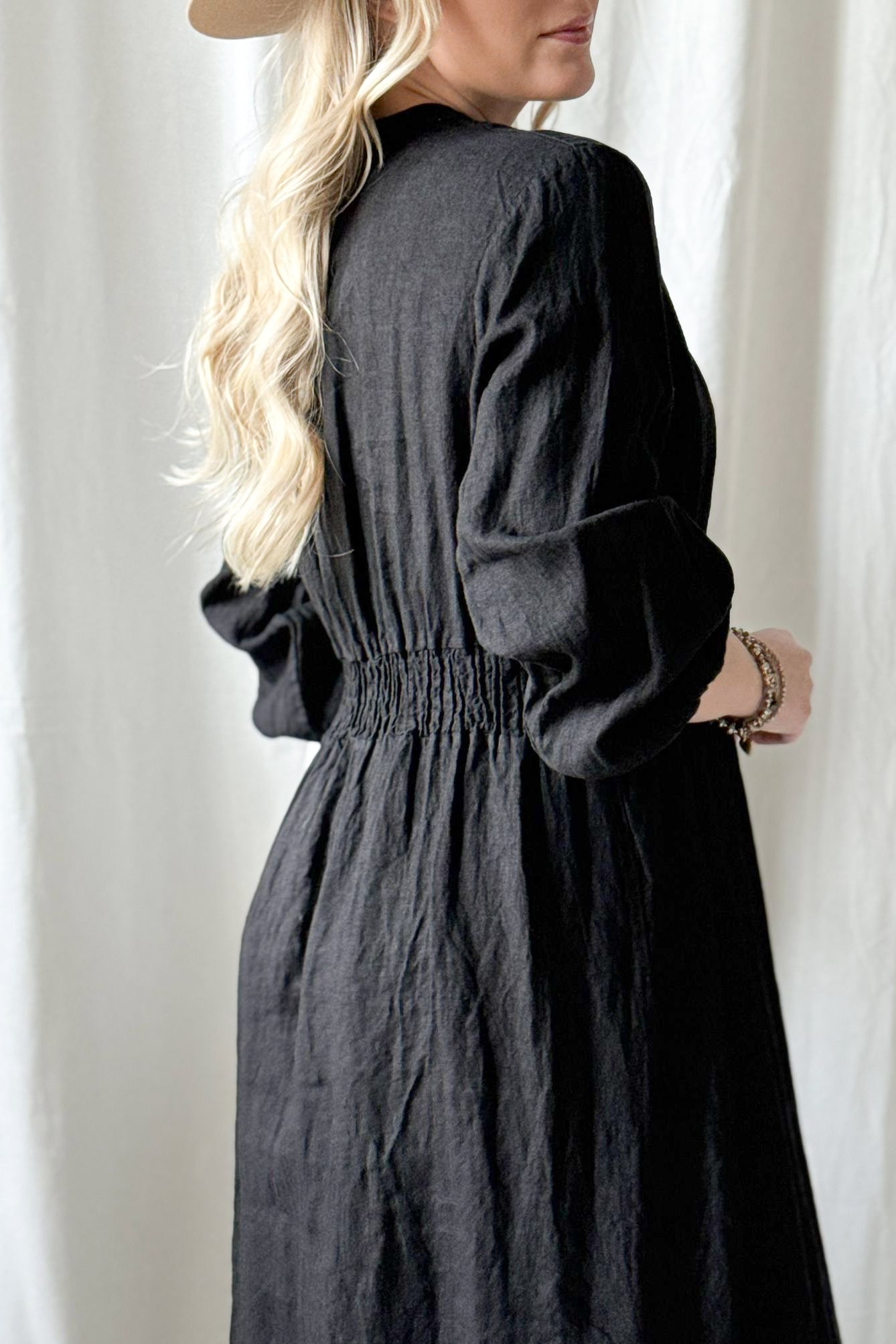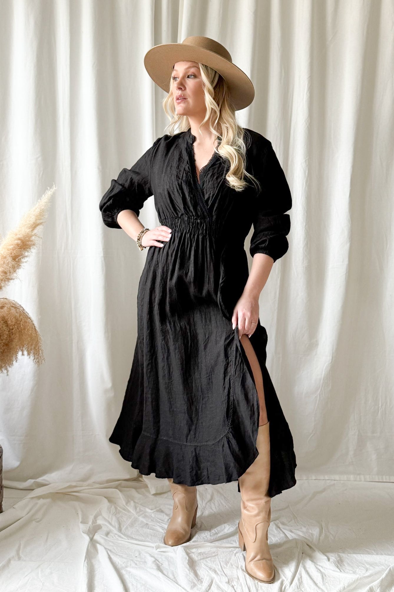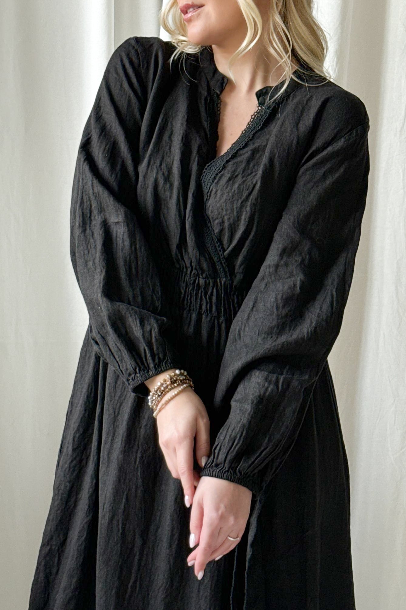 Kauniisti laskeutuva, rento pellavamekko, jossa on pitsinauhayksityiskohta edessä, V-muotoinen pääntie, kuminauharypytys vyötäröllä ja hihansuissa. Mekossa on pitkät hihat sekä helmassa kaunis halkioyksityiskohta.