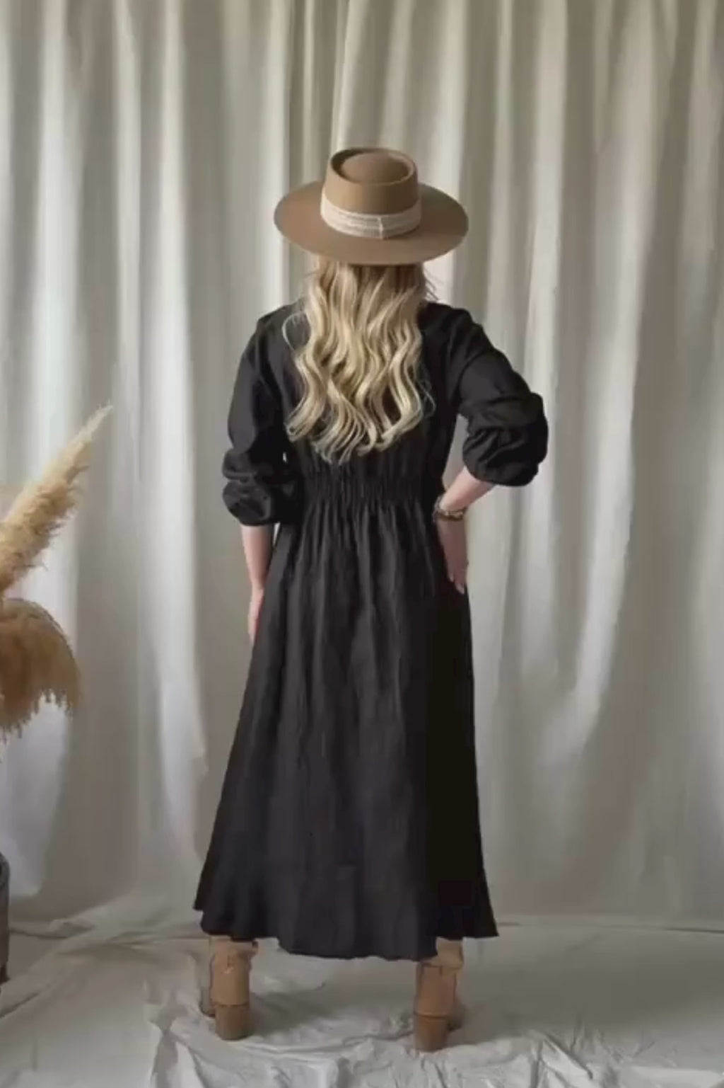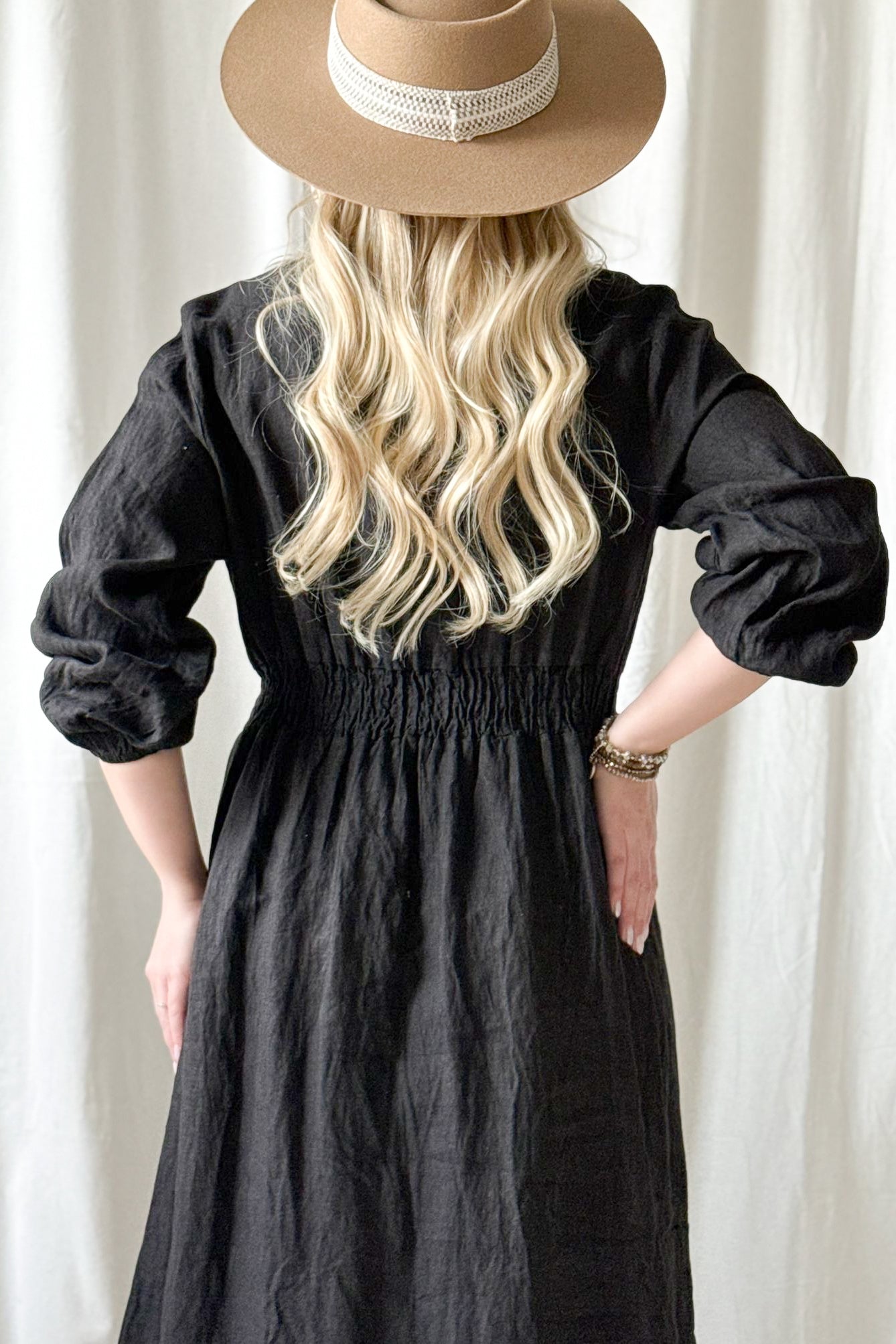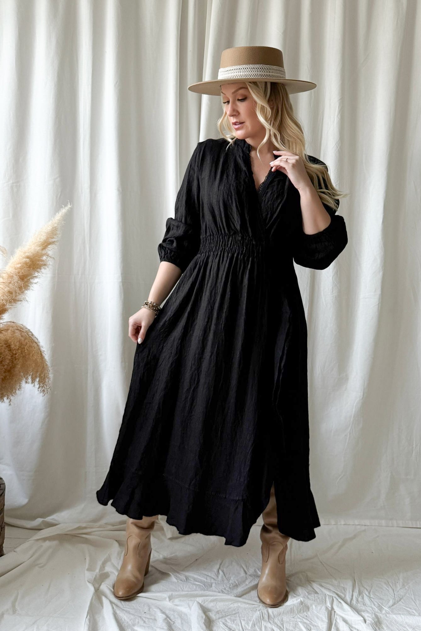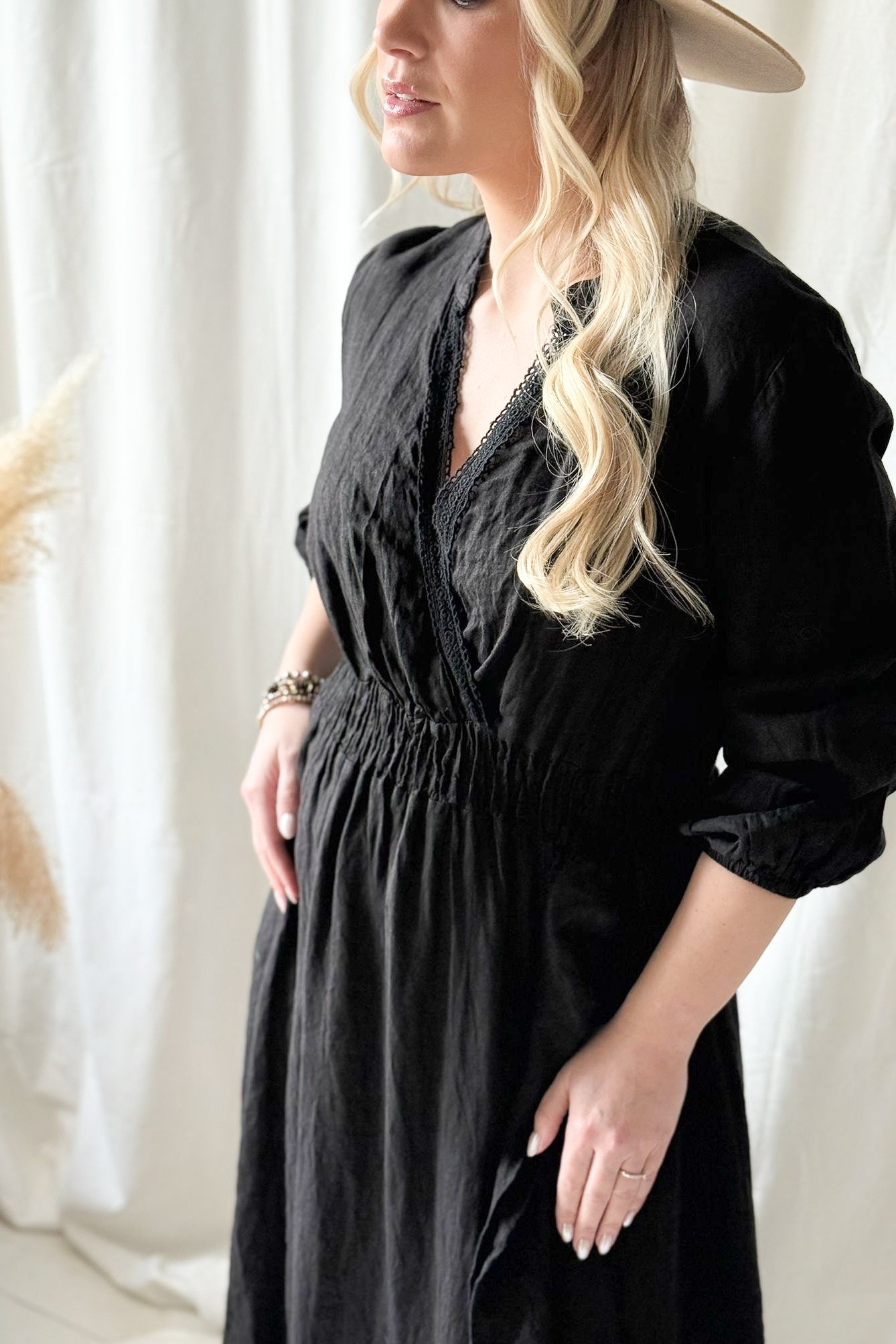 Kauniisti laskeutuva, rento pellavamekko, jossa on pitsinauhayksityiskohta edessä, V-muotoinen pääntie, kuminauharypytys vyötäröllä ja hihansuissa. Mekossa on pitkät hihat sekä helmassa kaunis halkioyksityiskohta.