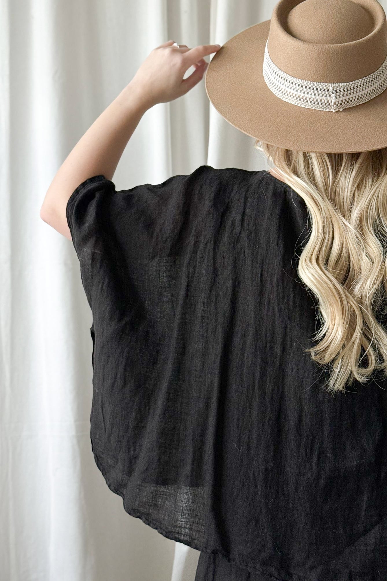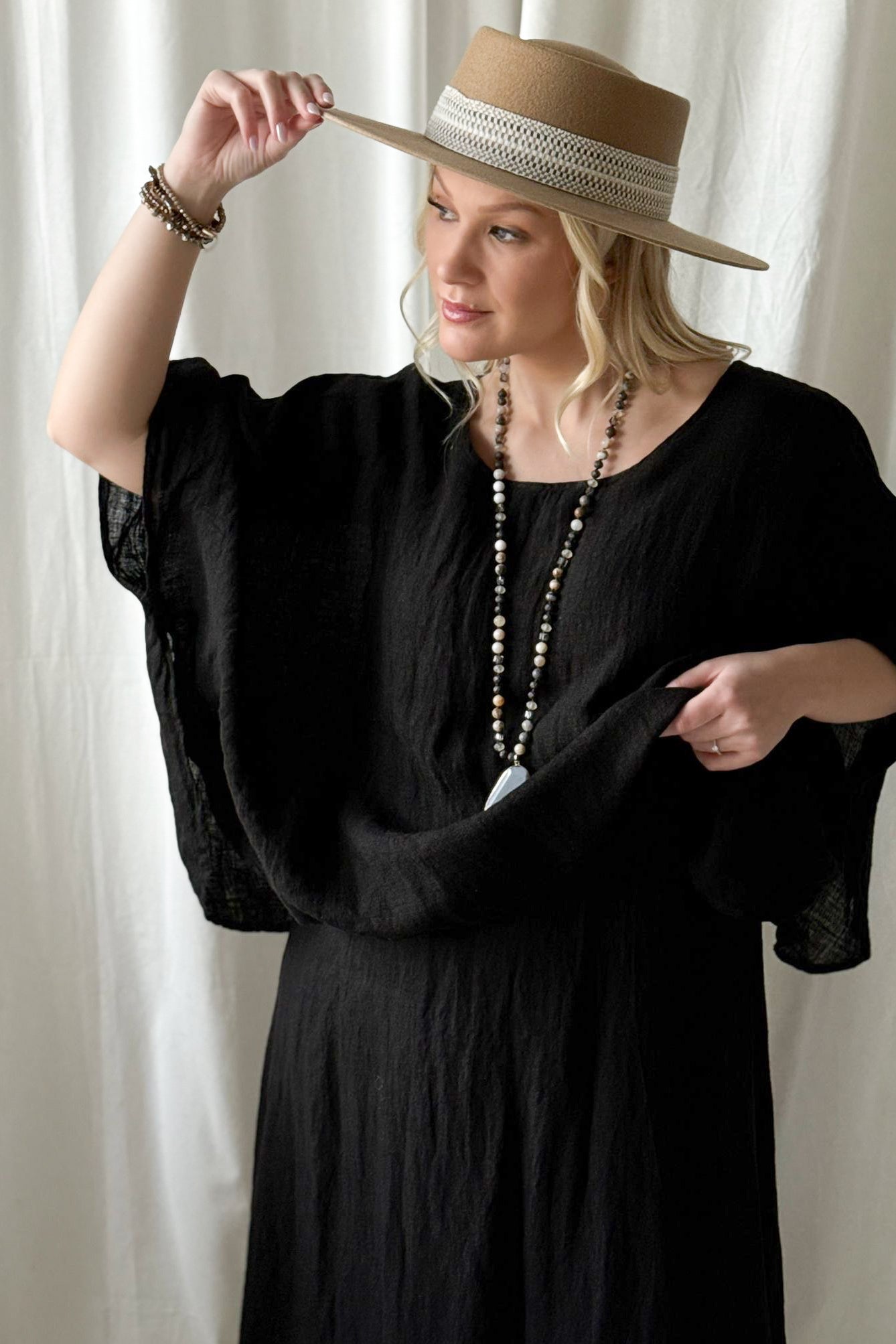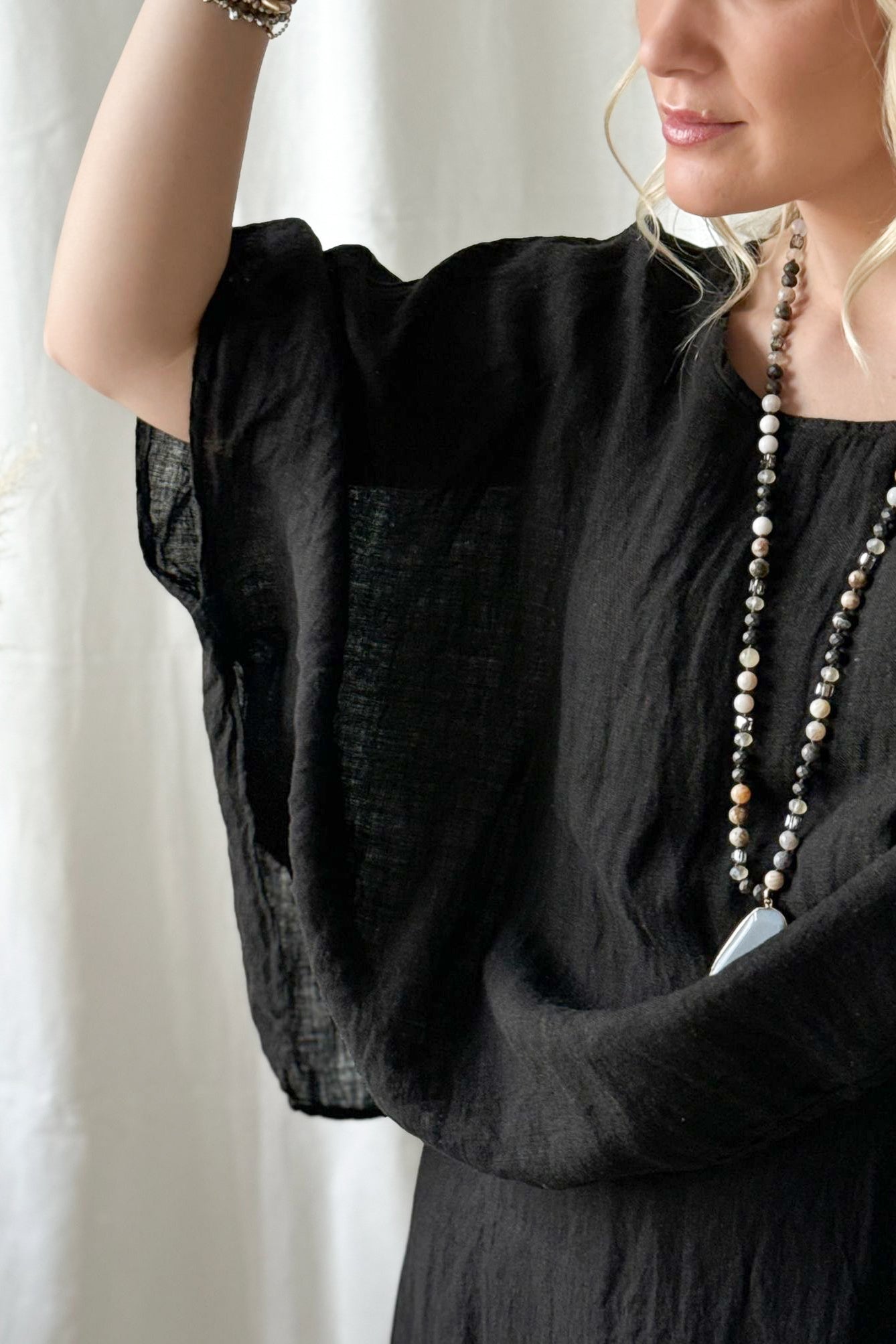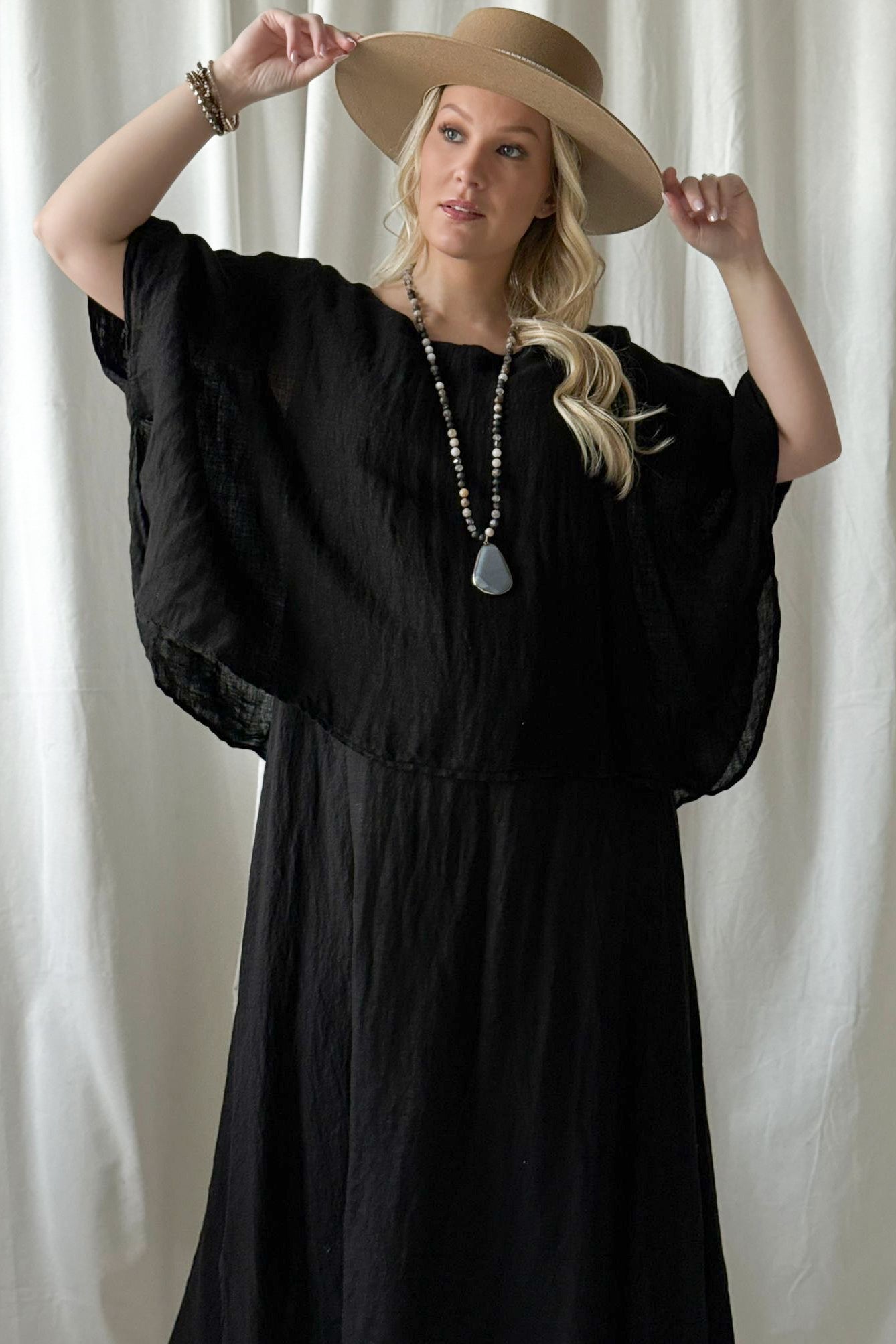 Ihana One-piece pellavamekko, jossa rento, liehuva lookki. Mekko koostuu alaosan mekosta, jossa päällä kiinteästi rento yläosa harsomaista pellavaa. Ihanan rento asu arjen ja juhlan menoihin.