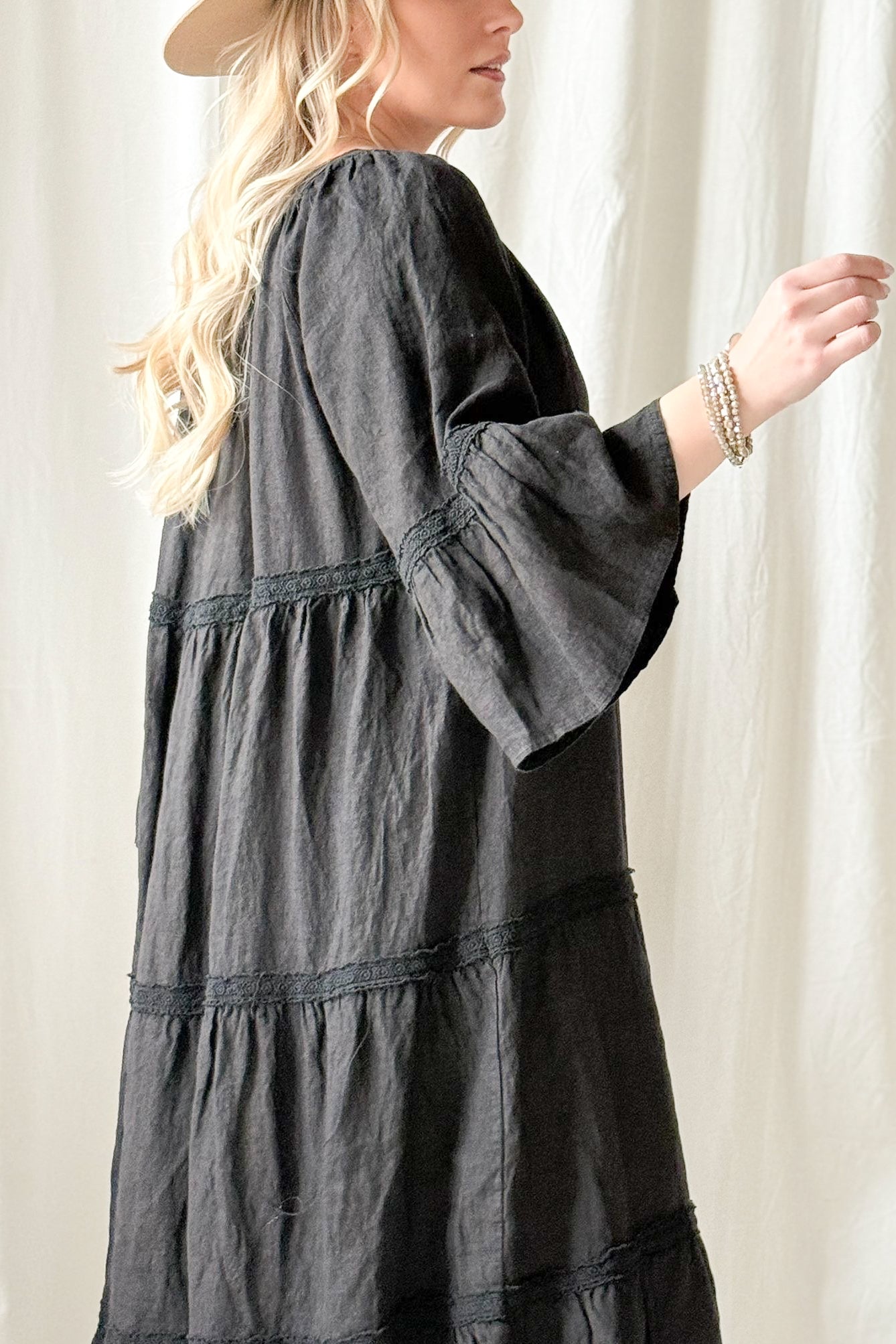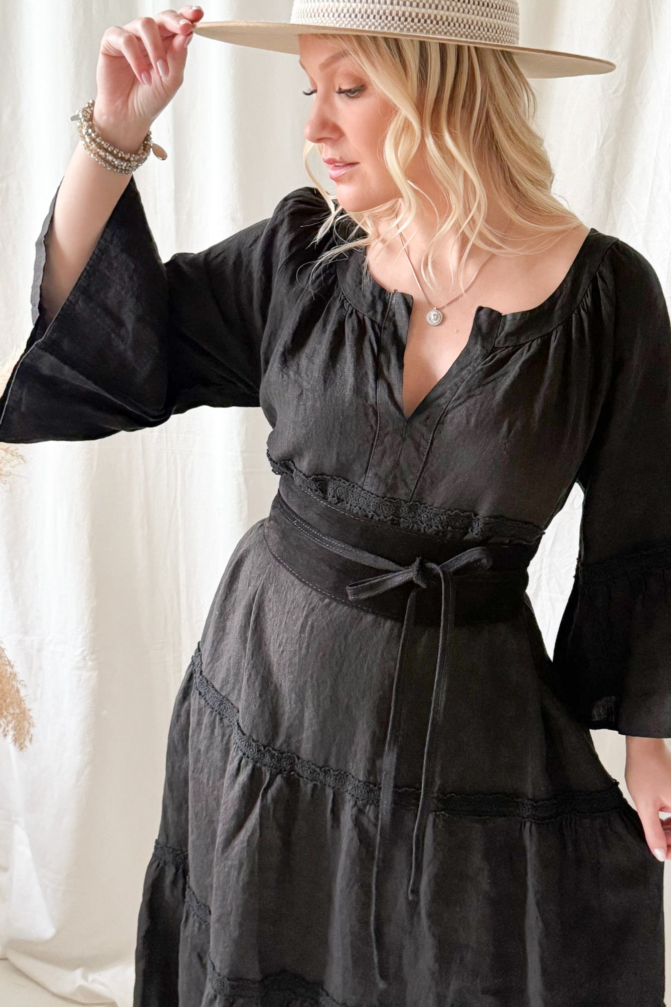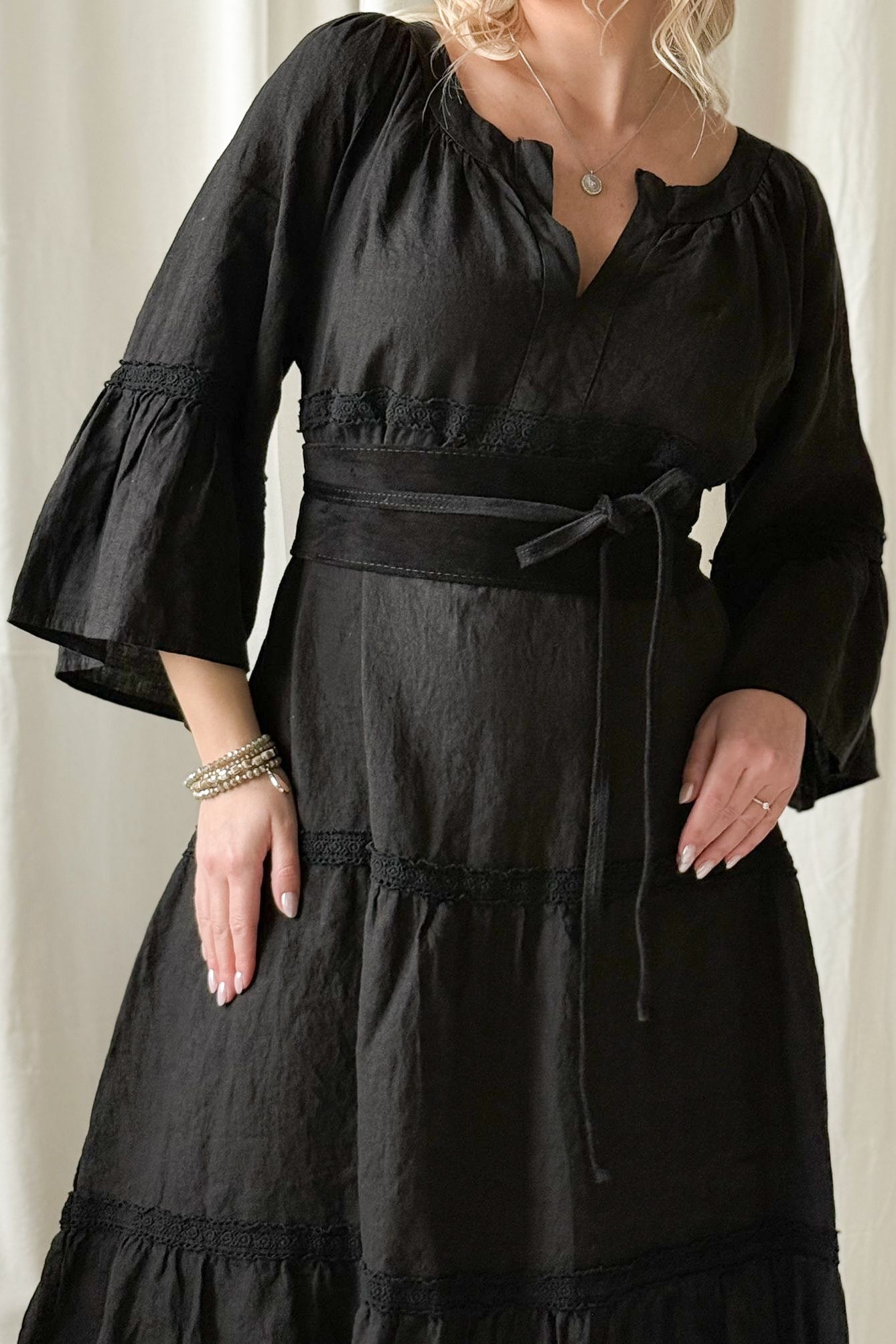 Kaunis pitsinauhoin koristeltu rento ja huoleton pellavamekko, jossa kaunis V-yksityiskohta edessä ja rennot, kauniisti laskeutuvat hihat. Pue rennosti liehuen tai pue vyön kanssa korostaaksesi vyötäröä.