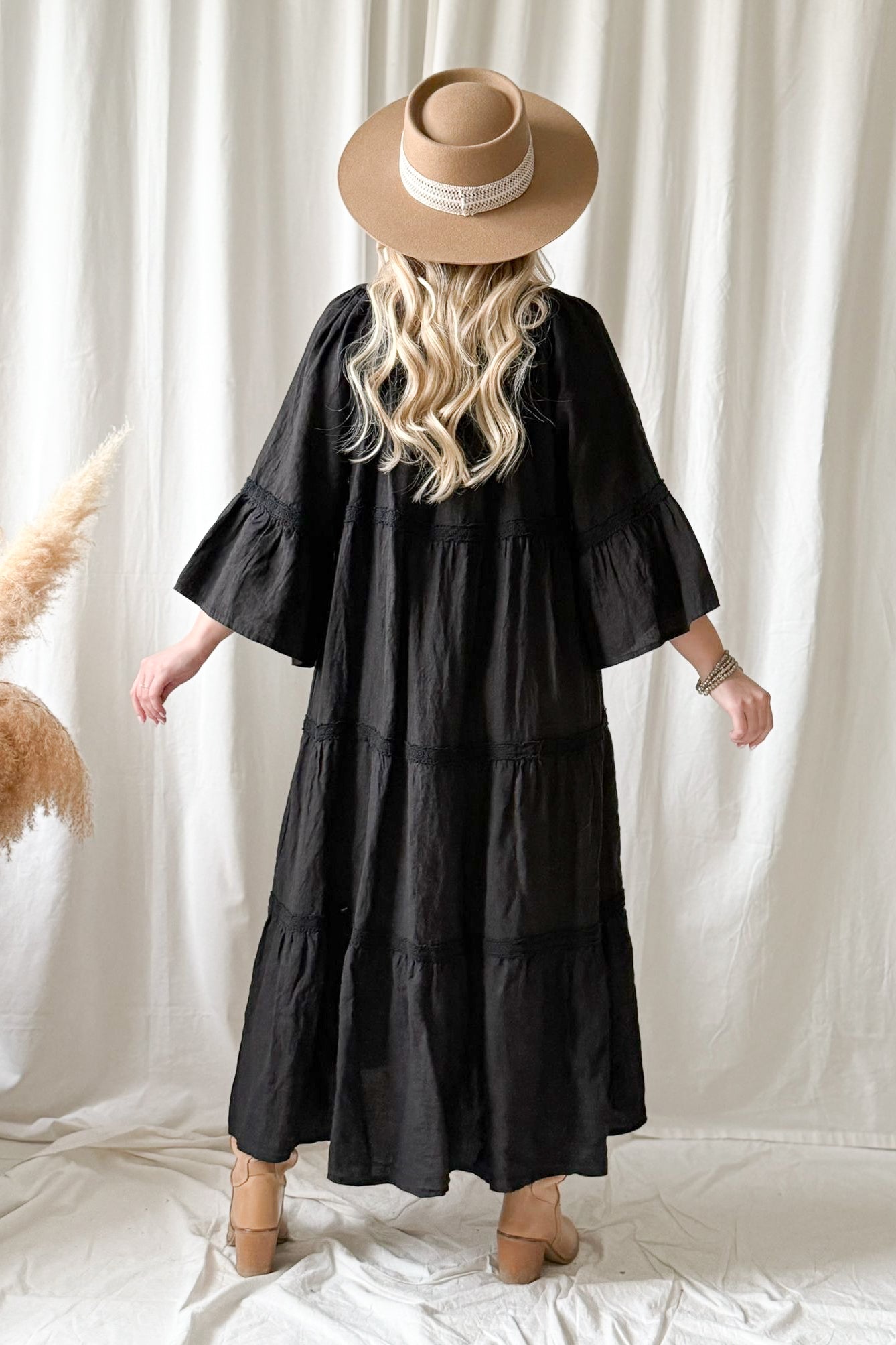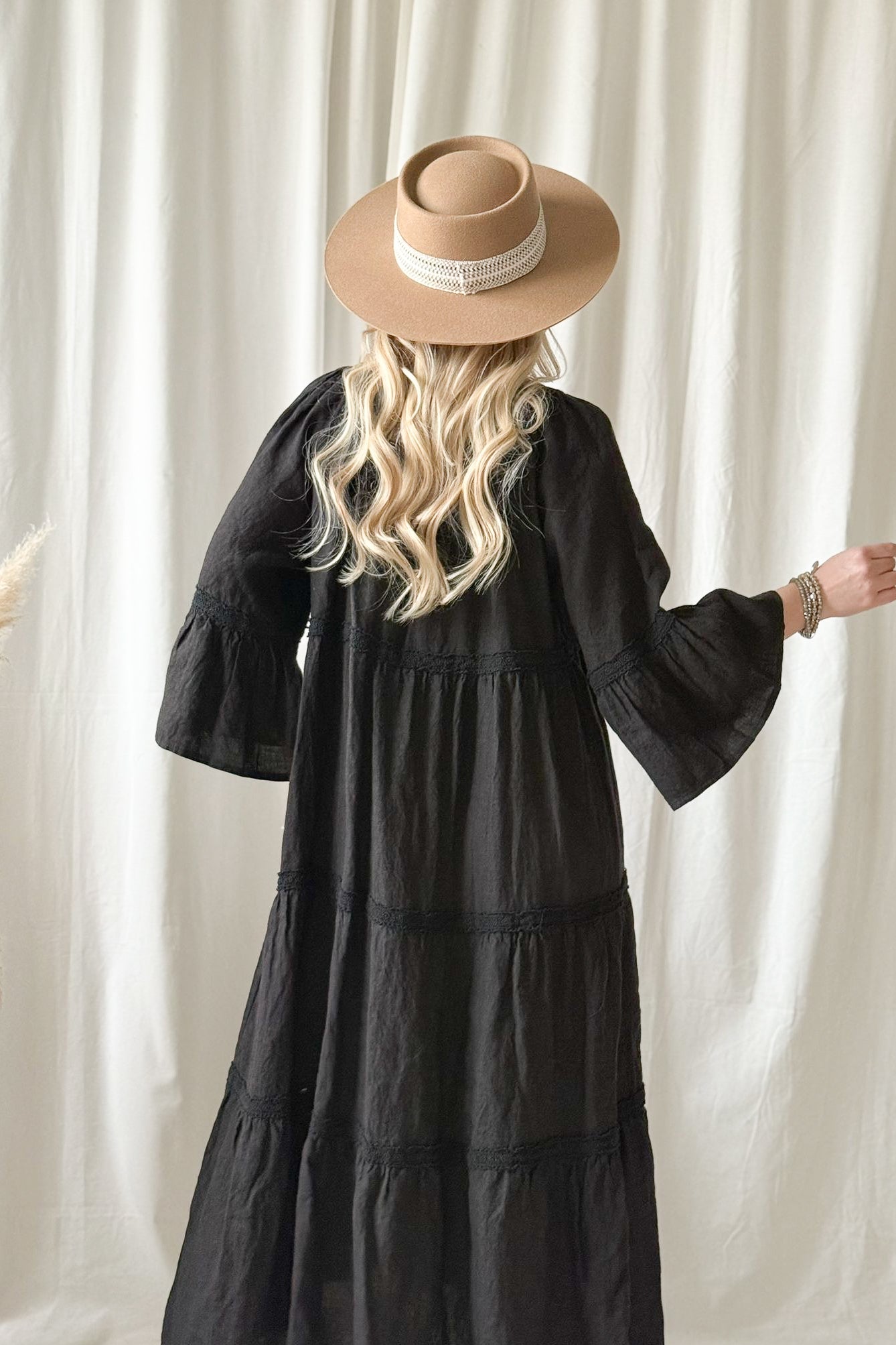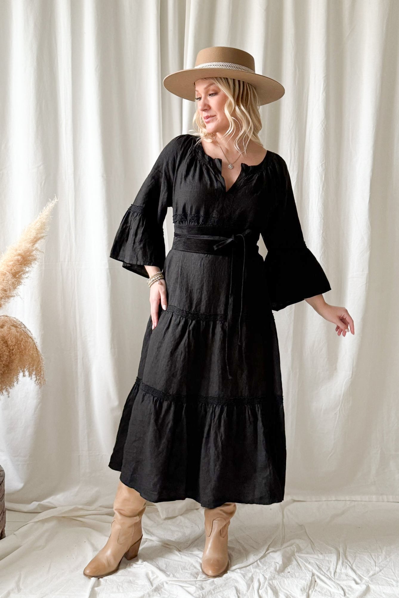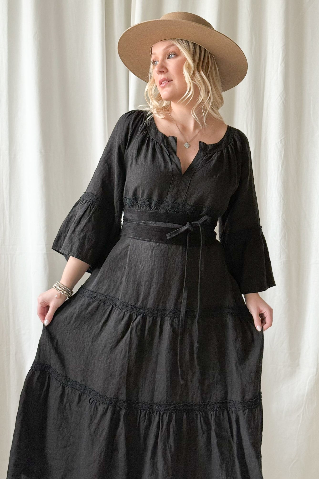 Kaunis pitsinauhoin koristeltu rento ja huoleton pellavamekko, jossa kaunis V-yksityiskohta edessä ja rennot, kauniisti laskeutuvat hihat. Pue rennosti liehuen tai pue vyön kanssa korostaaksesi vyötäröä.