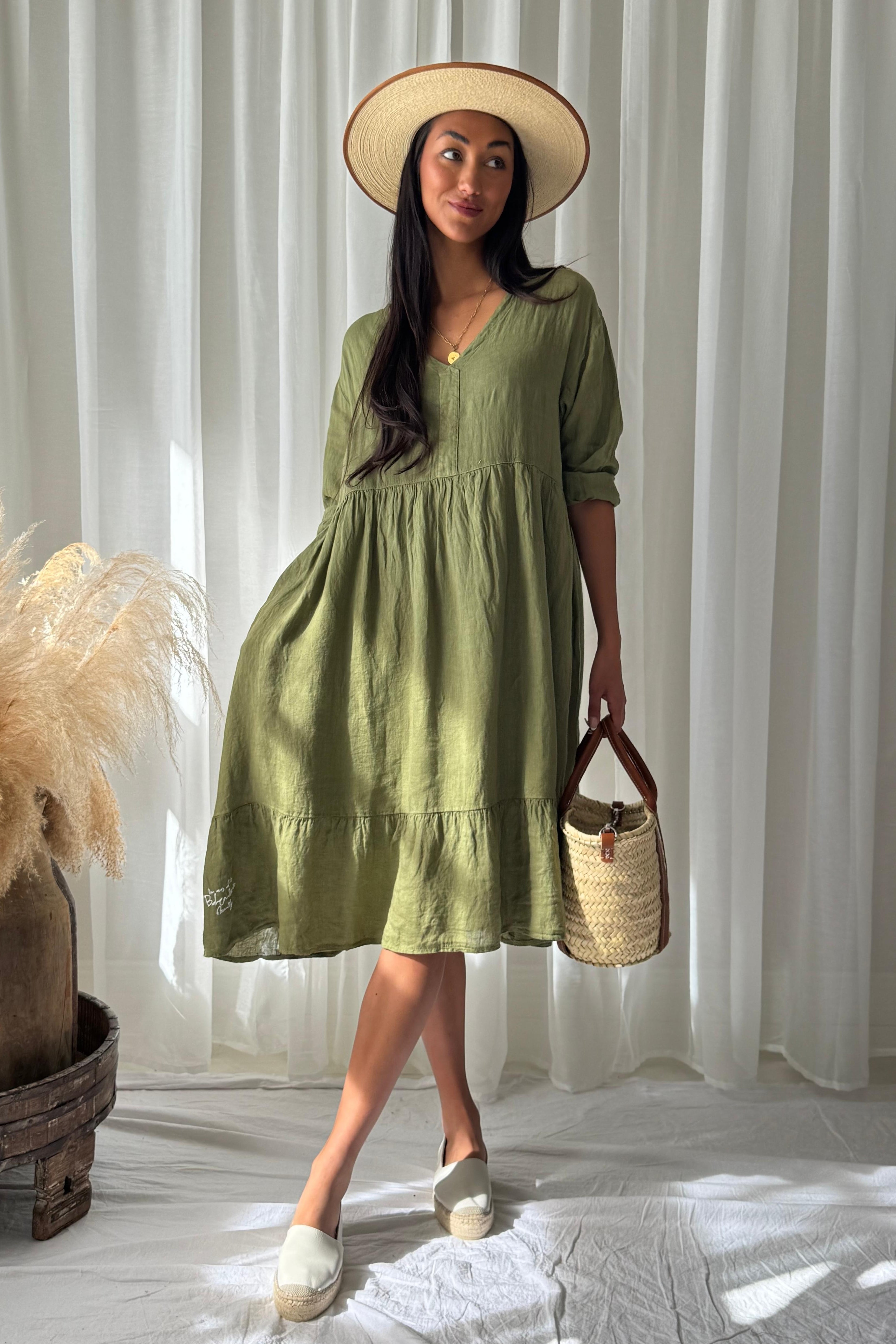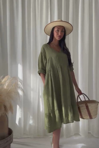 Kevyt ja ilmava pellavamekko rennolla, ja väljästi laskeutuvalla istuvuudella. Yläosan kaunis rypytys tuo ilmeeseen pehmeyttä ja elävyyttä, ja V-pääntie viimeistelee naisellisen, kevyen siluetin. Kerrostettu helma, sekä puolipitkät hihat.