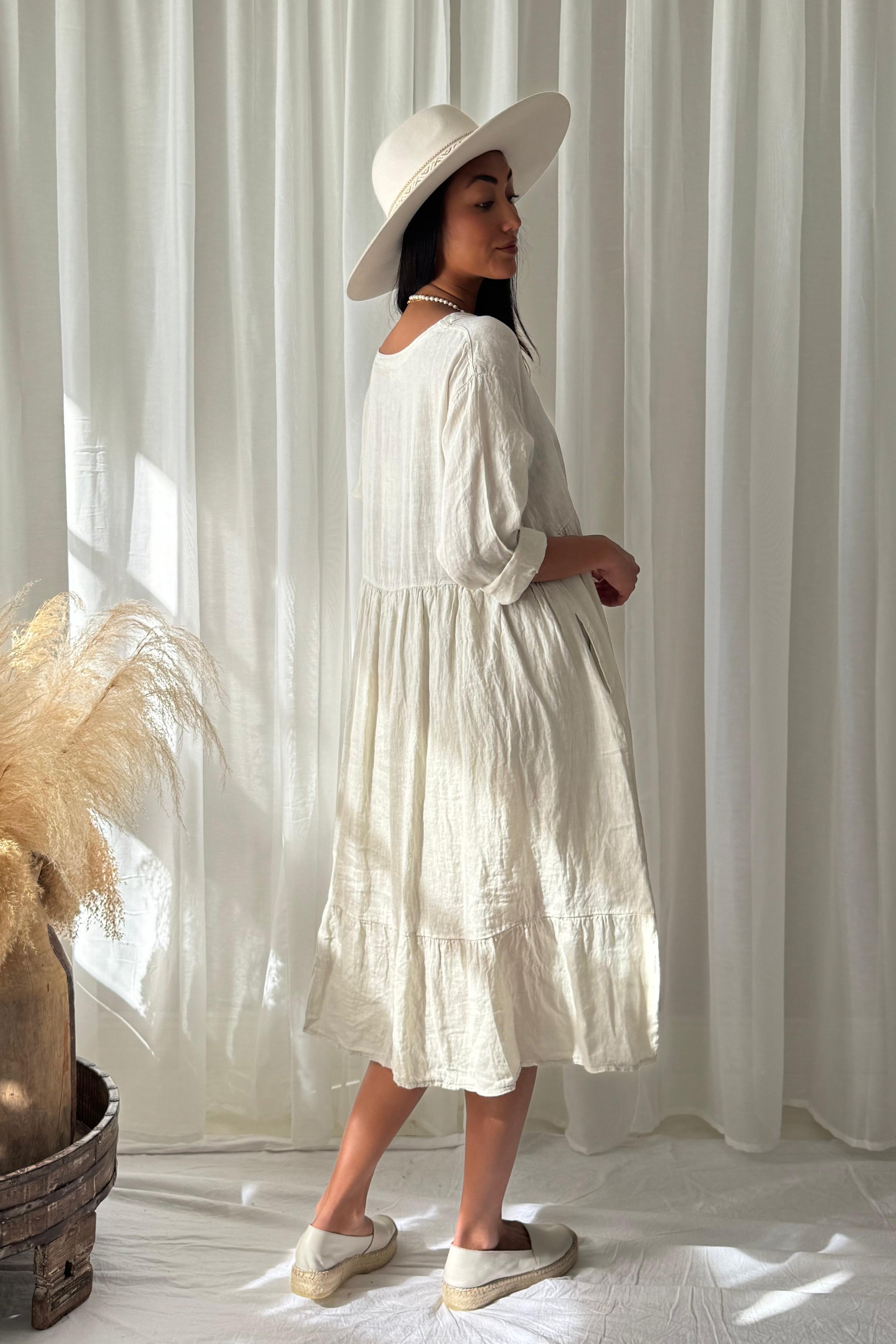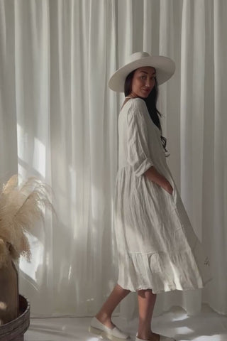 Kevyt ja ilmava pellavamekko rennolla, ja väljästi laskeutuvalla istuvuudella. Yläosan kaunis rypytys tuo ilmeeseen pehmeyttä ja elävyyttä, ja V-pääntie viimeistelee naisellisen, kevyen siluetin. Kerrostettu helma, sekä puolipitkät hihat.