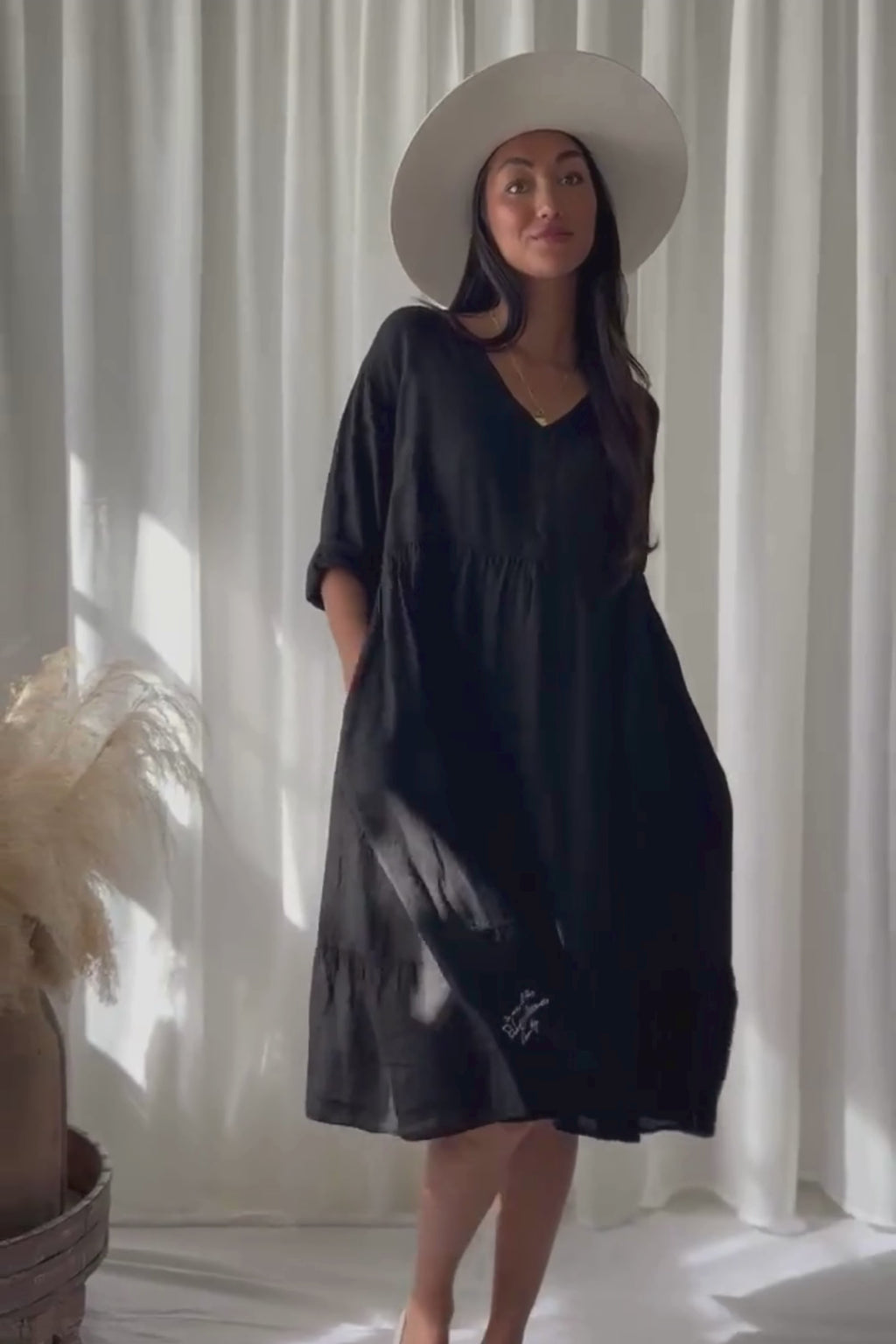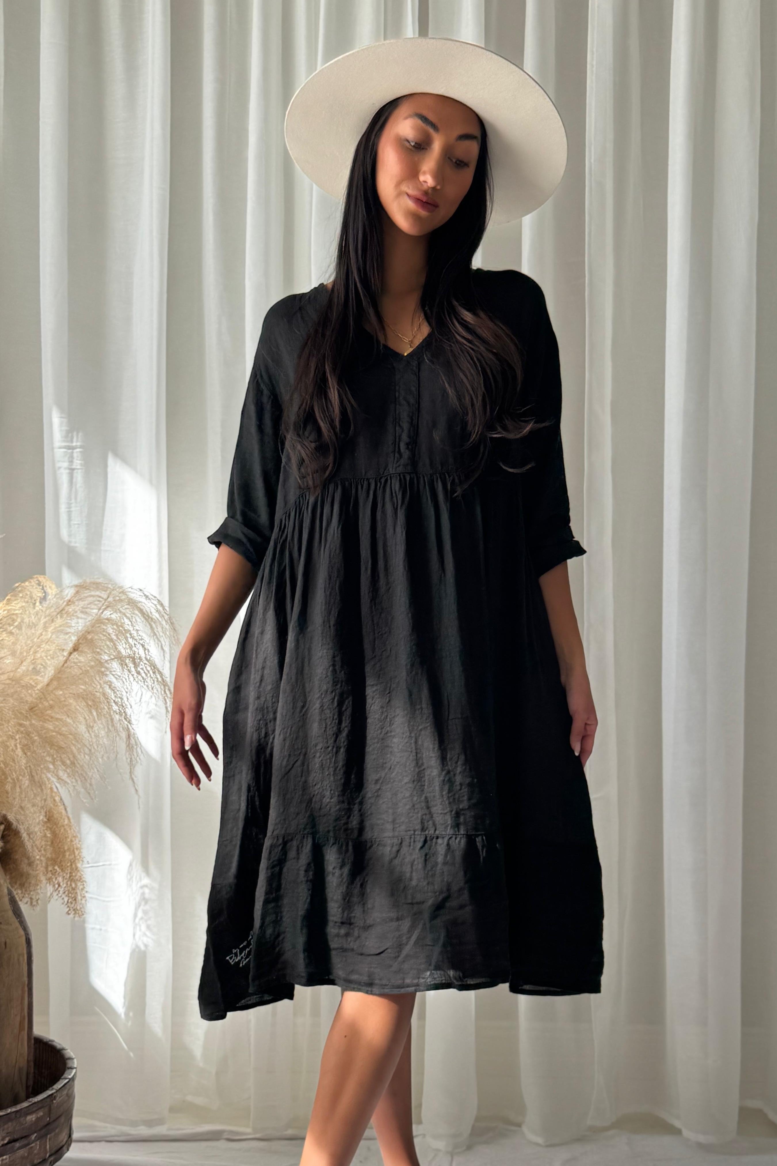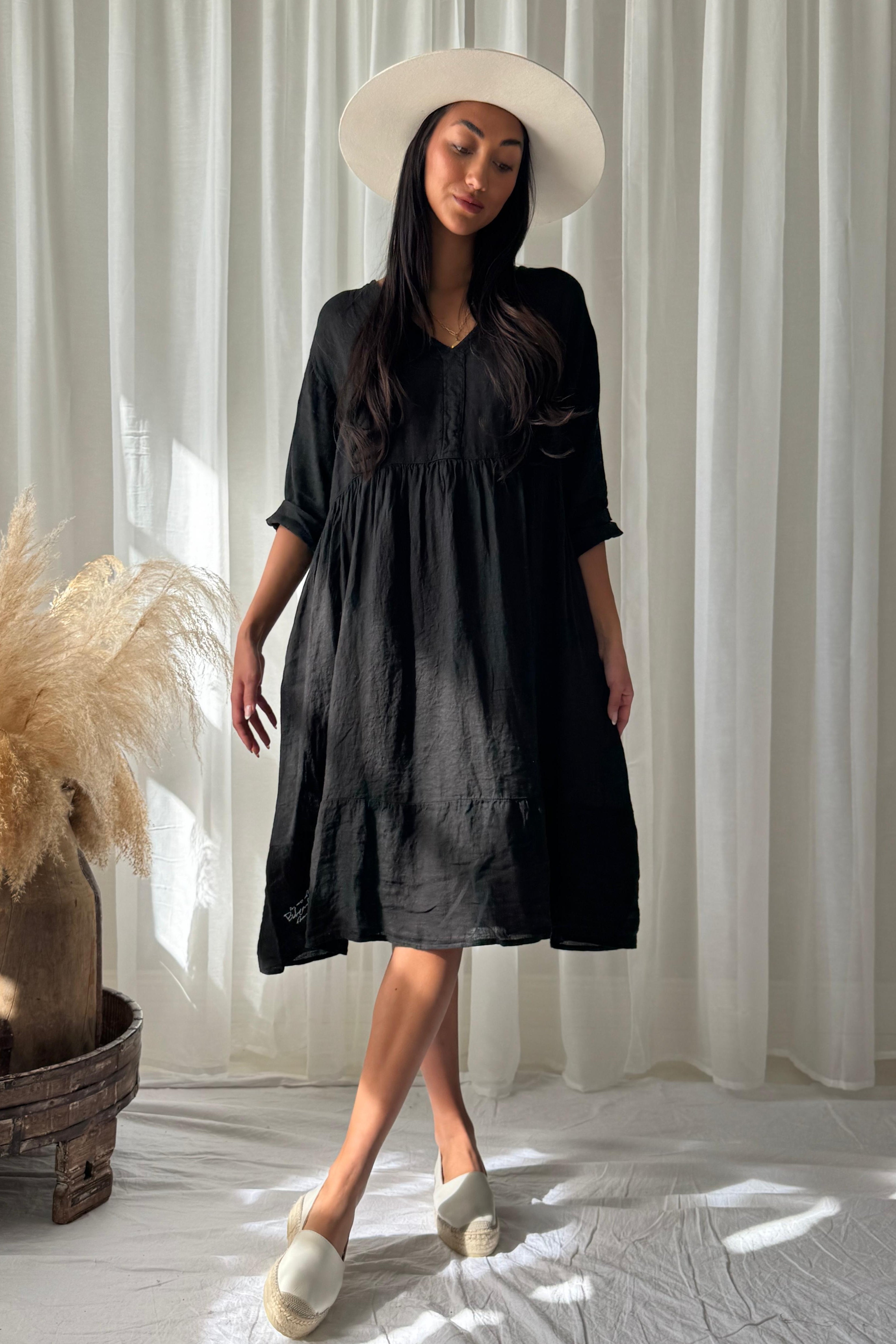 Kevyt ja ilmava pellavamekko rennolla, ja väljästi laskeutuvalla istuvuudella. Yläosan kaunis rypytys tuo ilmeeseen pehmeyttä ja elävyyttä, ja V-pääntie viimeistelee naisellisen, kevyen siluetin. Kerrostettu helma, sekä puolipitkät hihat.