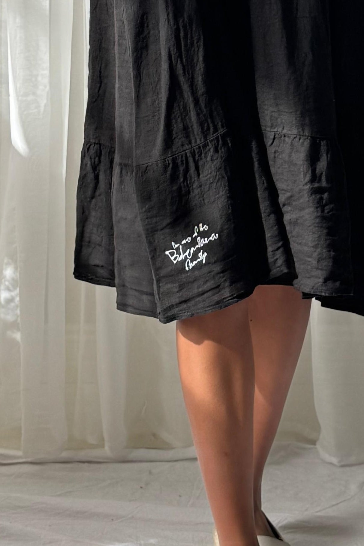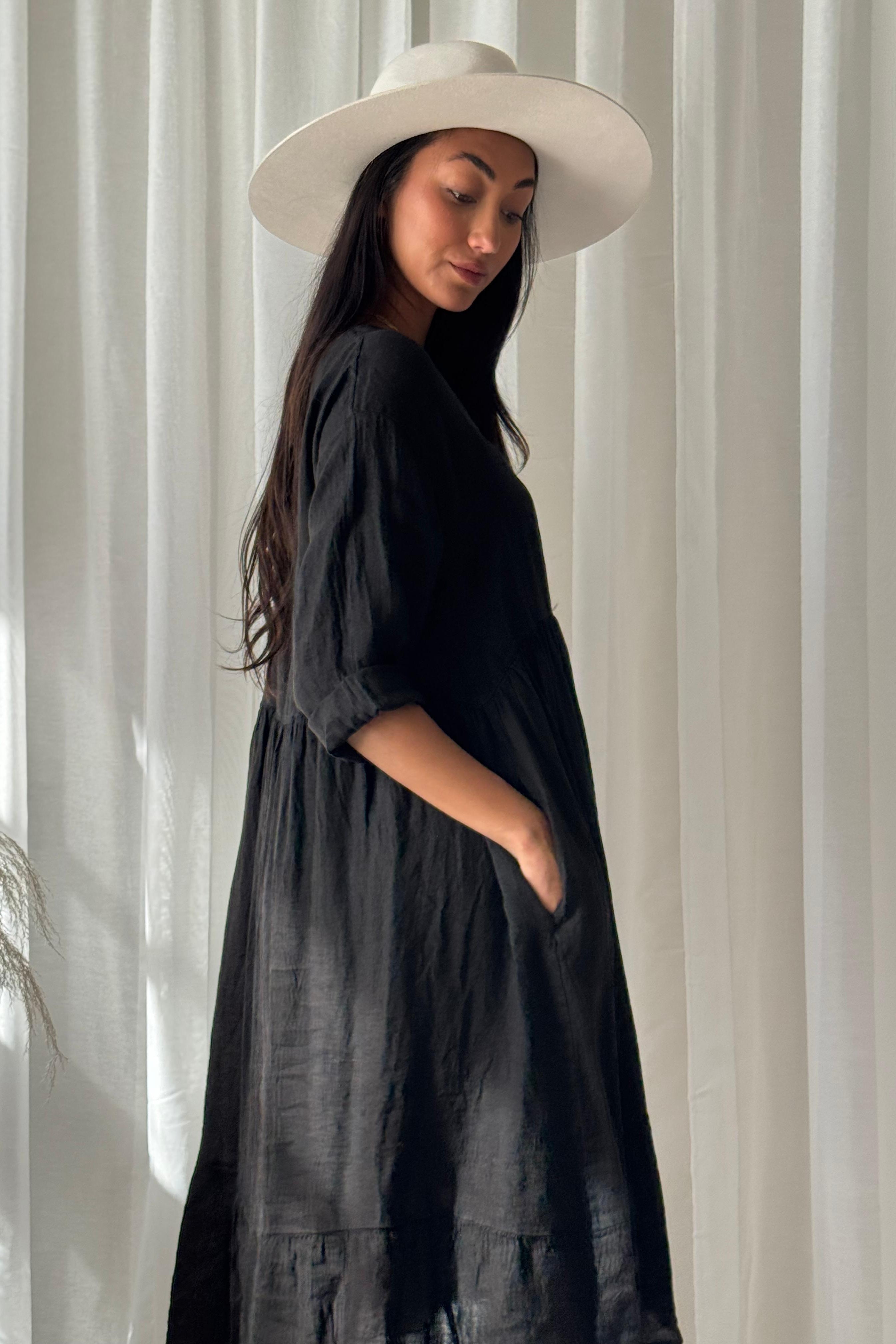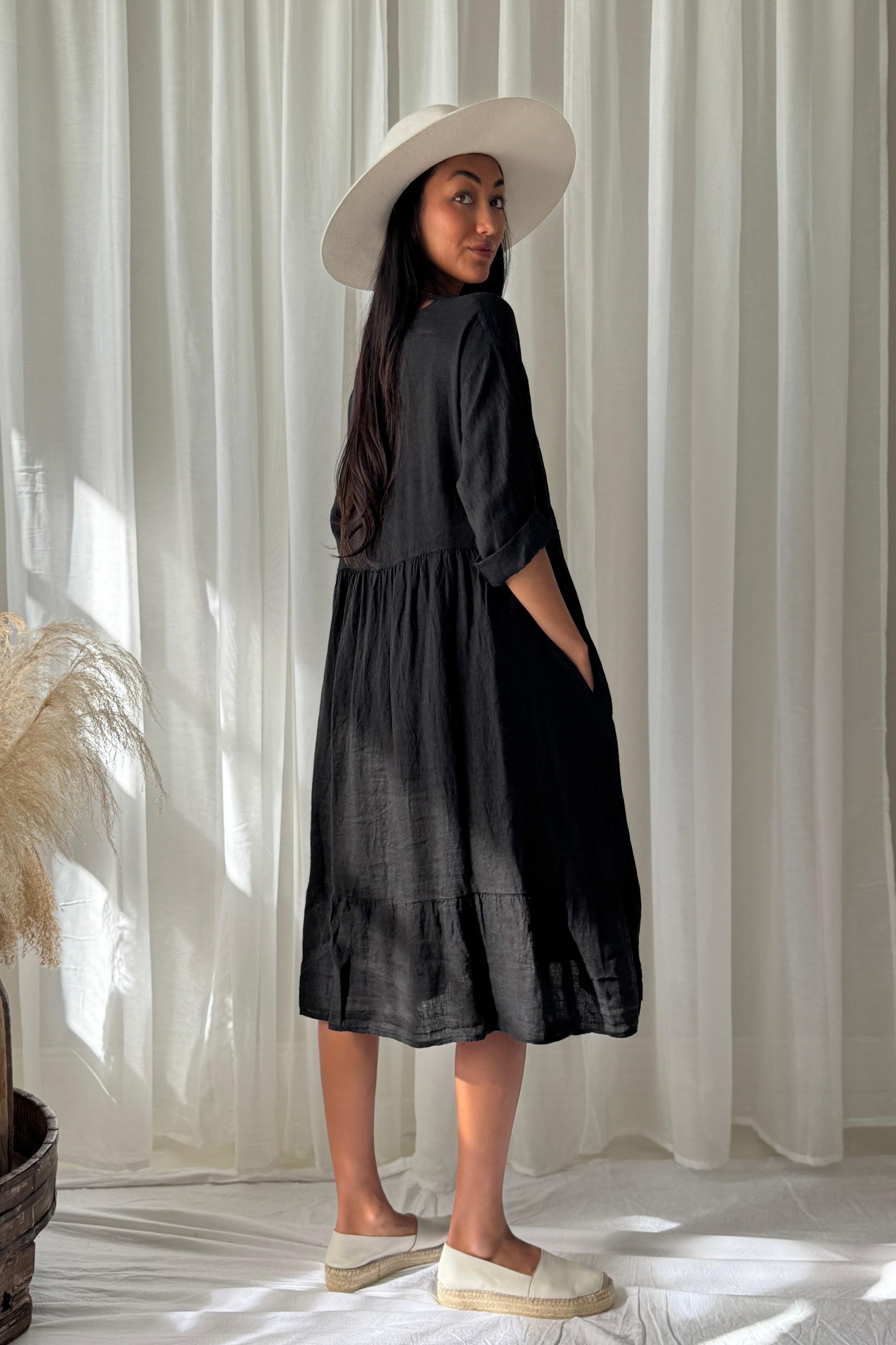 Kevyt ja ilmava pellavamekko rennolla, ja väljästi laskeutuvalla istuvuudella. Yläosan kaunis rypytys tuo ilmeeseen pehmeyttä ja elävyyttä, ja V-pääntie viimeistelee naisellisen, kevyen siluetin. Kerrostettu helma, sekä puolipitkät hihat.