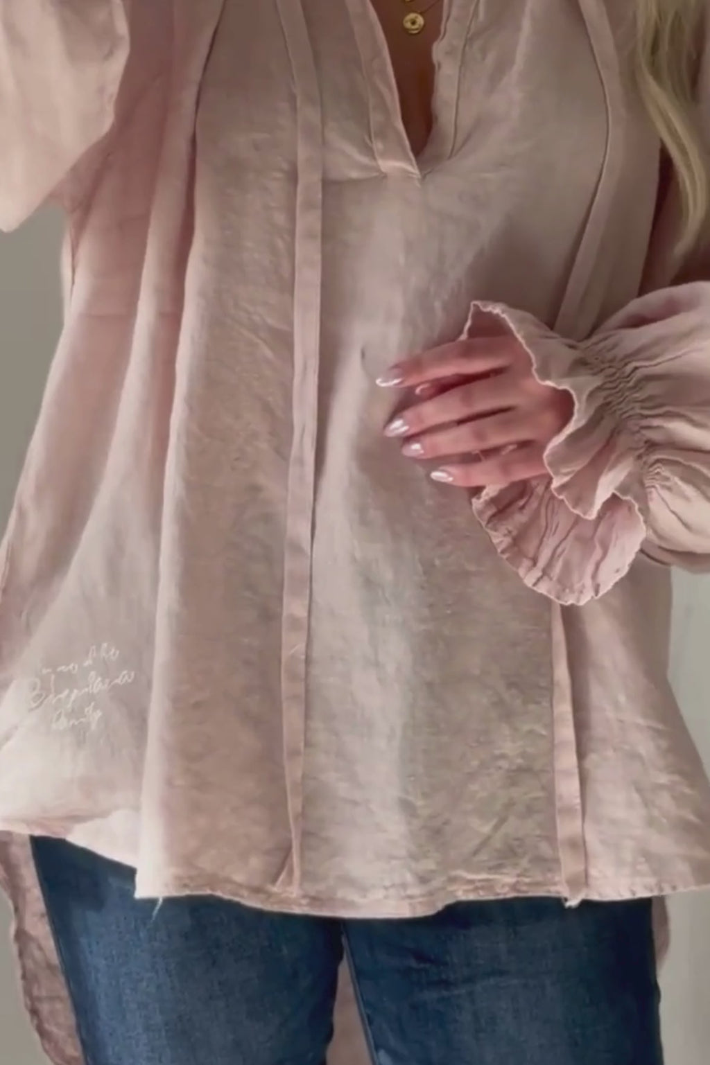 Upea, runsaslinjainen pellavapaita pystykauluksella ja täyspitkillä hihoilla. Kauniit röyhelöt kauluksessa ja hihansuissa sekä solmittava nyöri pääntiessä. Hihoissa joustorypytys. Väljä, rento malli, jonka helma on takaa pidempi kuin edestä.