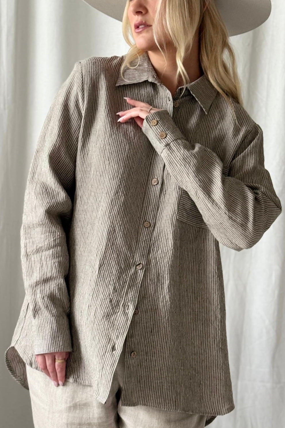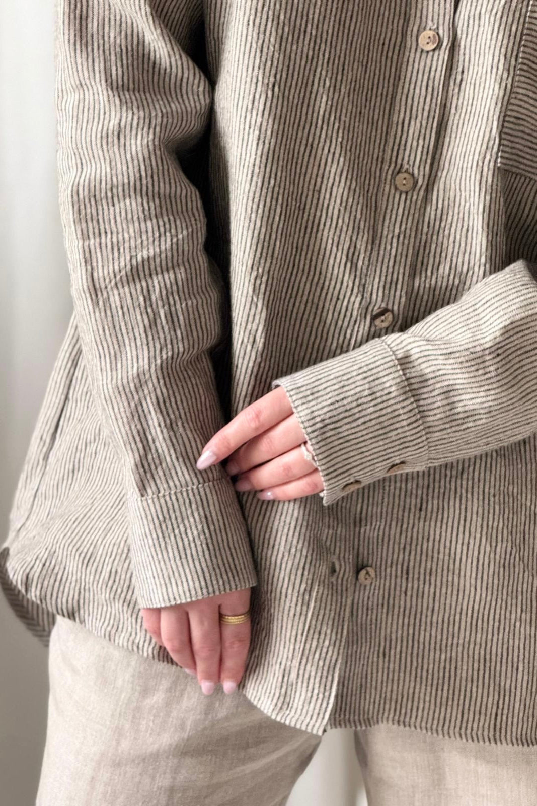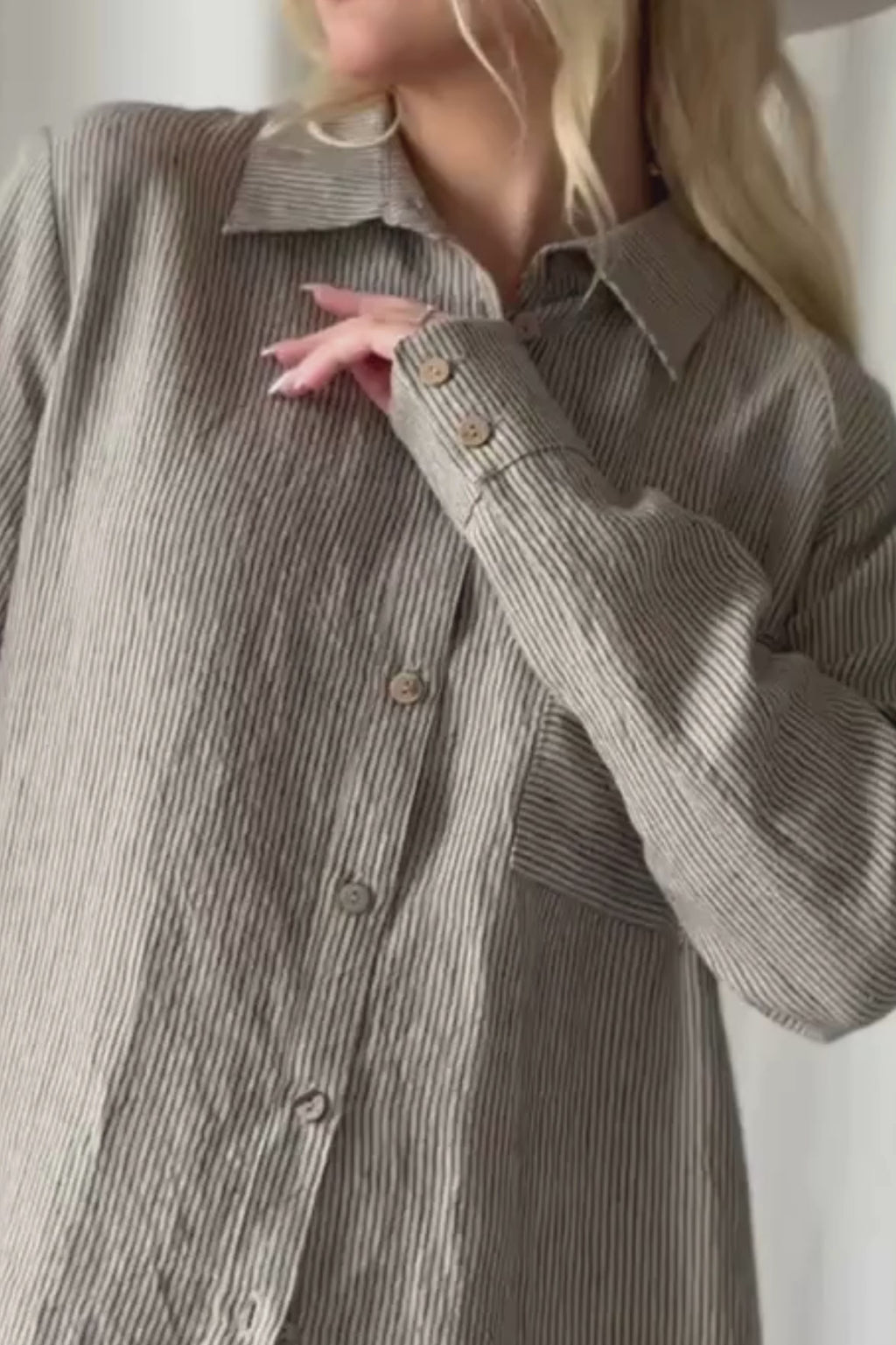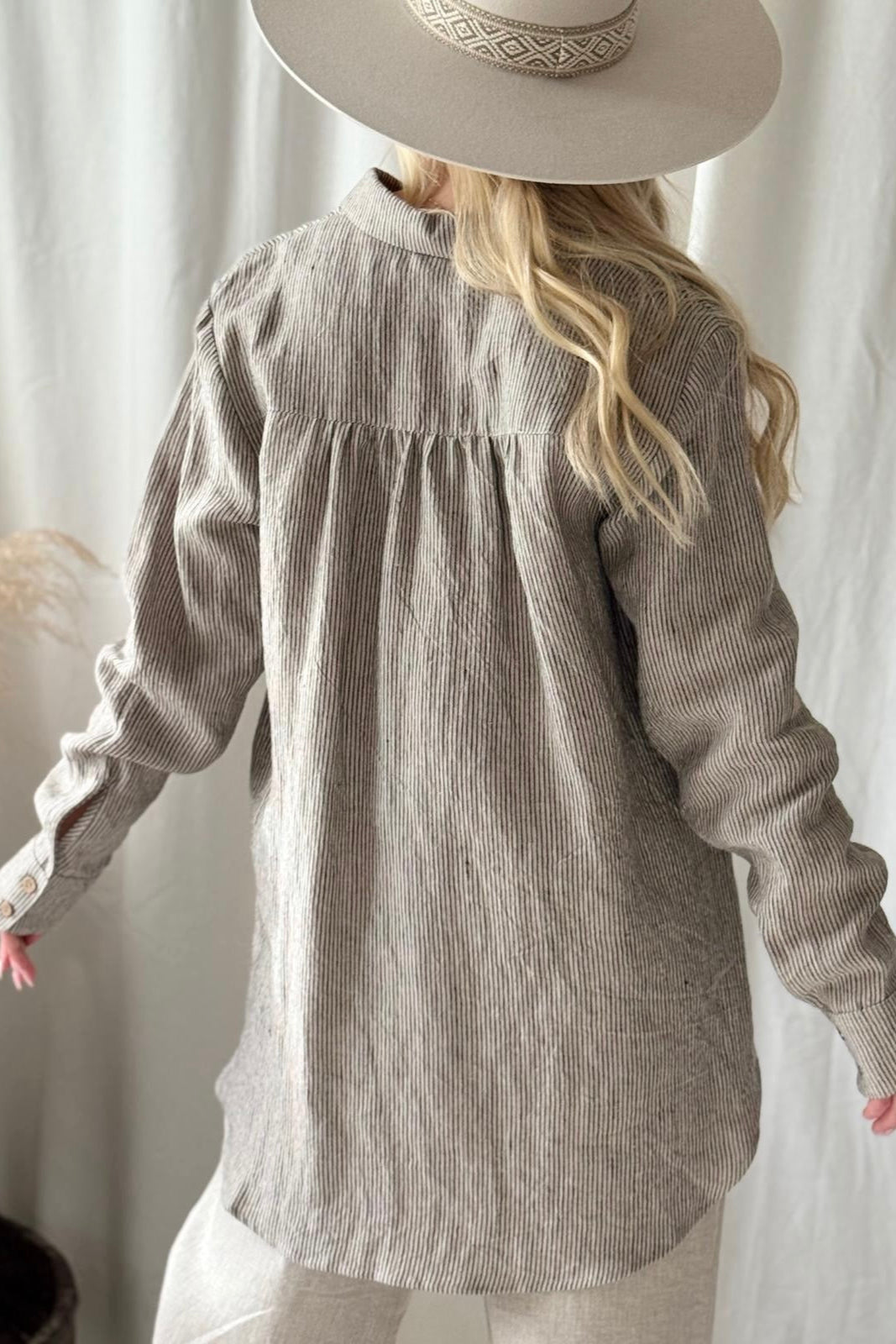 Klassinen pellavakauluspaita napituksella ja yhdellä etutaskulla. Hihoissa napitus.