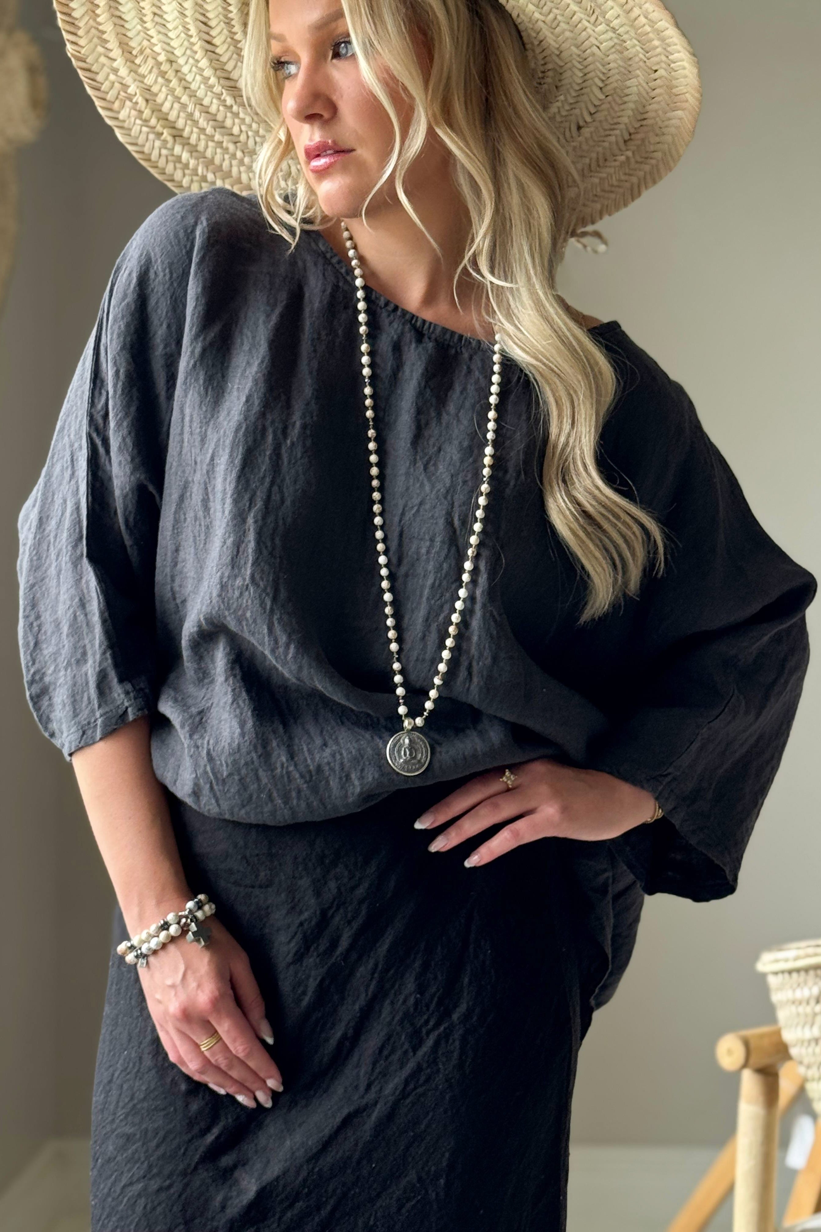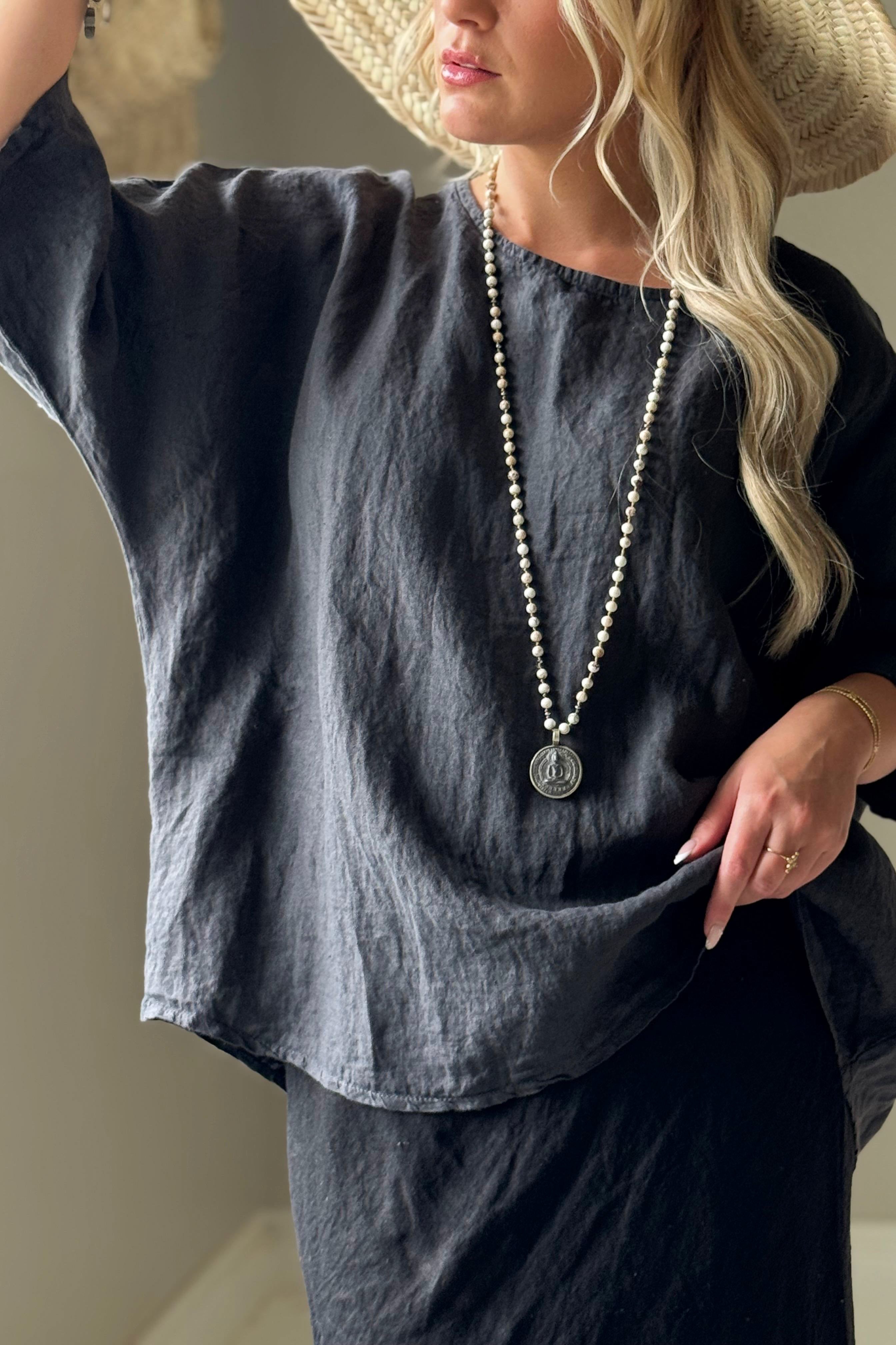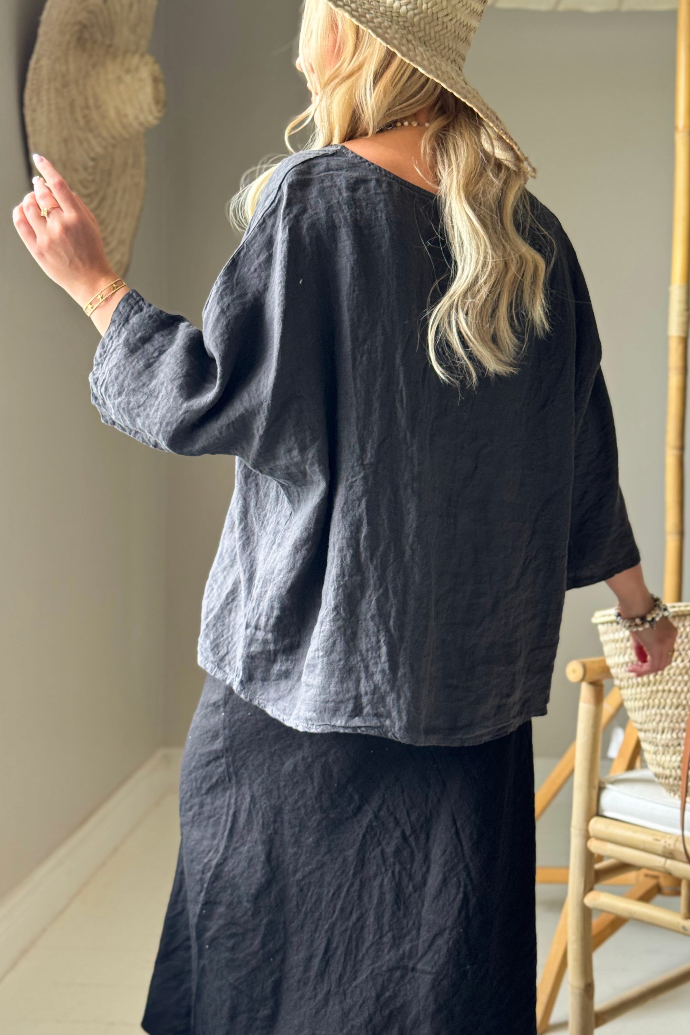 Mahtavan mallinen pellavapaita käy yläosaksi kaikkeen ja on kevyen pellavamateriaalinsa ansiosta täydellinen niin lämpimiin, kuin viileämpiin päiviin. Paita on oversize mallia, joten käy hyvin myös rintavalle.